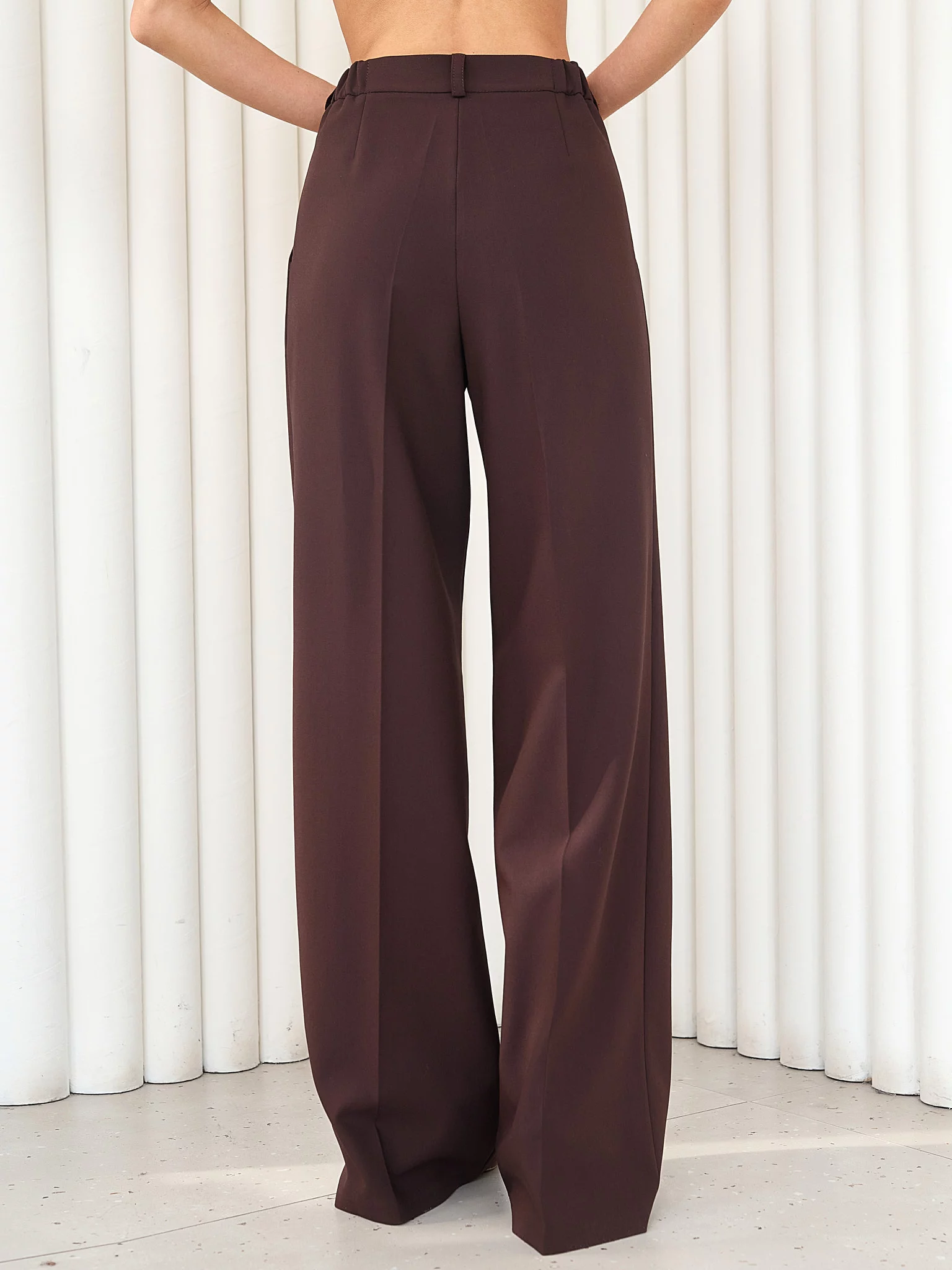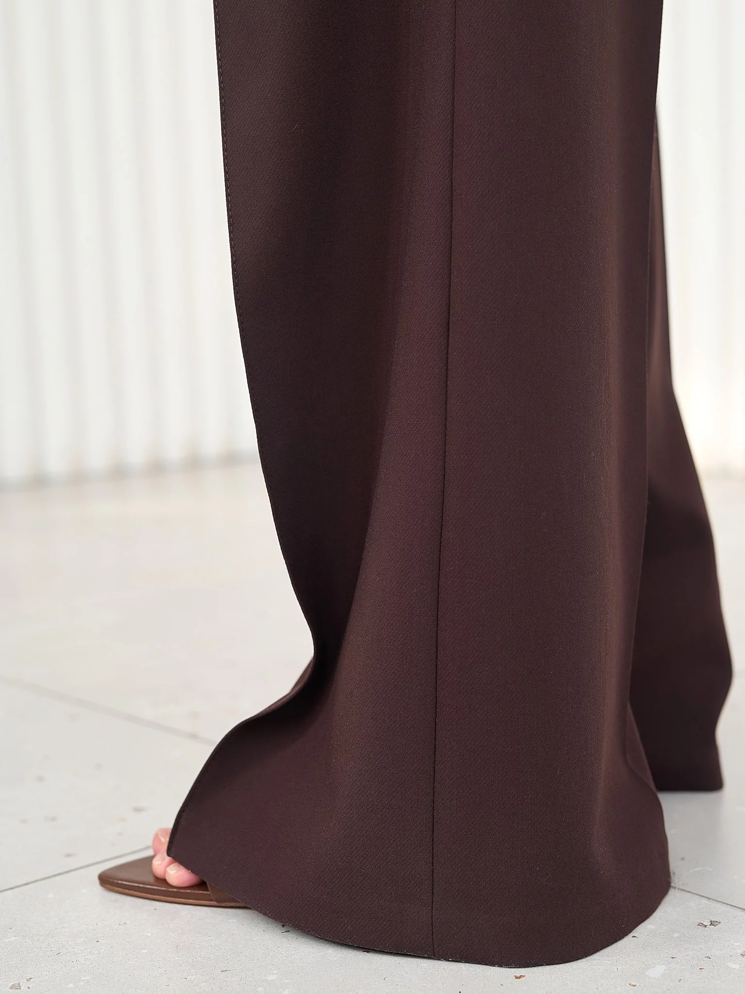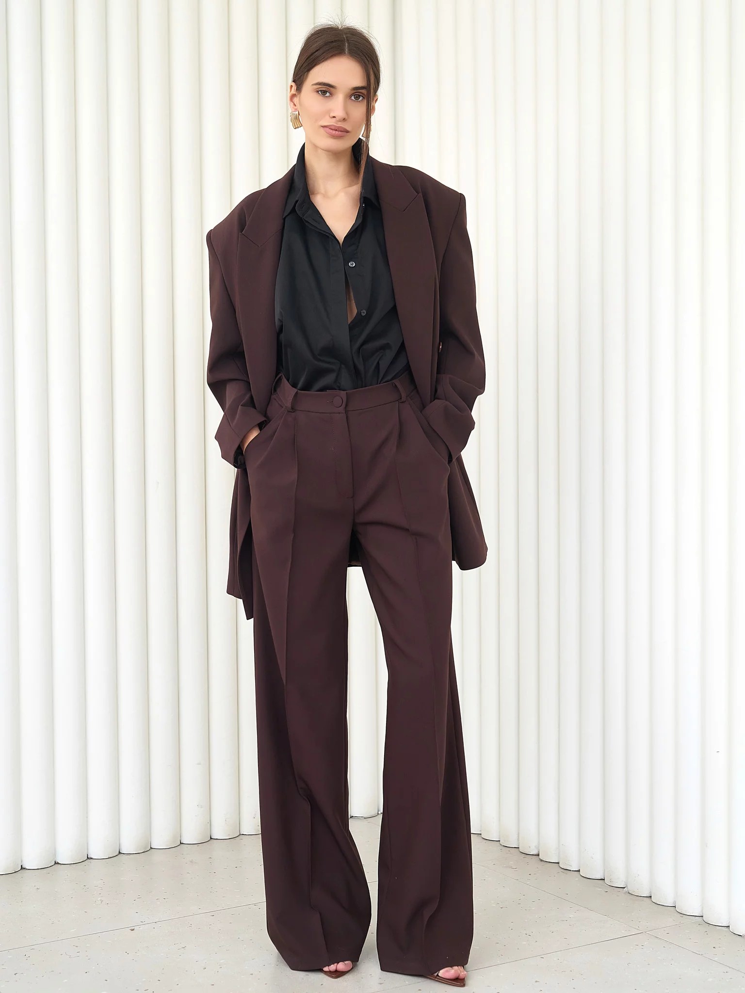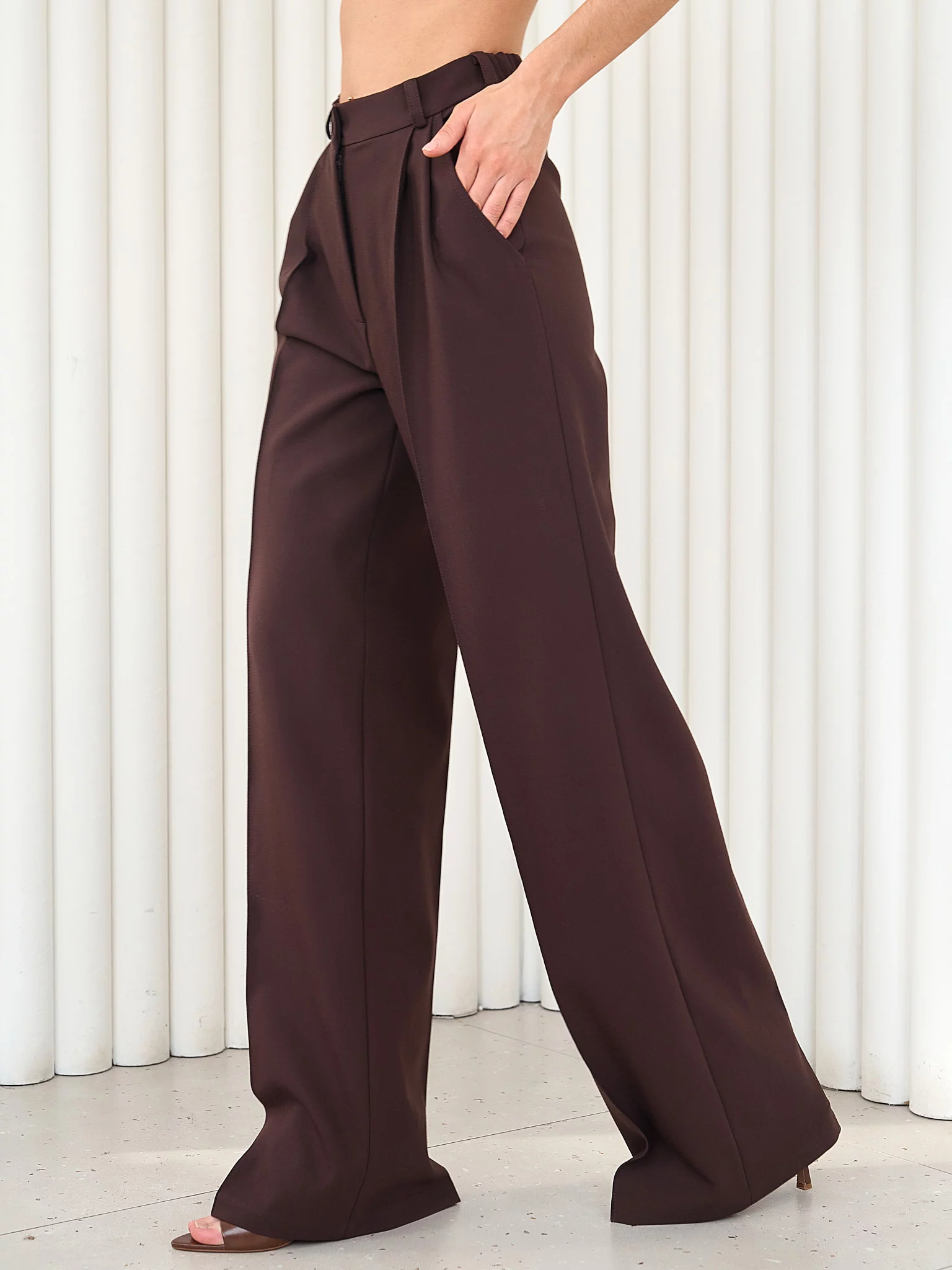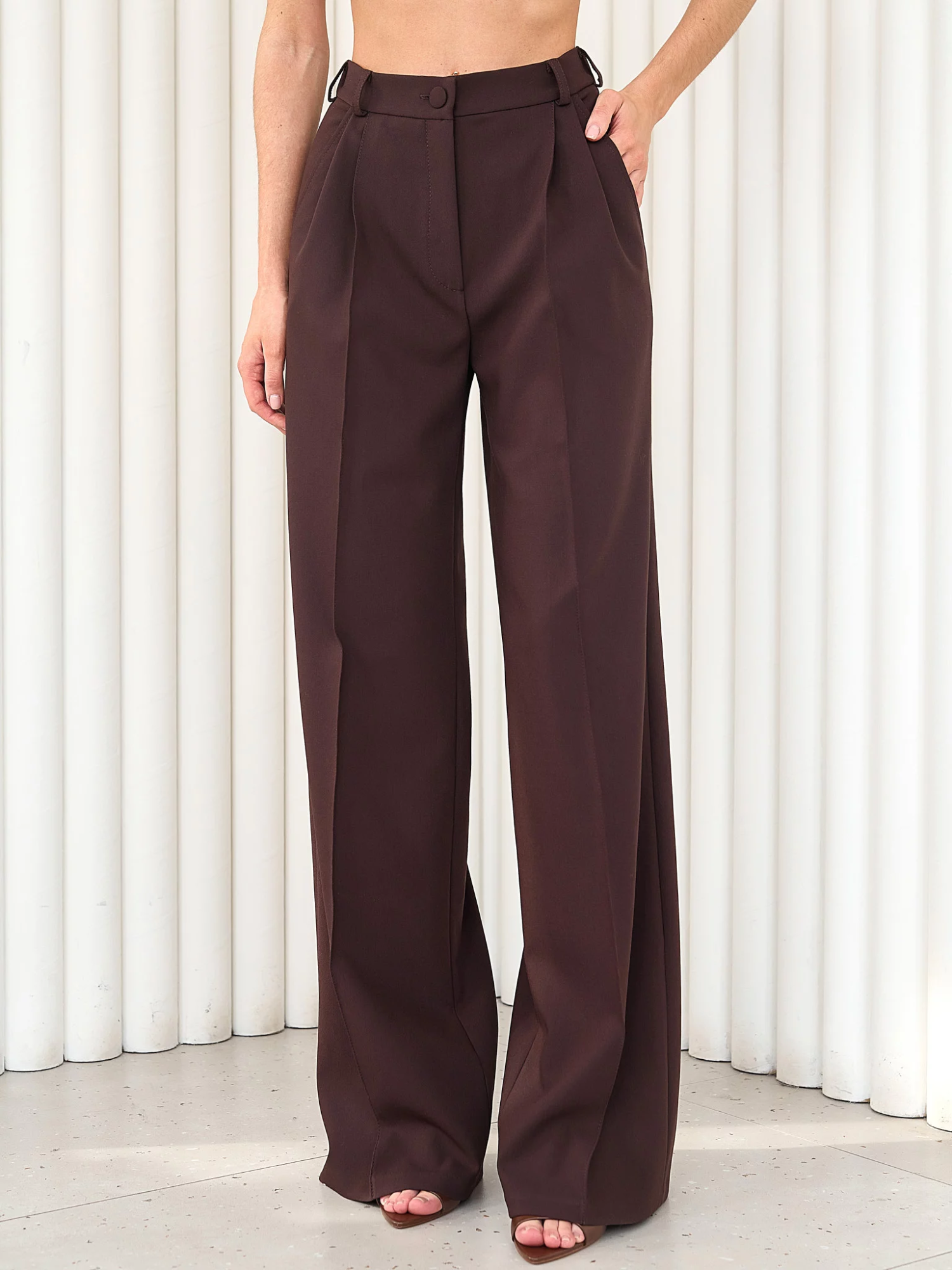 Рекомендуем носить с обувью на каблуке или платформе для правильной драпировки. Длина брюк подходит на любой рост и каблук, удобно подшивать при необходимости.