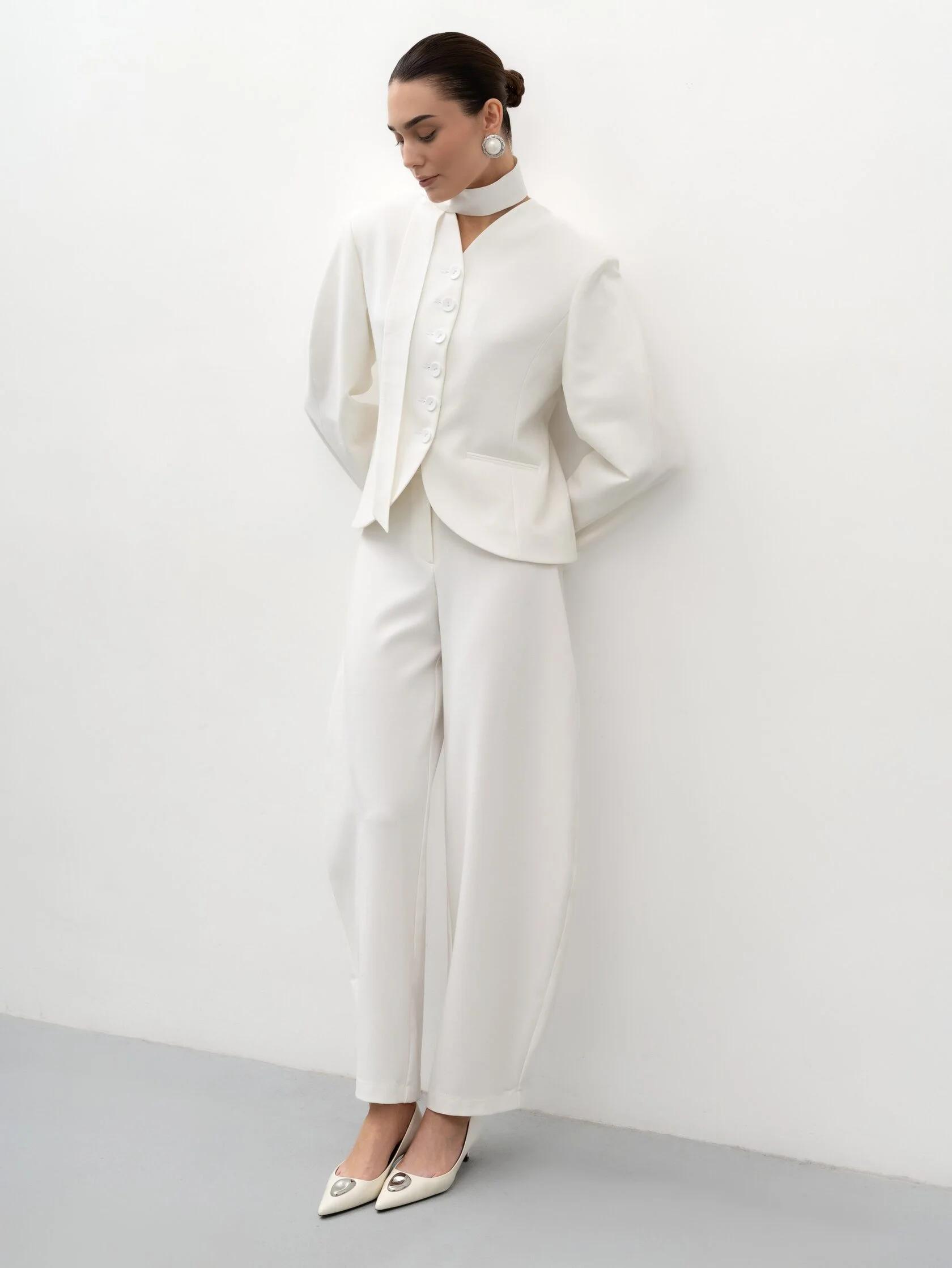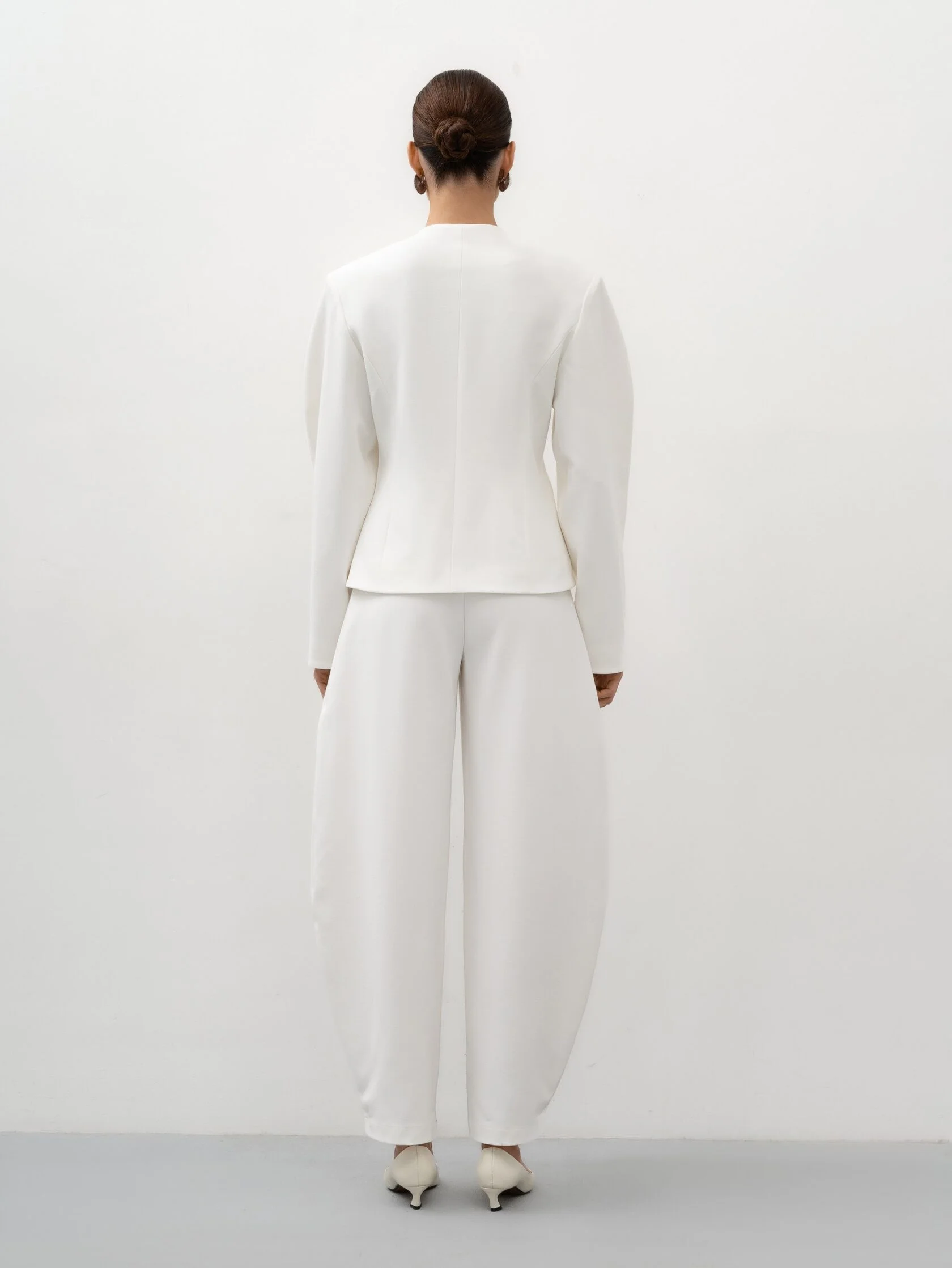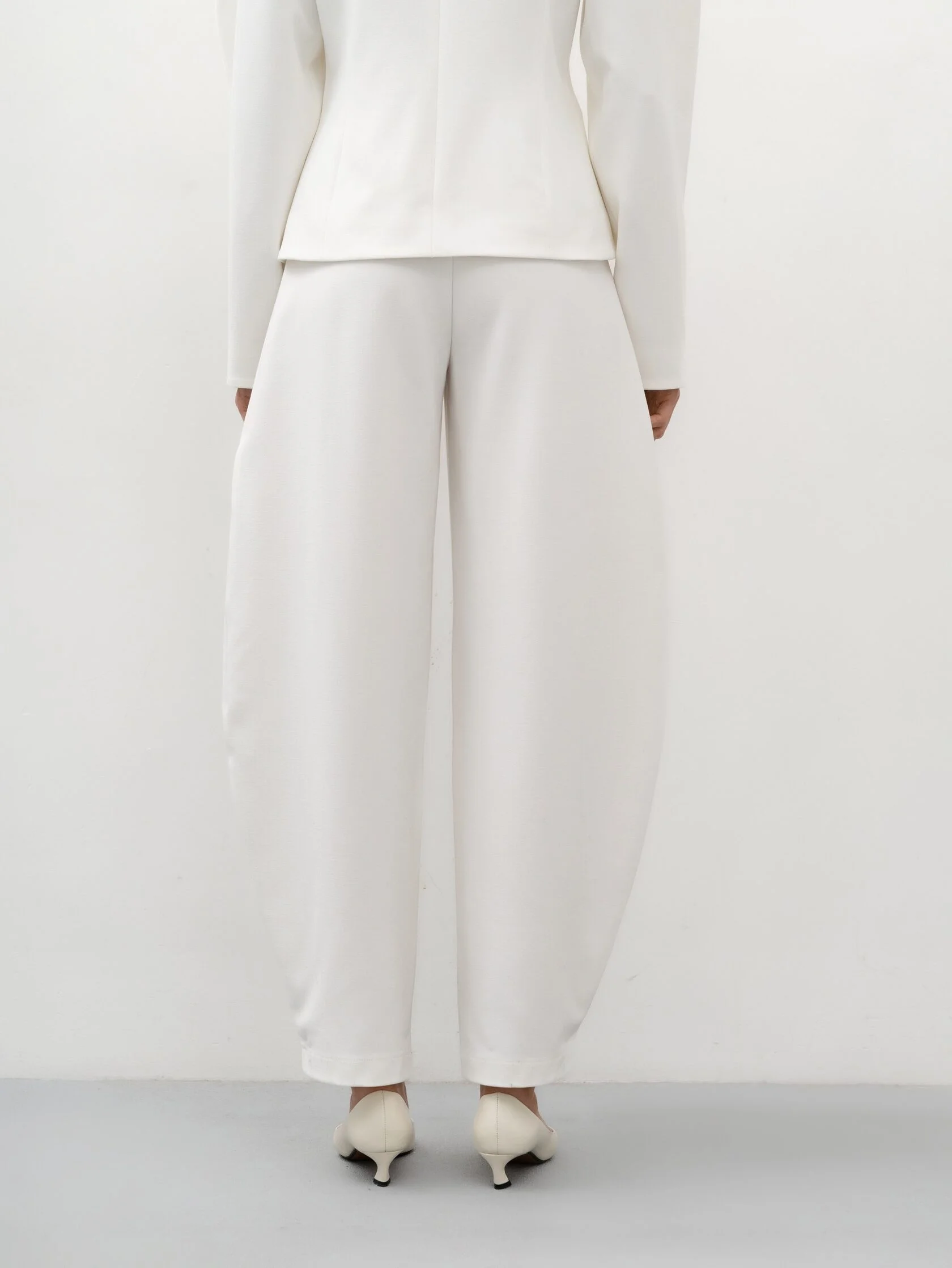 Современный крой и мягкий молочный оттенок делают модель универсальной: такие брюки смотрятся элегантно в деловых образах и легко адаптируются для более расслабленных сочетаний, когда хочется выглядеть сдержанно, но стильно.