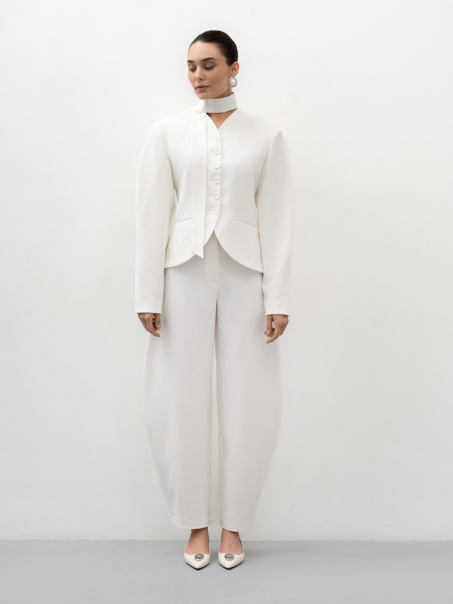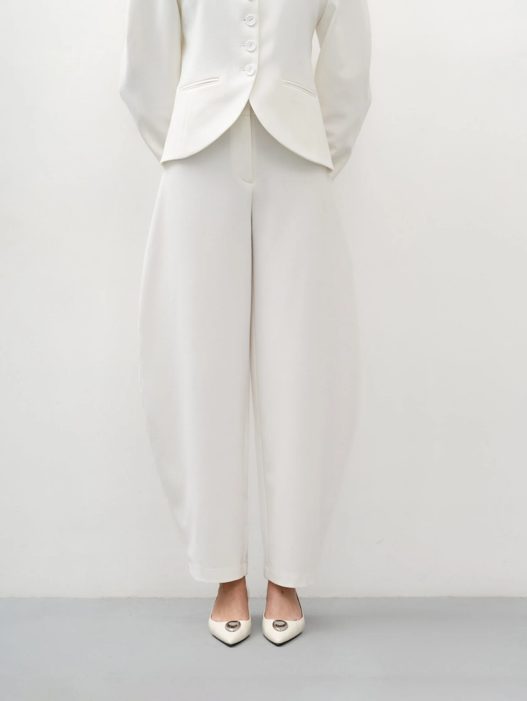 Брюки-бананы — стильная интерпретация классического силуэта. Они гармонично дополняют жакет Madame из этой же коллекции, создавая выразительный женственный костюм, а по отдельности легко сочетаются с блузами, рубашками или трикотажем.