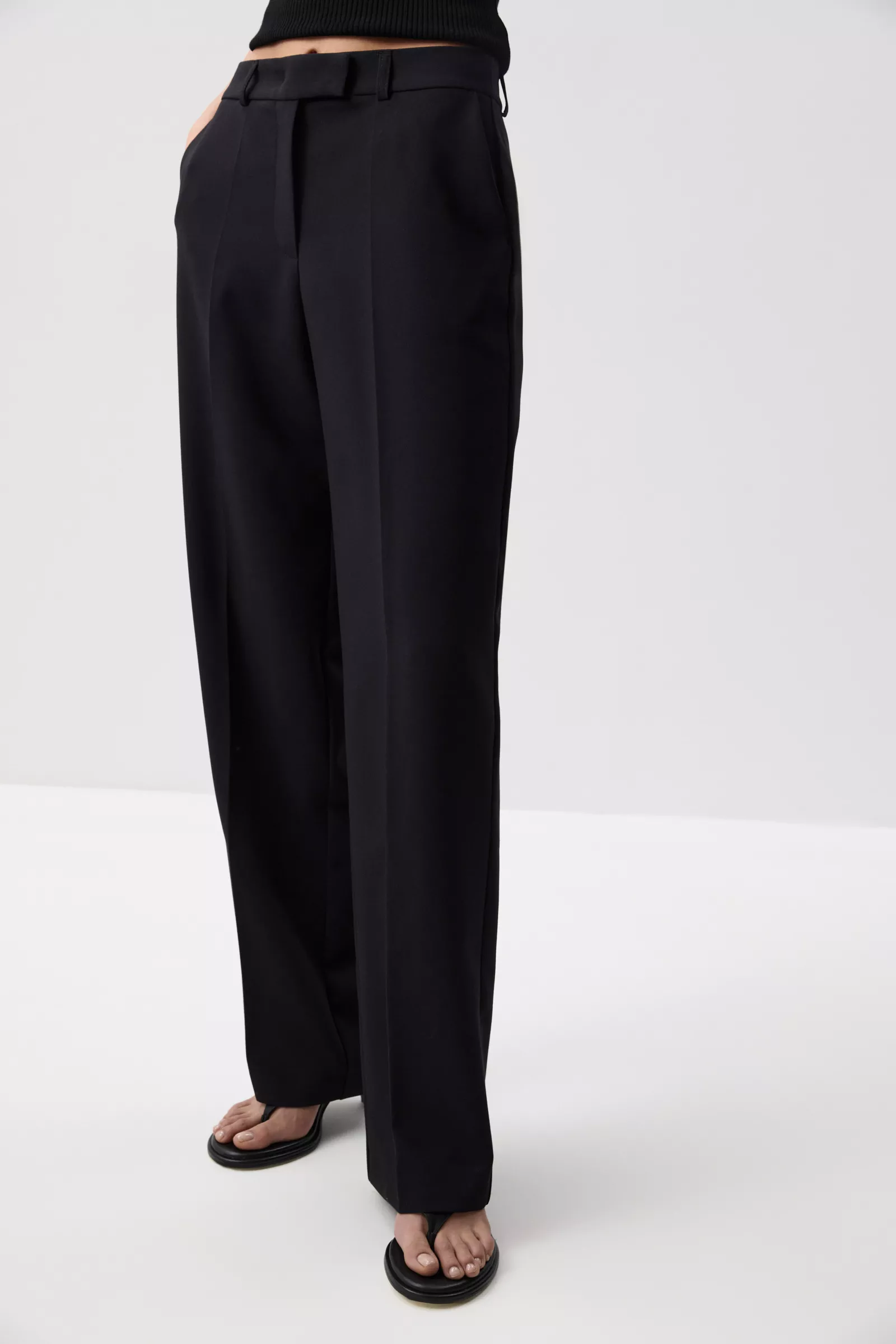 Прямые свободные брюки со стрелками из костюмной ткани. Идеальная база для стильных и продуманных образов. Модель с мягкой струящейся посадкой красиво вытягивает фигуру, создавая элегантную вертикаль за счет заутюженных стрелок. Застежка на потайную пуговицу и крючок.