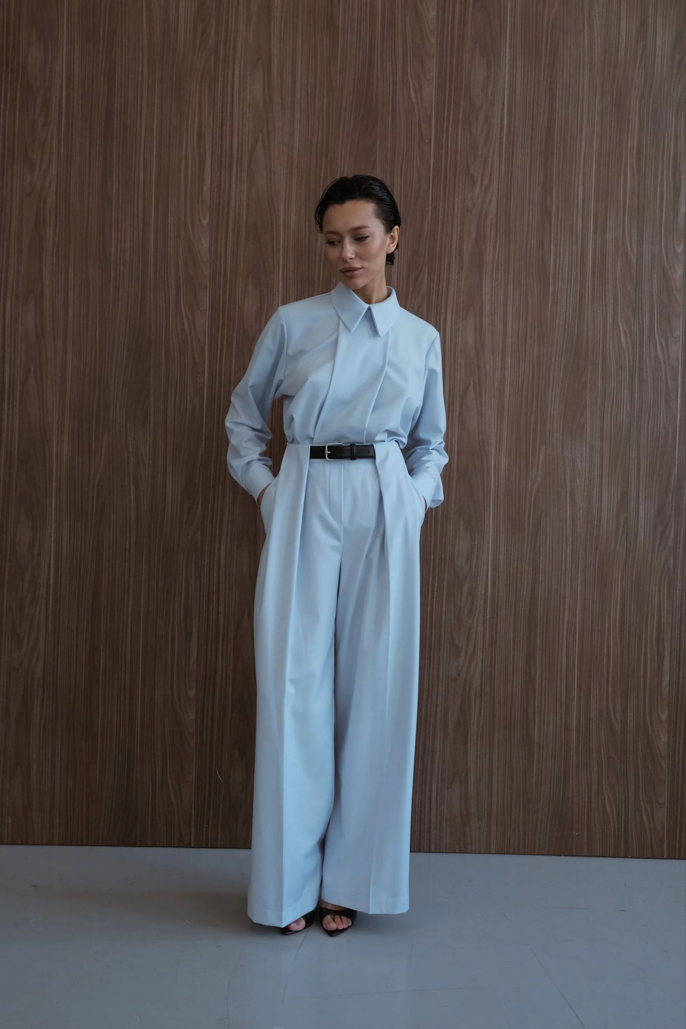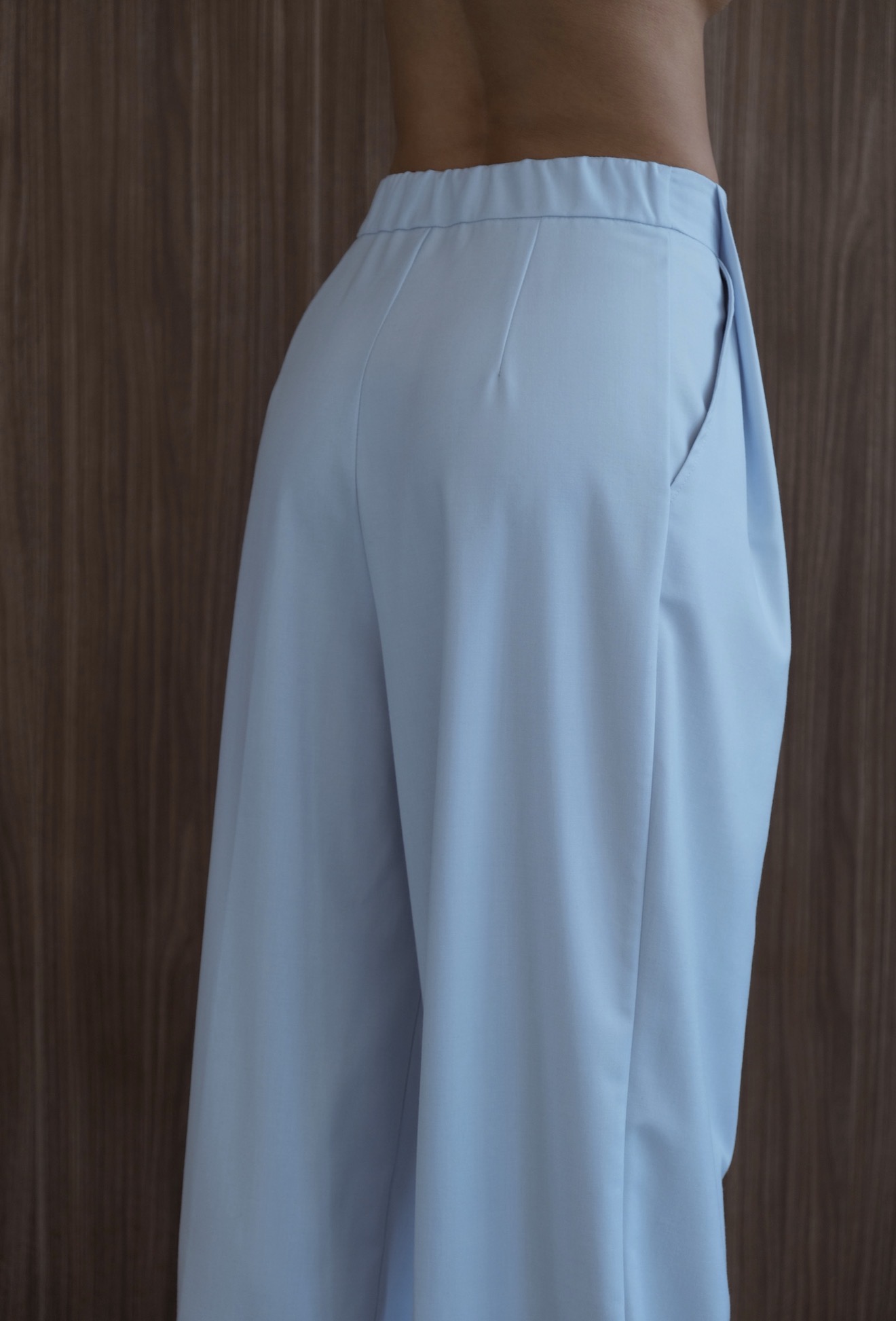 Брюки на высокой посадке из классической костюмной ткани со стрелками. В пояс вставлена резинка, для комфортной носки, на полочке две складки. Элегантный и практичный вариант для повседневных образов.
