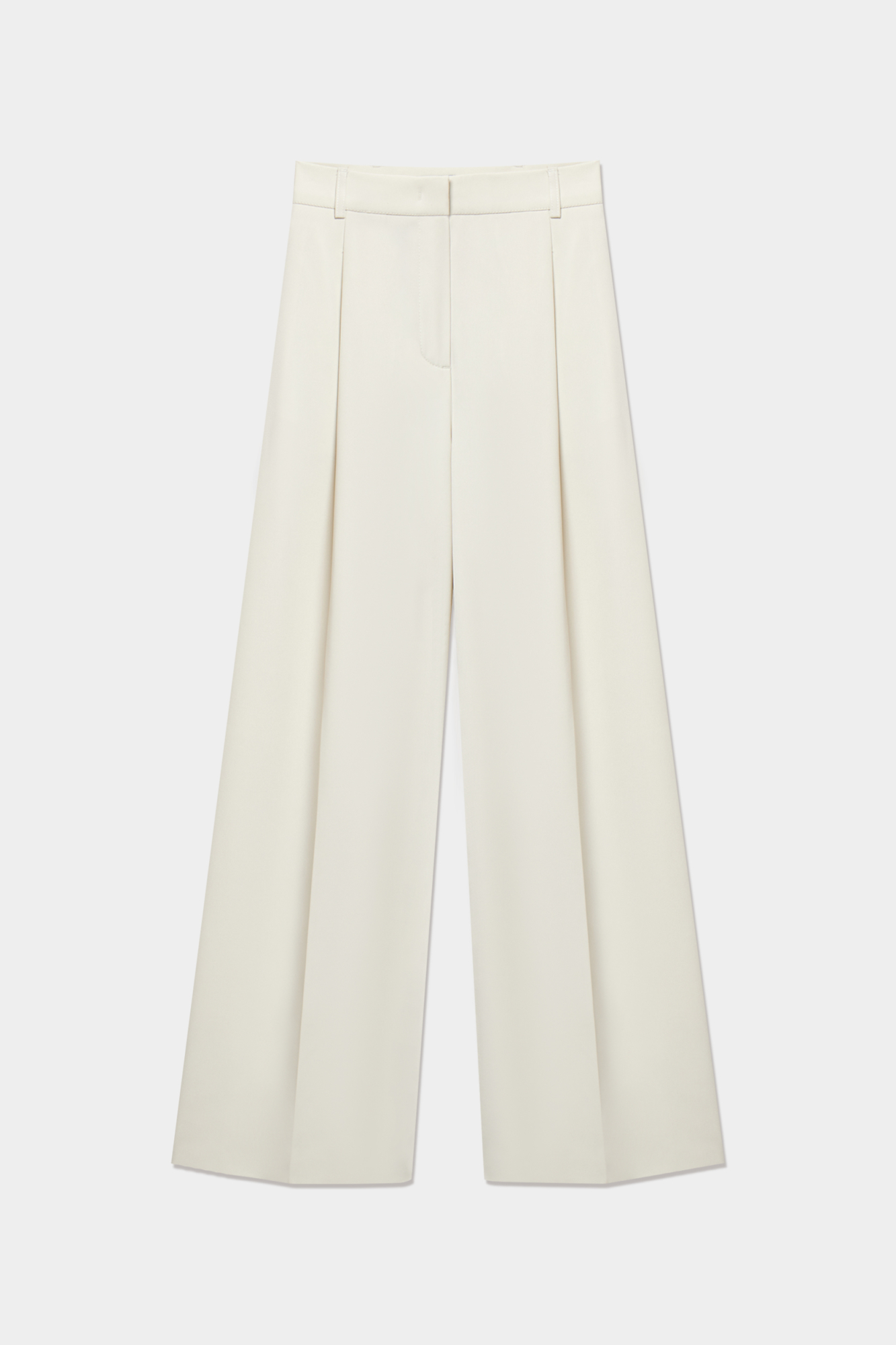 Благодаря складкам брюки выглядят элегантно и аккуратно, подчёркивая фигуру. Молочный цвет придаёт образу нежность и лёгкость, делая его универсальным для различных ситуаций.