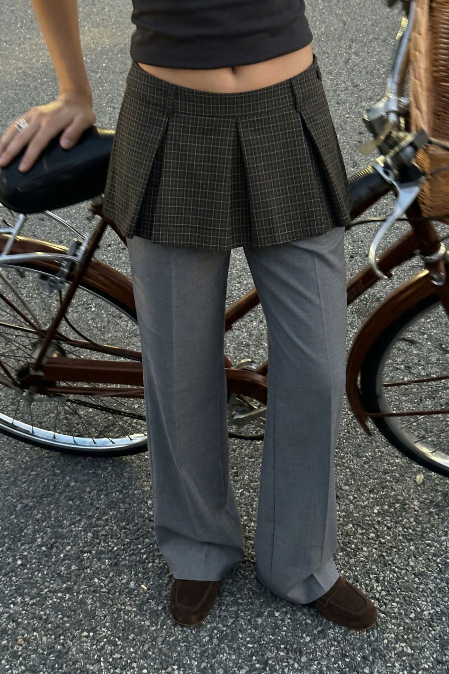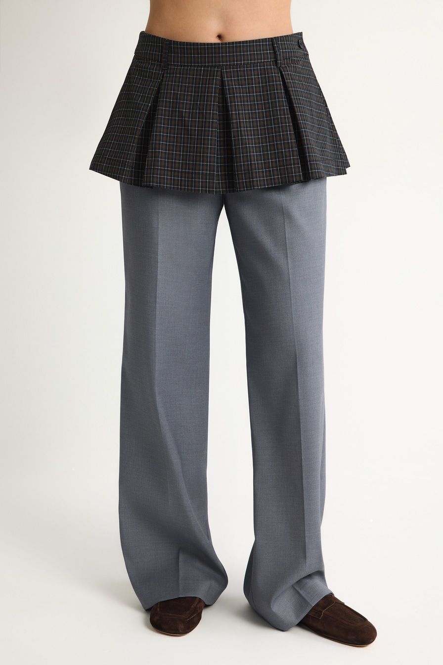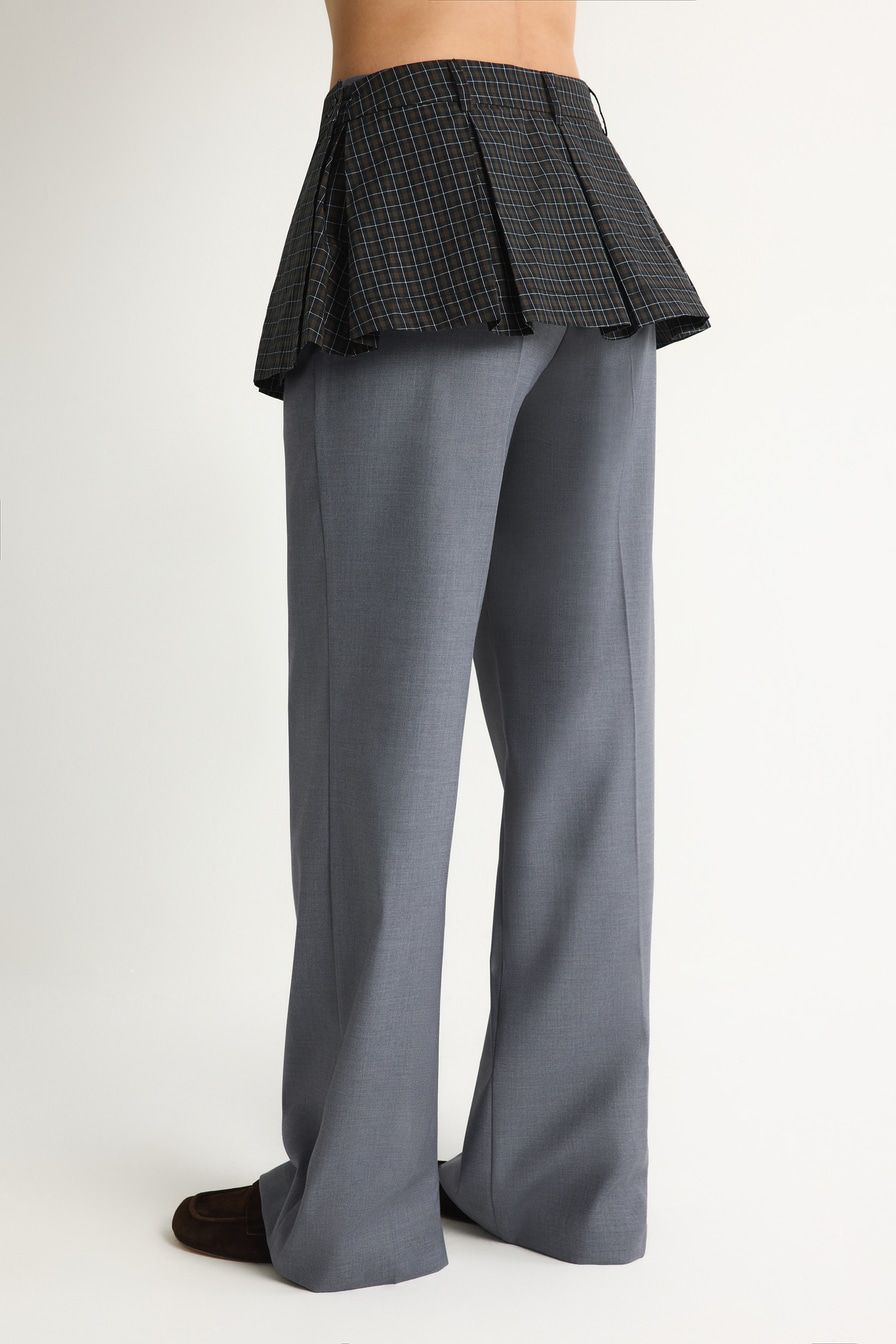 Серые брюки из смесовой вискозы – модель прямого кроя со стрелками. Брюки дополнены юбкой-баской, декорированной принтом «клетка».
