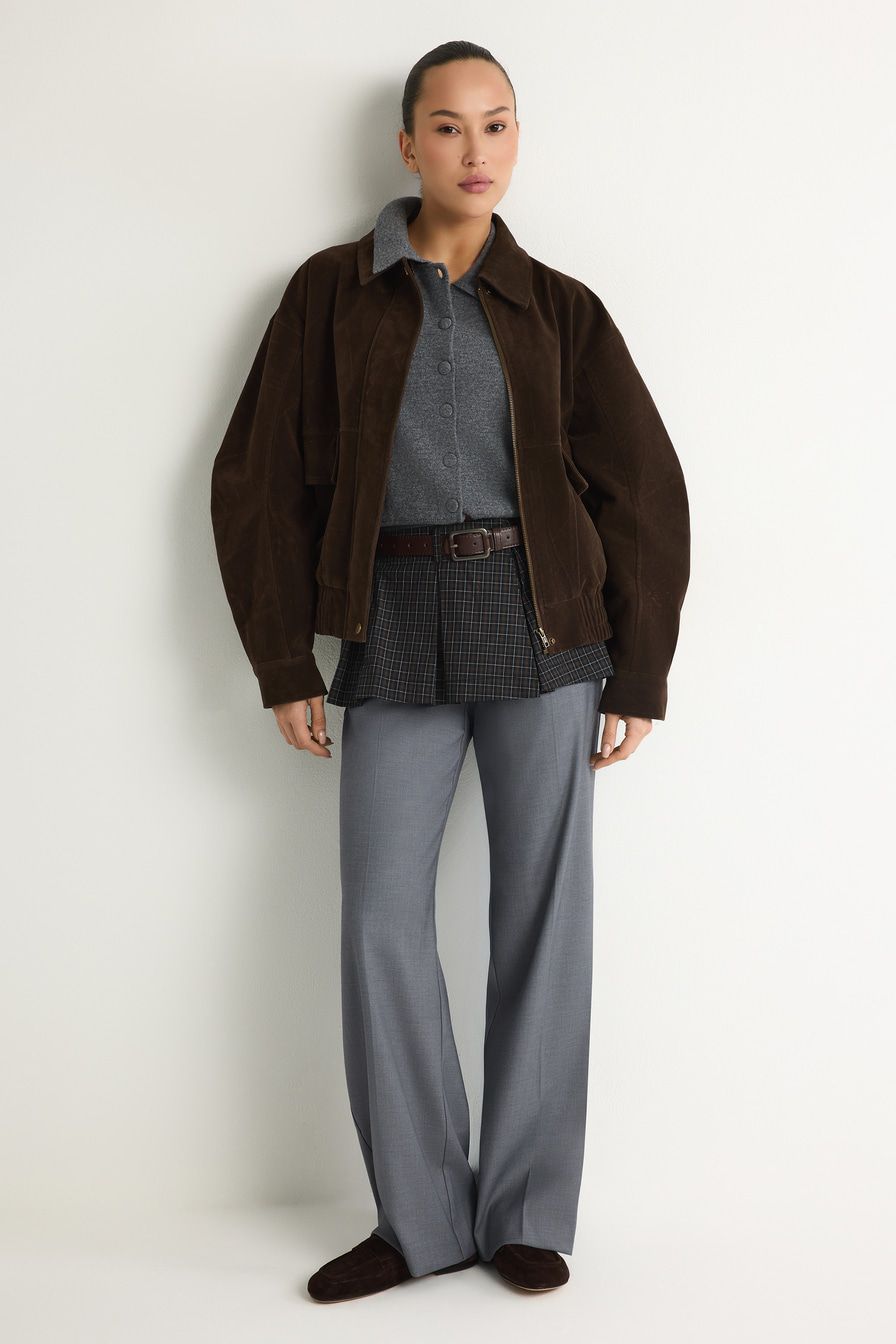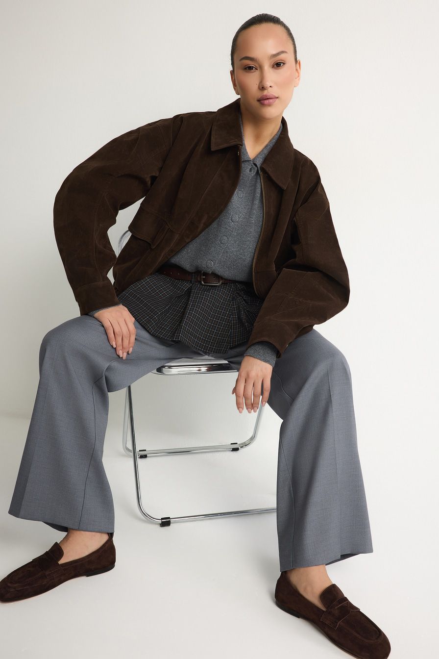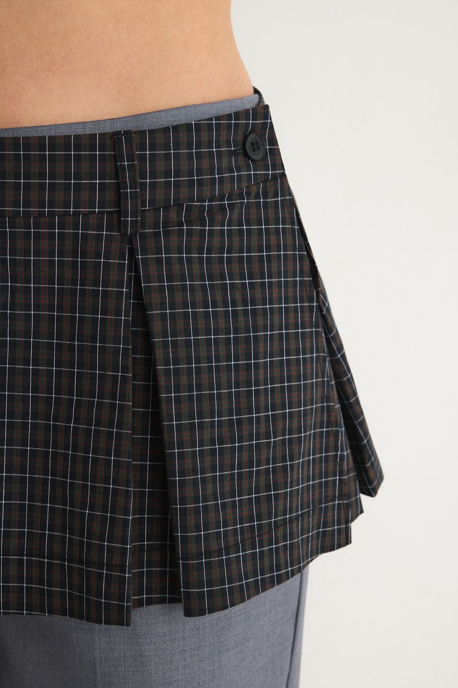 Серые брюки из смесовой вискозы – модель прямого кроя со стрелками. Брюки дополнены юбкой-баской, декорированной принтом «клетка».
