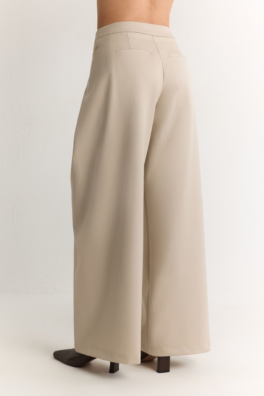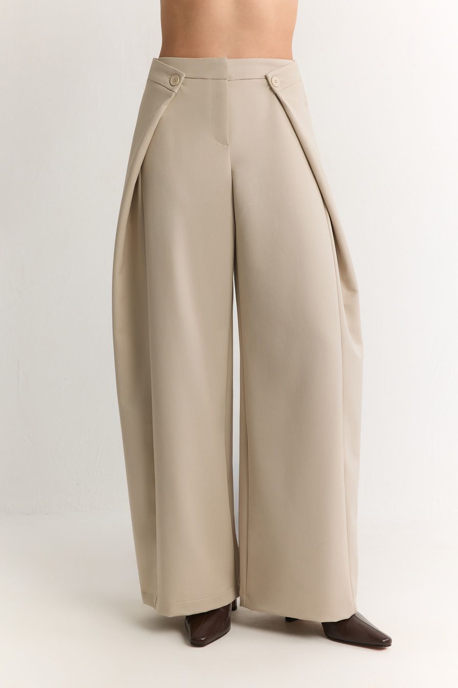 Широкие молочные брюки выполнены из смесовой ткани с добавлением района – материала на основе целлюлозы. Модель дополнена защипами на поясе с застежкой на пуговицы.