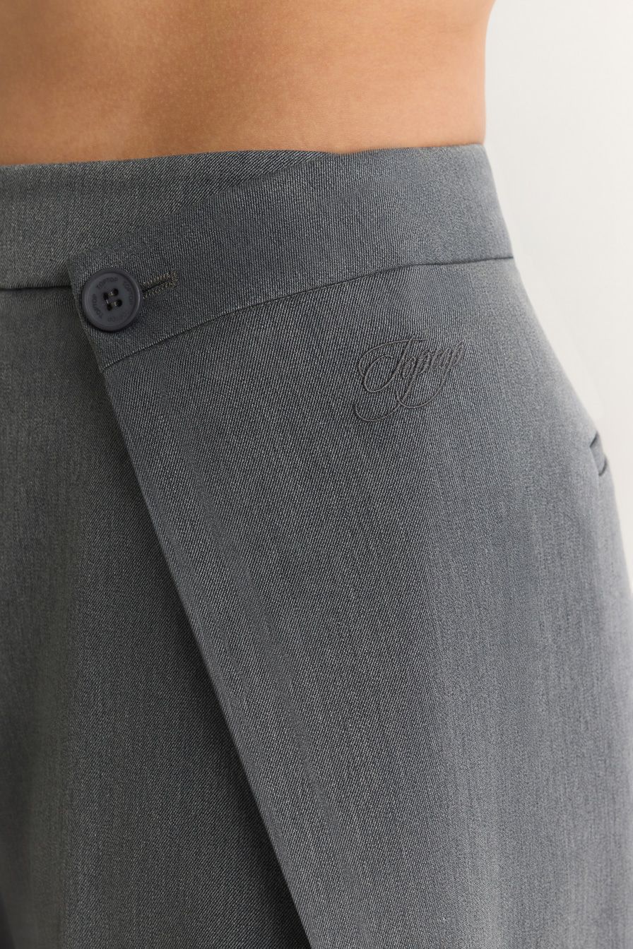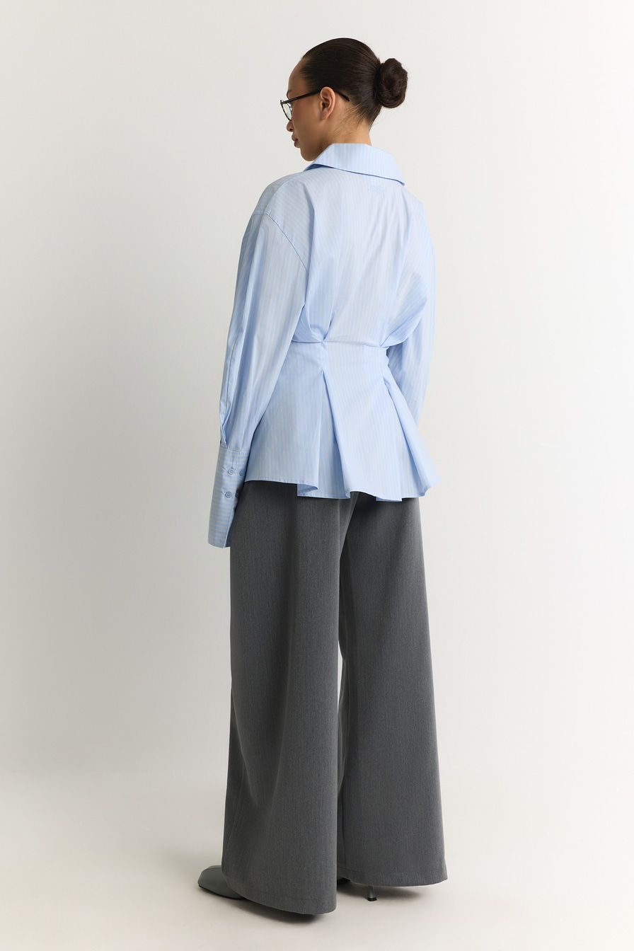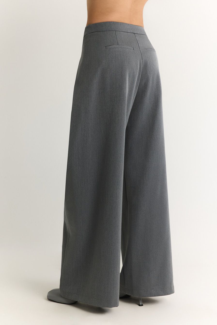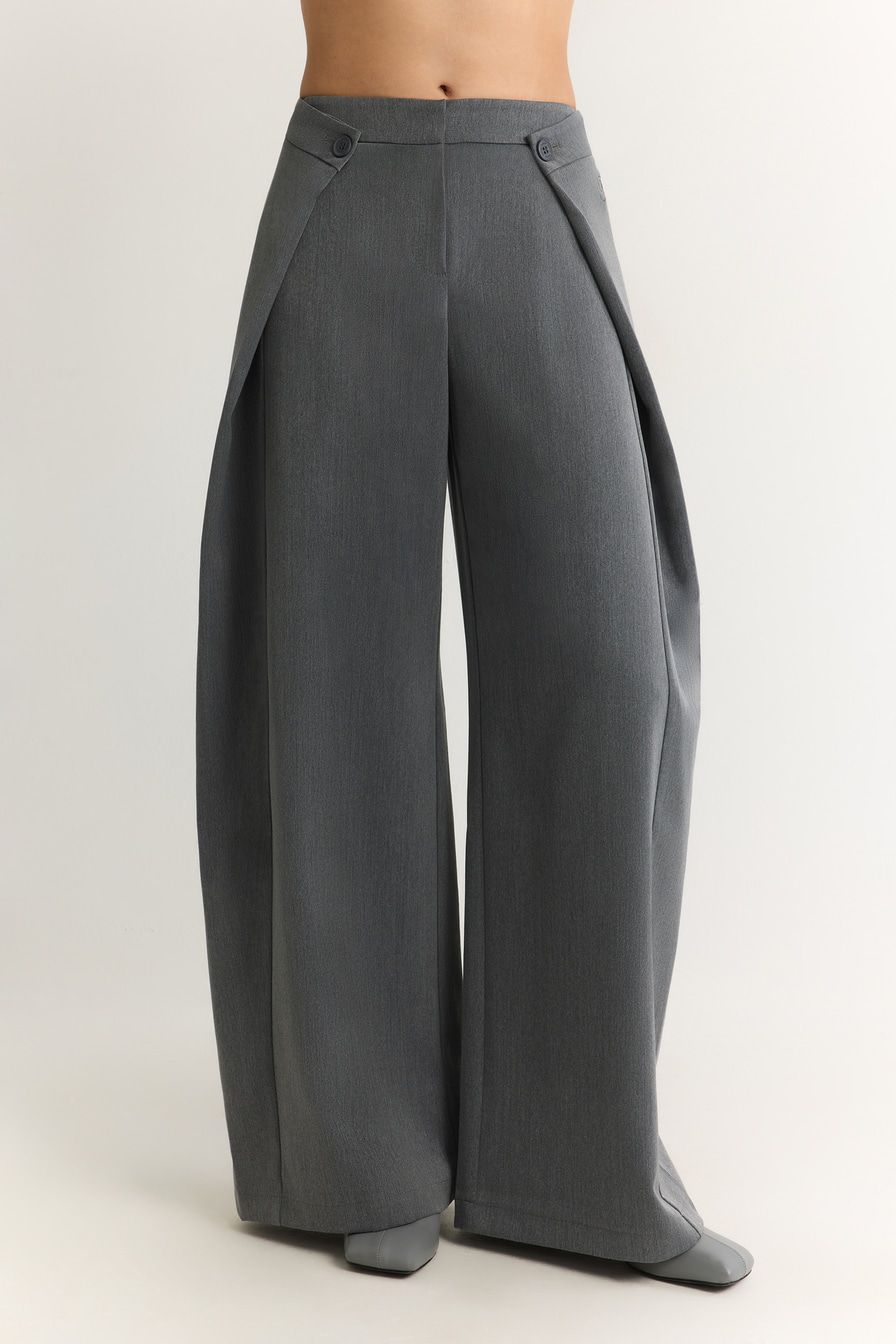 Широкие серые брюки выполнены из смесовой ткани с добавлением района – материала на основе целлюлозы. Модель дополнена защипами на поясе с застежкой на пуговицы.