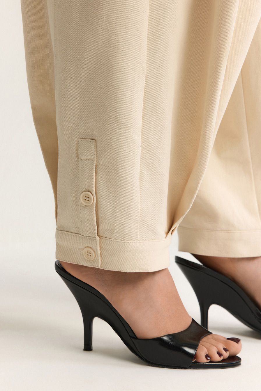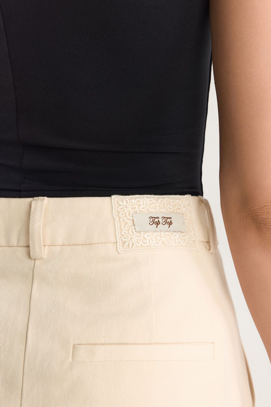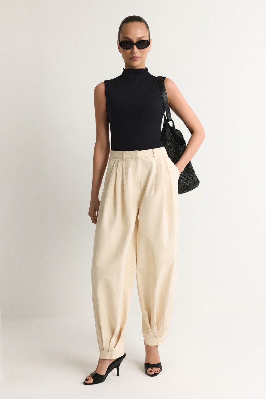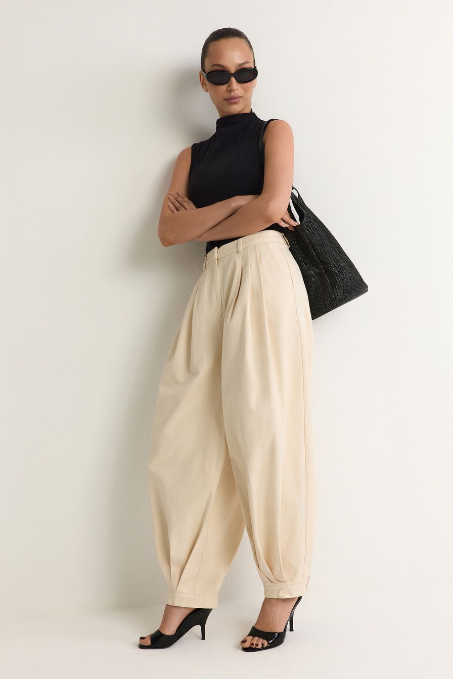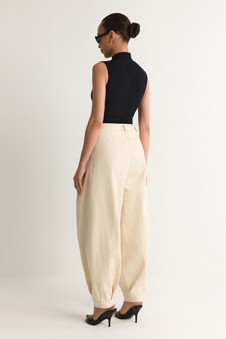Широкие брюки молочного цвета выполнены из 100% хлопка, дополнены узкими манжетами и защипами.