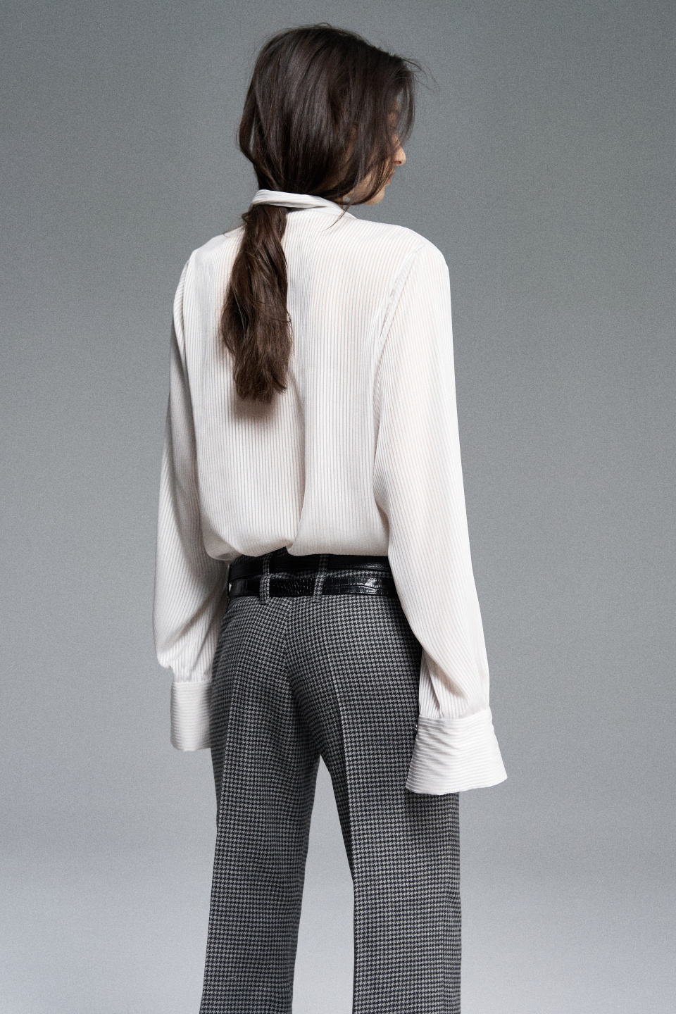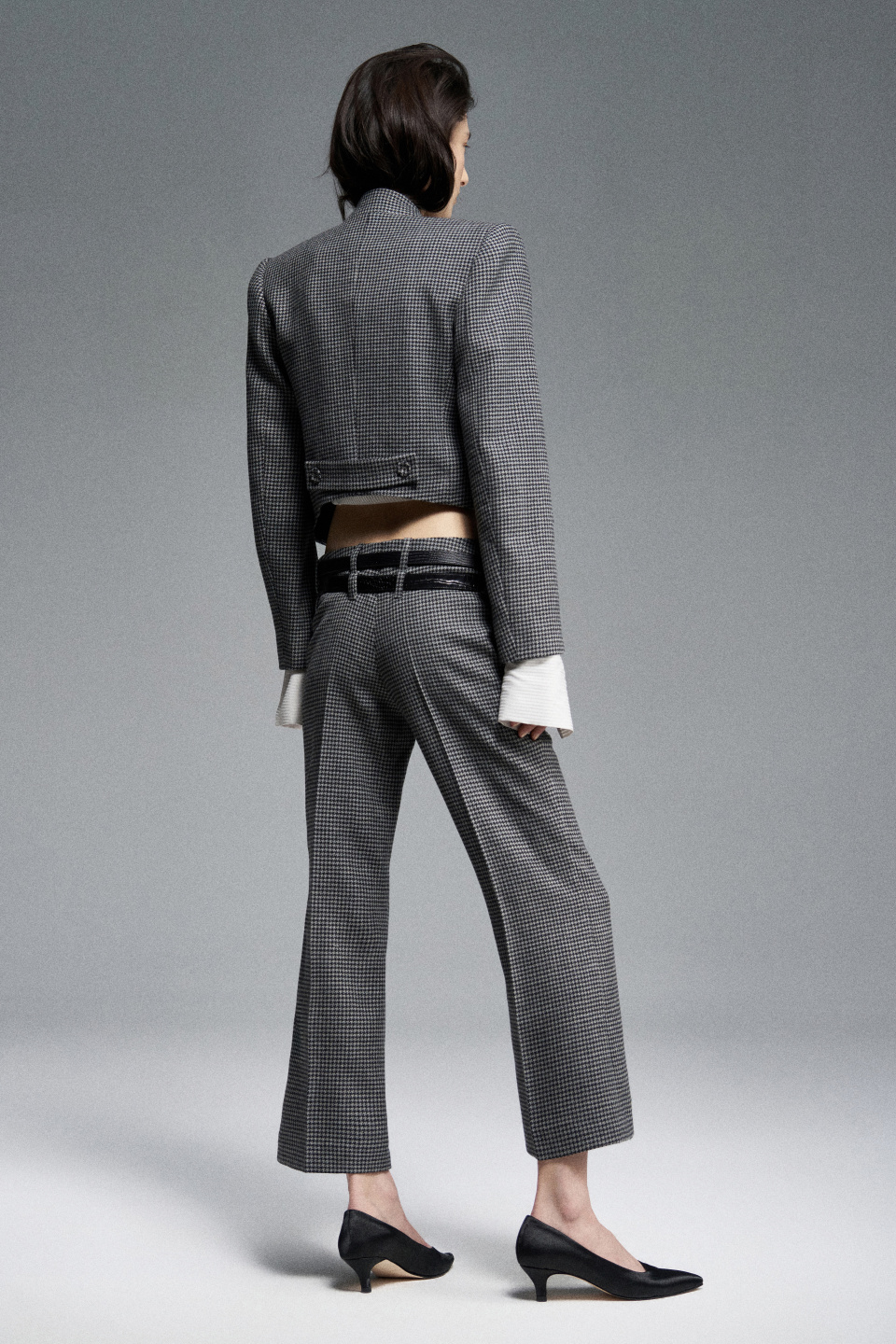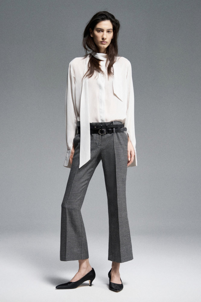 Брюки из костюмной ткани на средней посадке. Длина 7/8. Модель с карманами по бокам и дополнена двойным рядом шлевок.