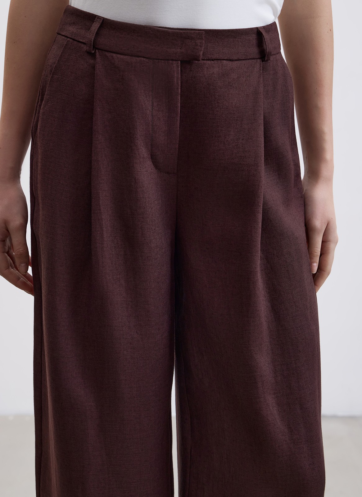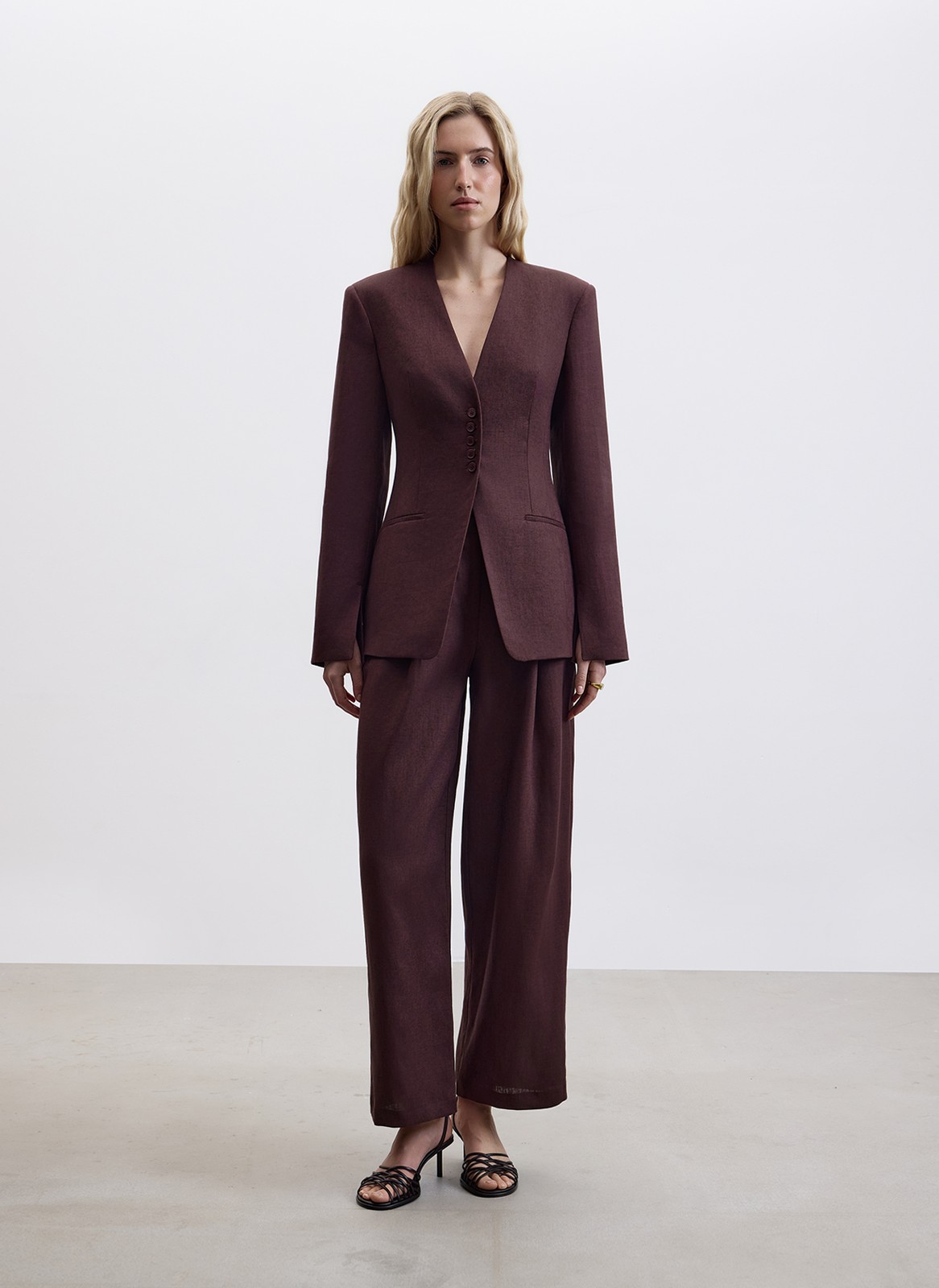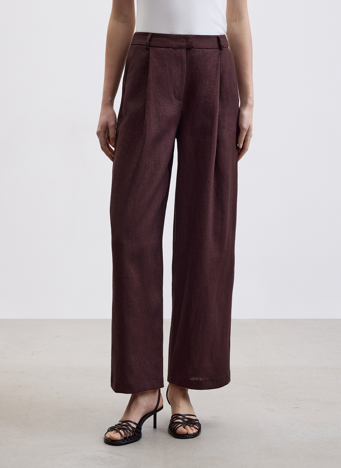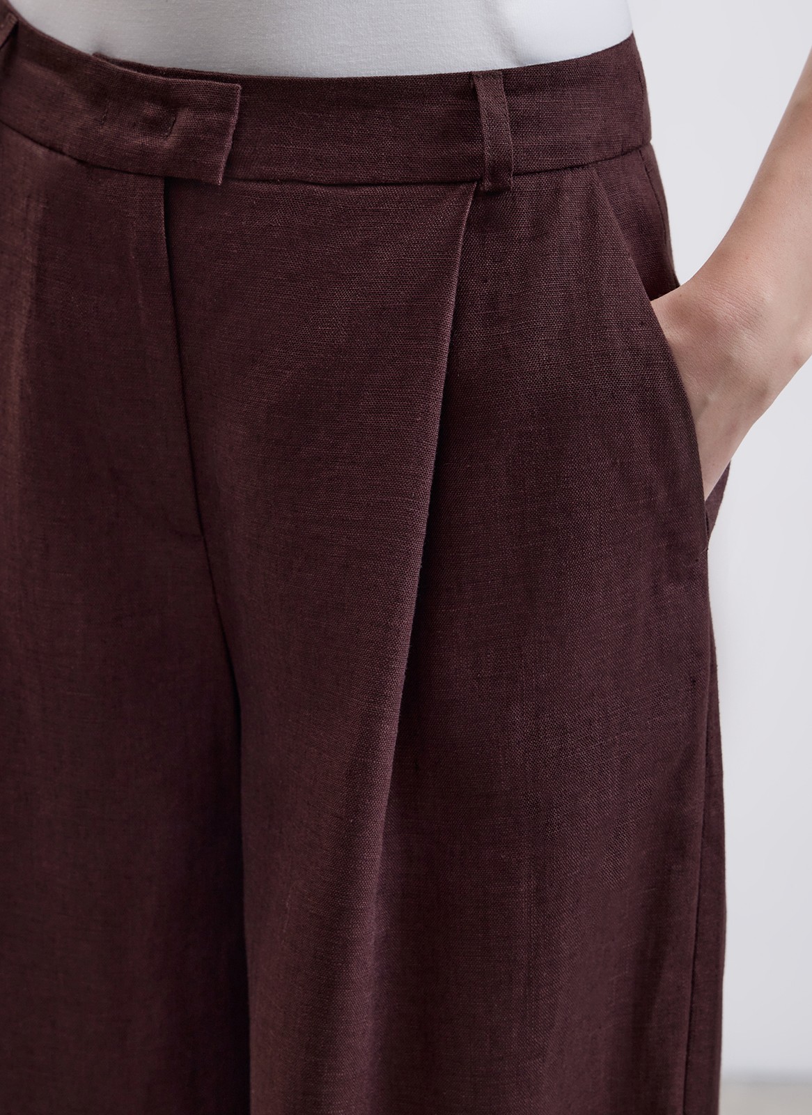 Брюки с архитектурным силуэтом эффектно подчёркивают естественную красоту материала.
