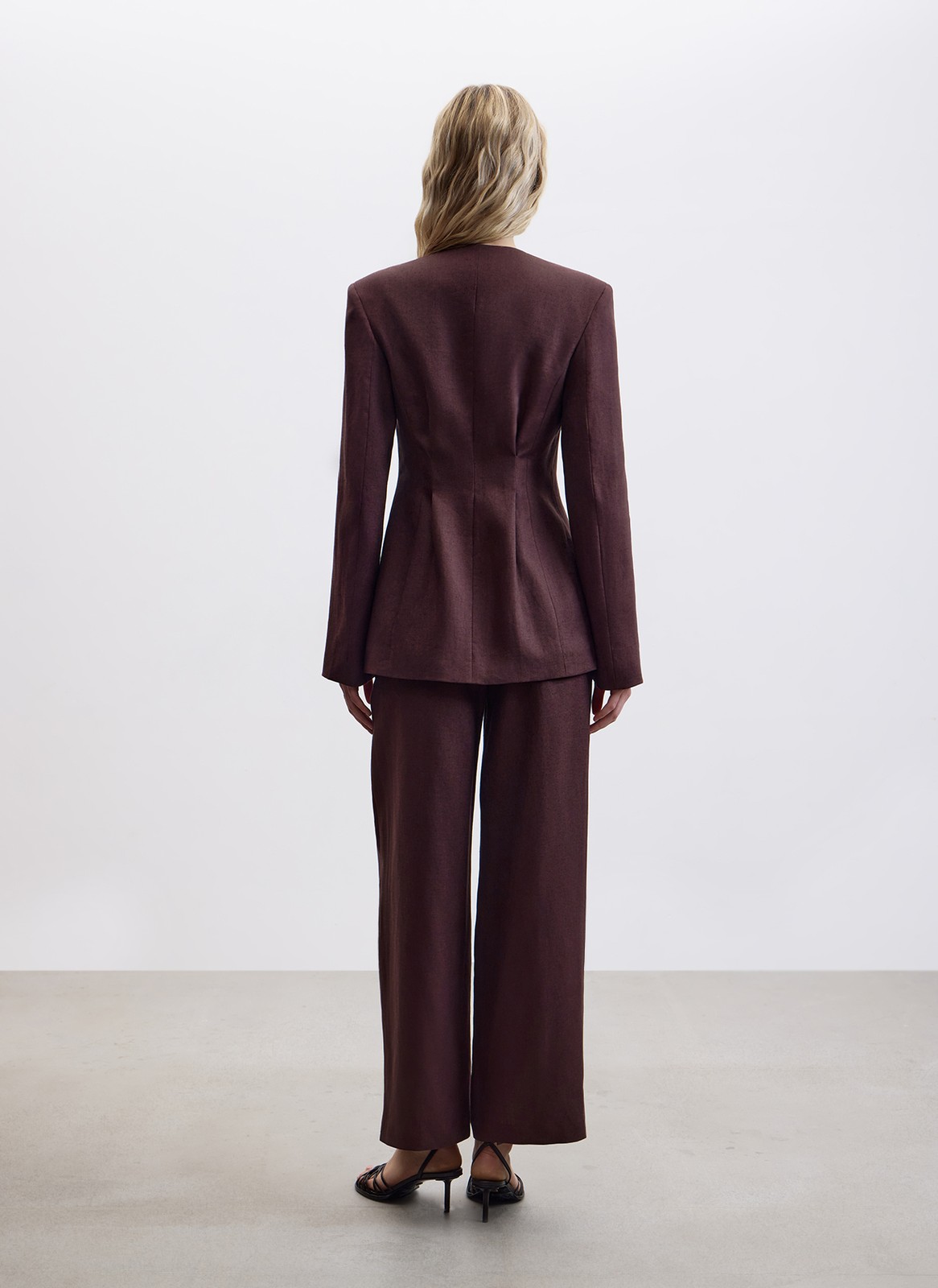 Изделие сшито из плотной фактурной ткани с включениями — это актуальное решение, подчёркивающее природное совершенство материала. Включения в структуре не являются дефектом, а наоборот, создают акцент на архитектурной форме брюк.