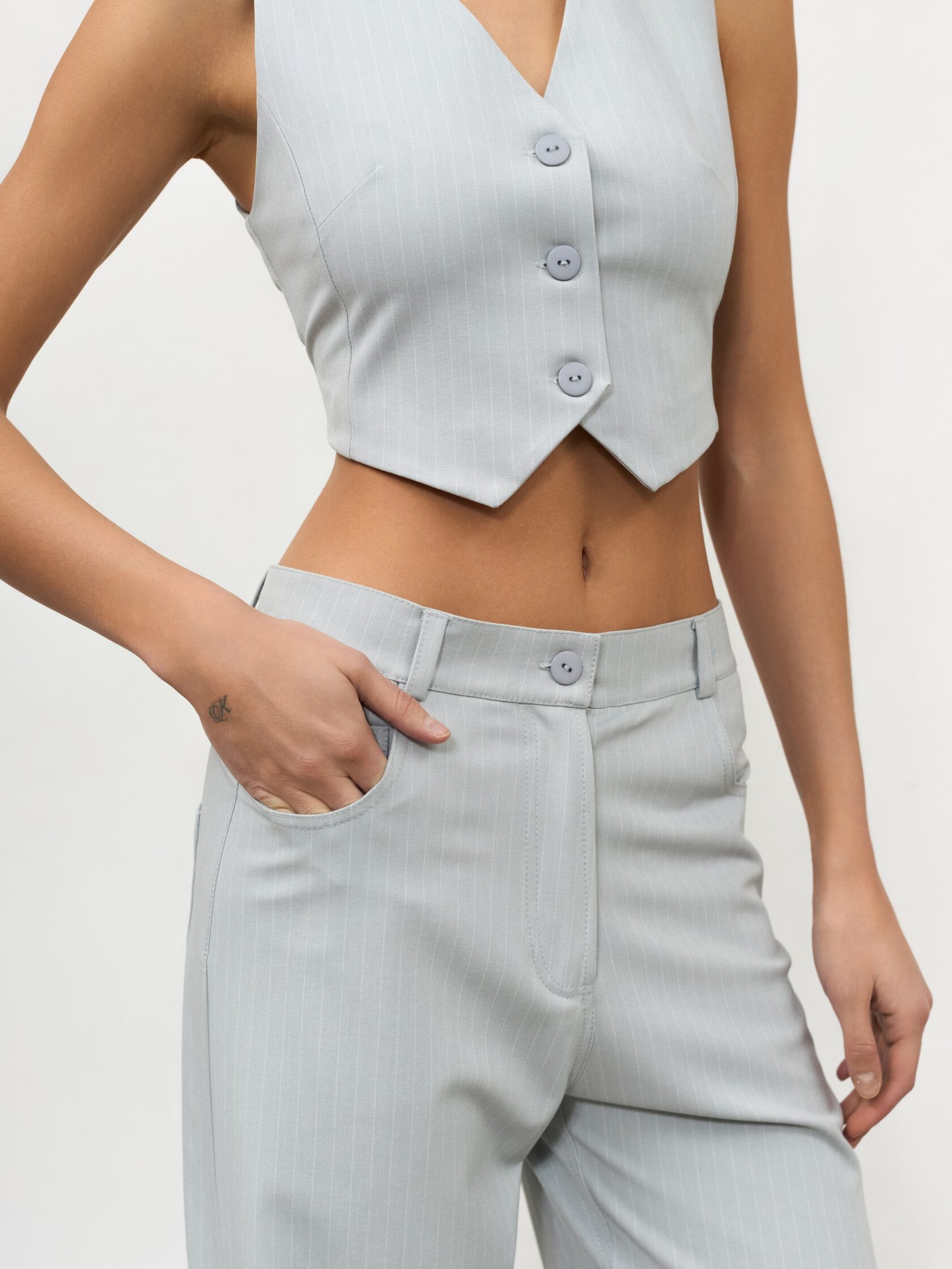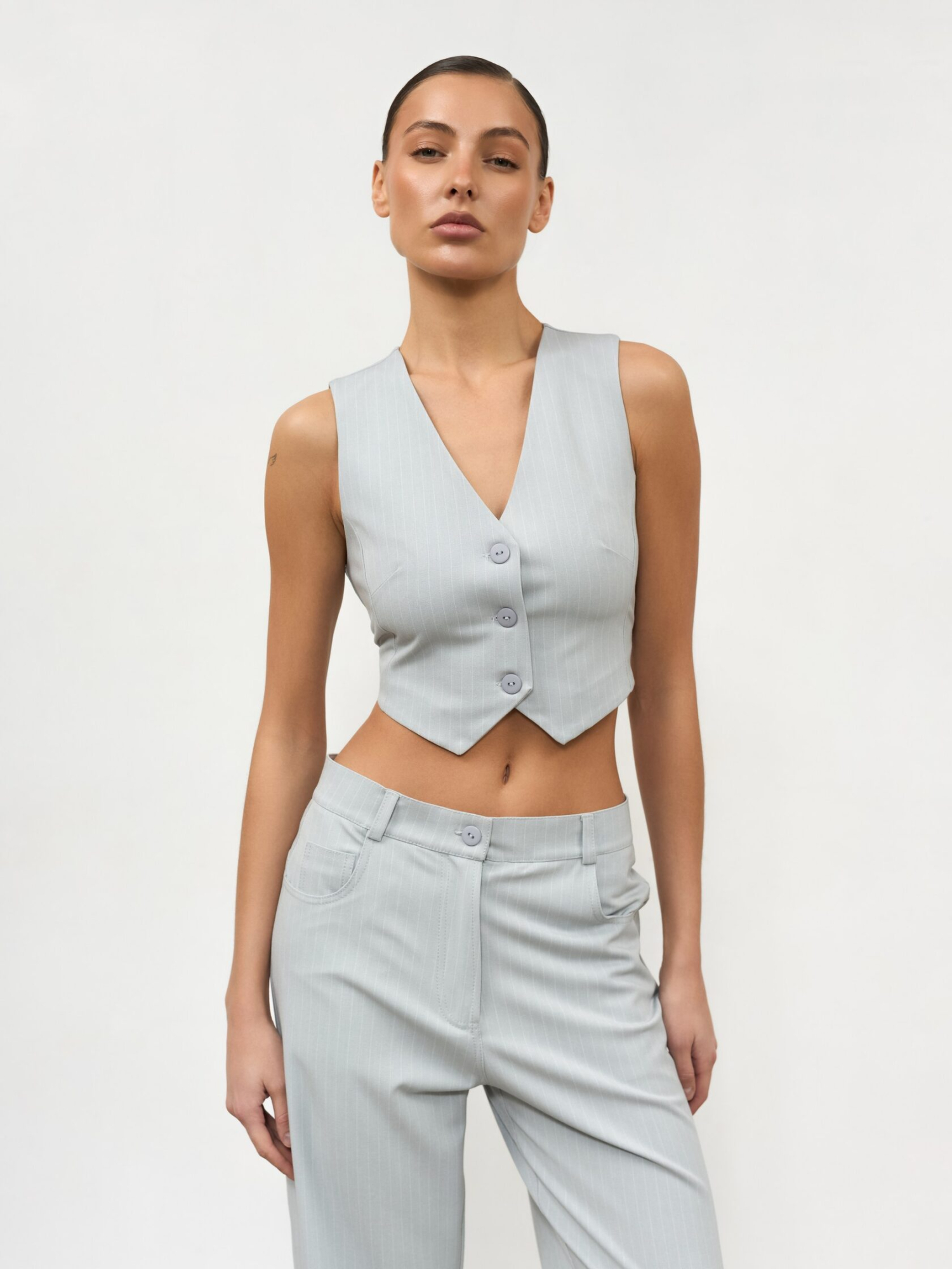 Аккуратный жилет с V-образным вырезом — часть нашего костюма-тройки. Элегантная и лаконичная модель, которая станет универсальной основой вашего гардероба.