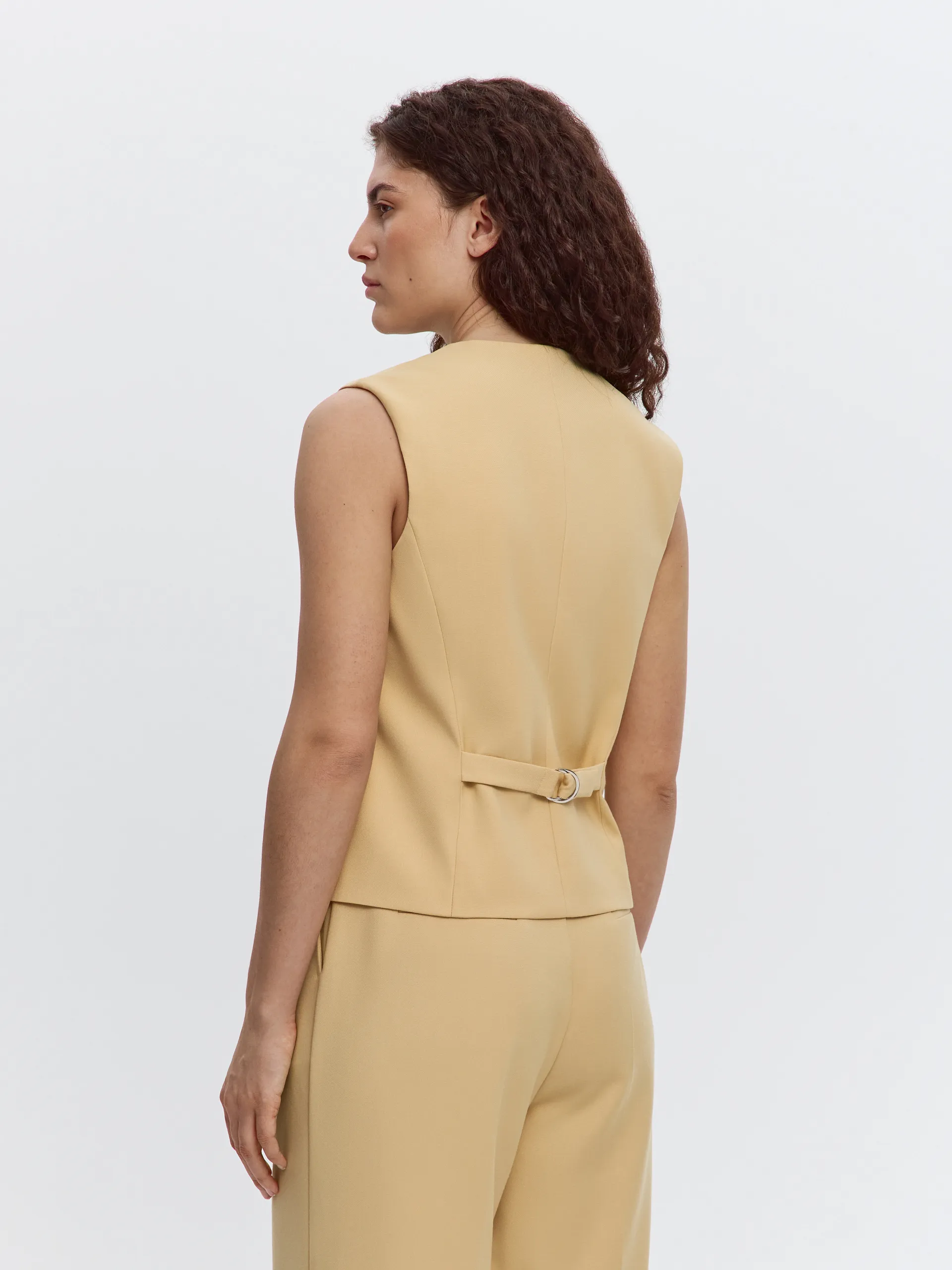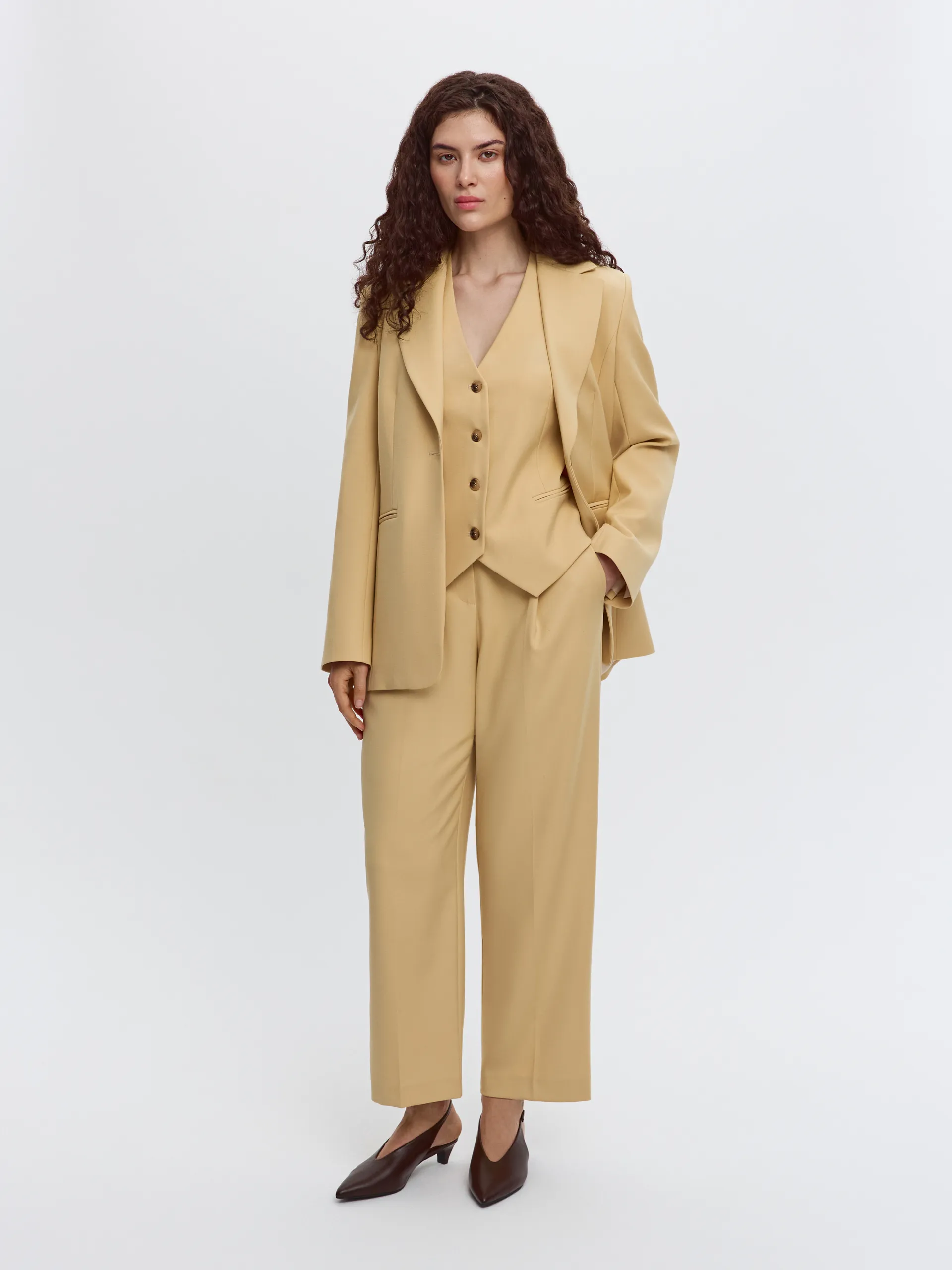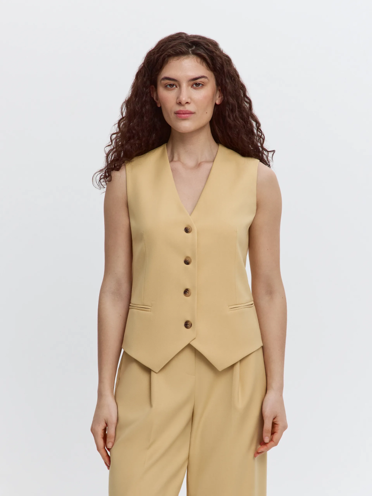 Модель прямого силуэта подходит практически любому типу фигуры. Плотная ткань хорошо держит форму и надолго сохраняет первоначальный внешний вид. Спинка жилета декорирована аккуратным ремешком. Стилизуйте образ строгой блузкой для делового аутфита, добавьте брюки и элегантные лодочки. А для неформального образа подберите oversize футболку, голубые джинсы и грубые ботинки. Жилет также можно носить, как самостоятельную часть образа - без нижнего слоя.