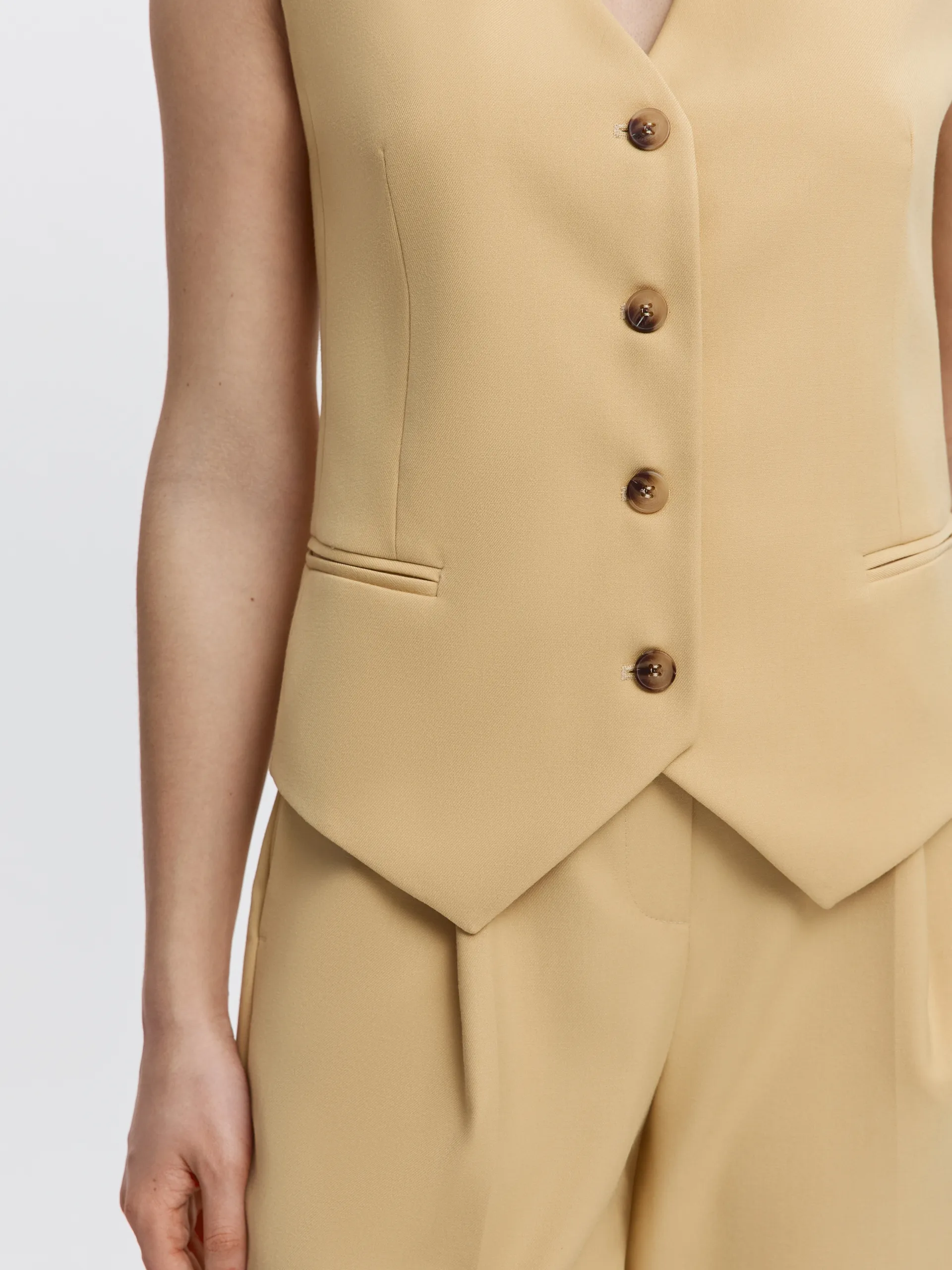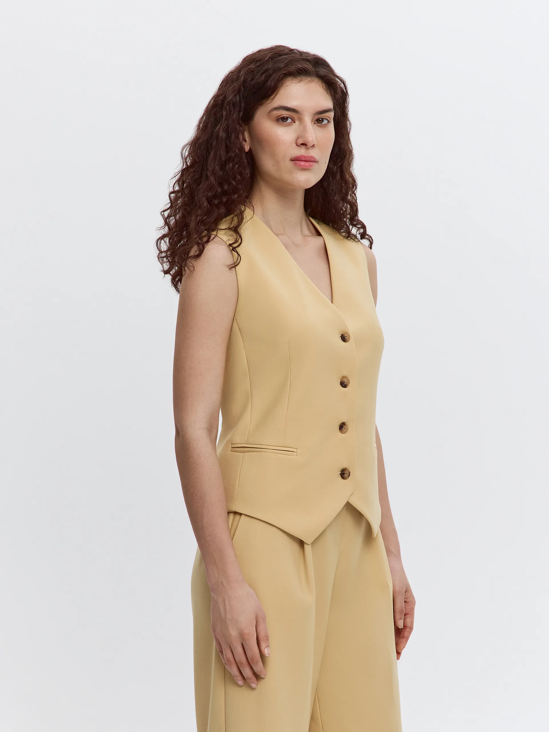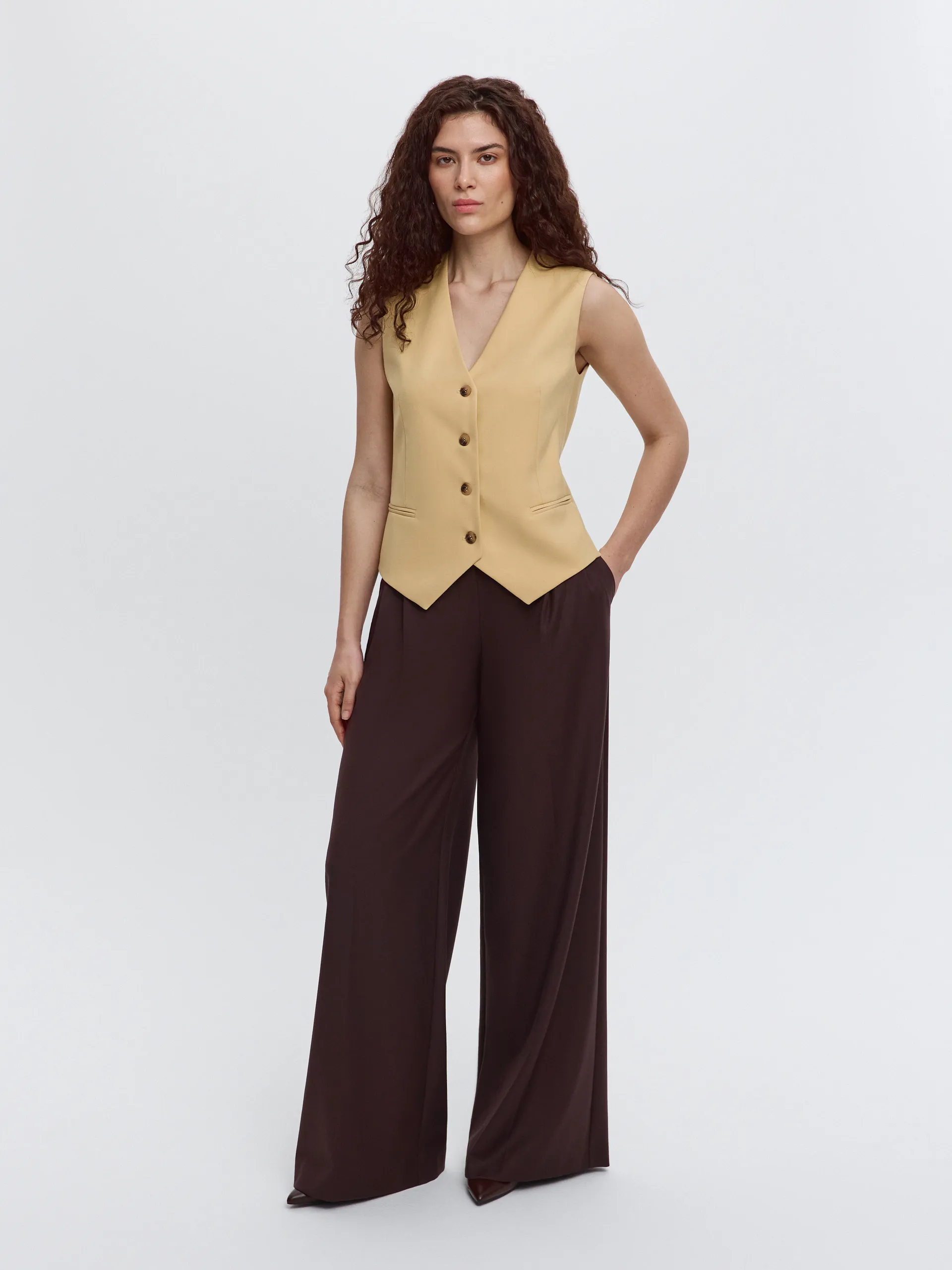 Модель прямого силуэта подходит практически любому типу фигуры. Плотная ткань хорошо держит форму и надолго сохраняет первоначальный внешний вид. Спинка жилета декорирована аккуратным ремешком. Стилизуйте образ строгой блузкой для делового аутфита, добавьте брюки и элегантные лодочки. А для неформального образа подберите oversize футболку, голубые джинсы и грубые ботинки. Жилет также можно носить, как самостоятельную часть образа - без нижнего слоя.