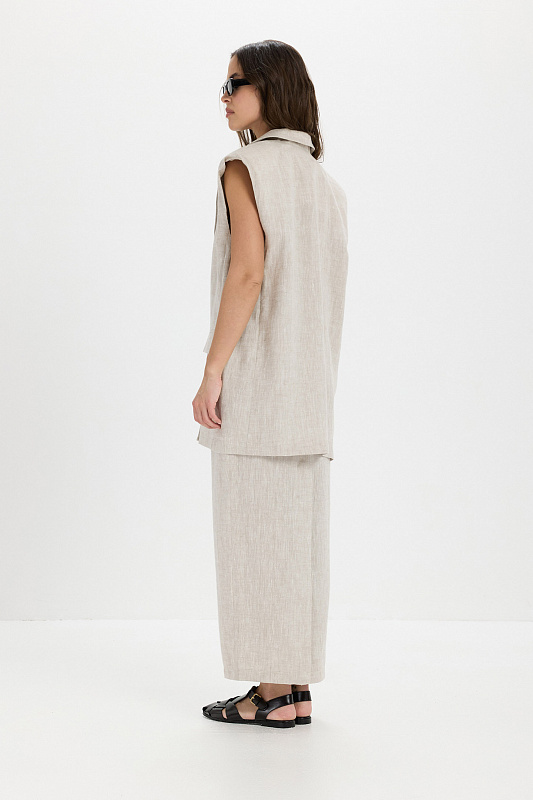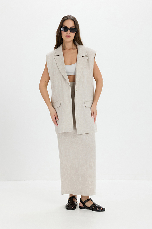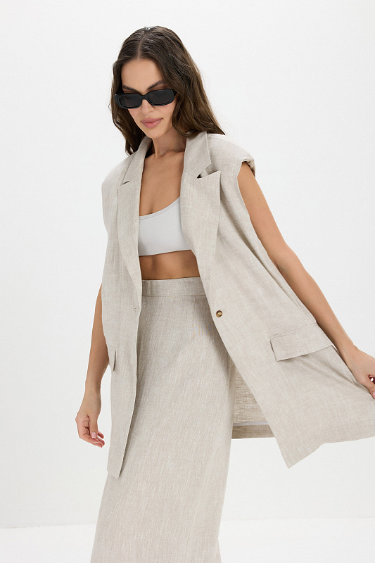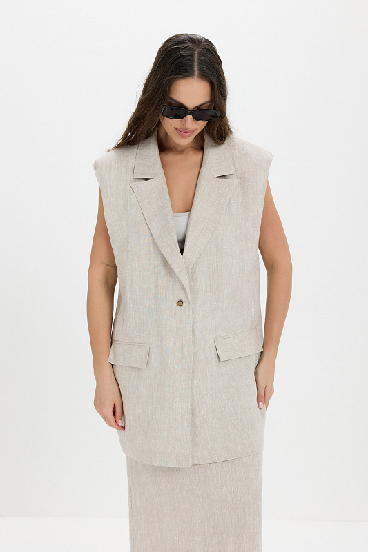 Стильный и комфортный элемент гардероба, который идеально подходит для летних дней. Изготовленный из натурального льна, жилет отличается лёгкостью и дышащей текстурой, обеспечивая комфорт даже в жаркую погоду.