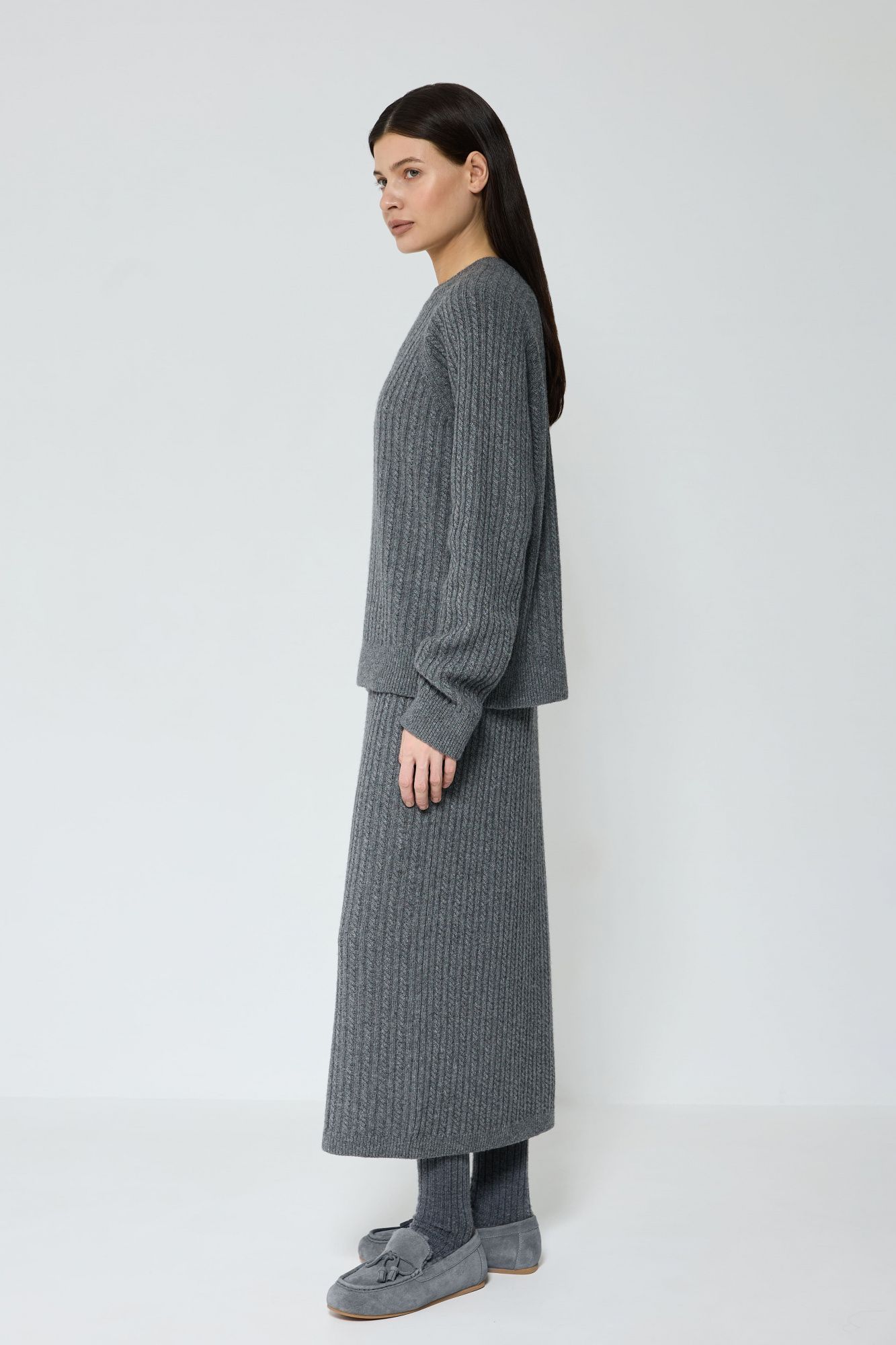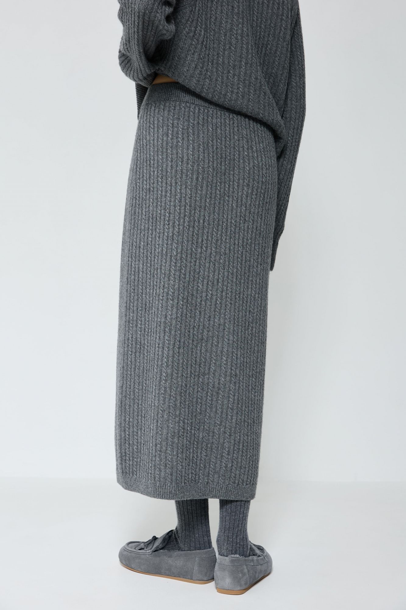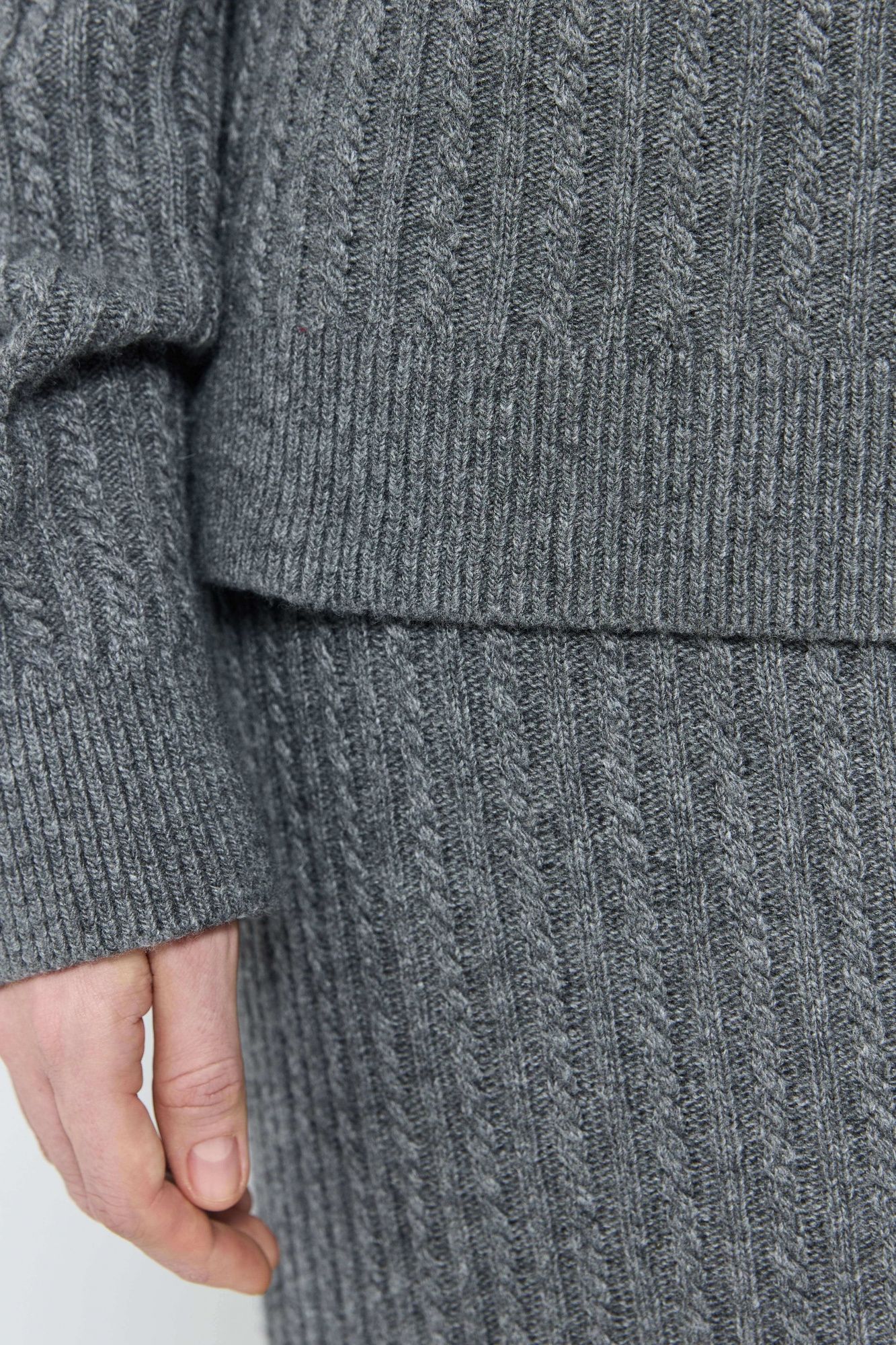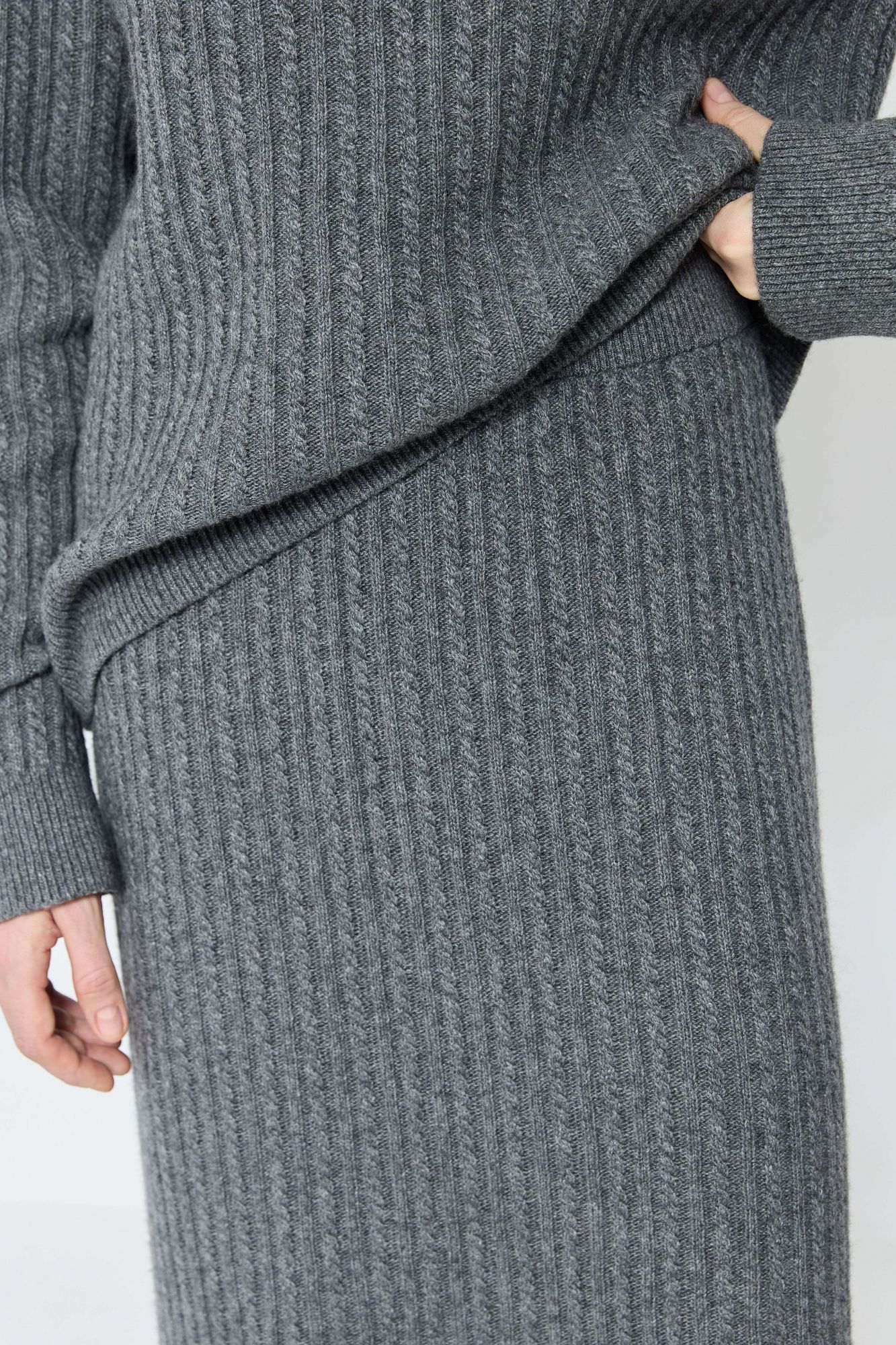 Базовый костюм из джемпера и юбки с акцентным рисунком в косы связан из микса кашемира, шерсти мериноса и вискозы; нежной и комфортной к коже пряжи, сделанной в Италии.