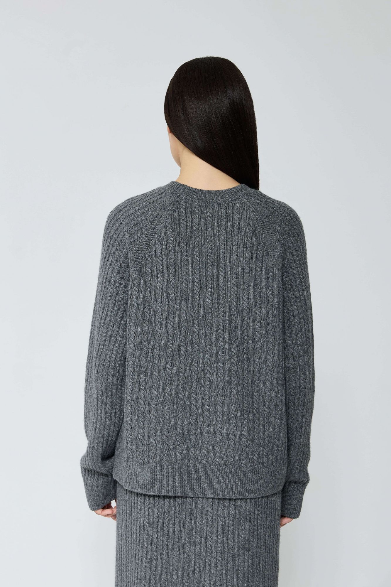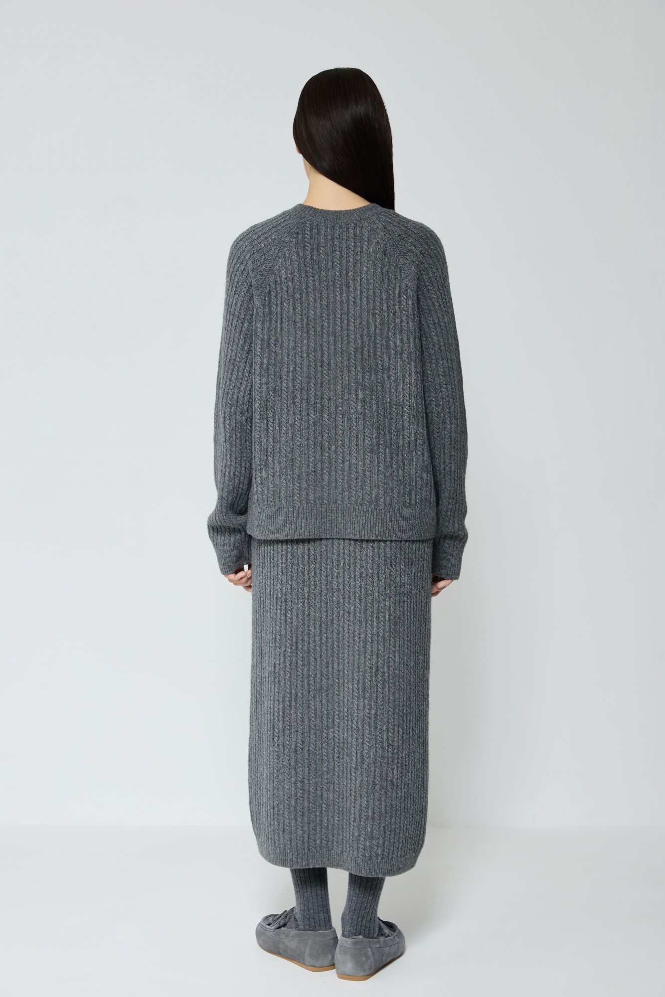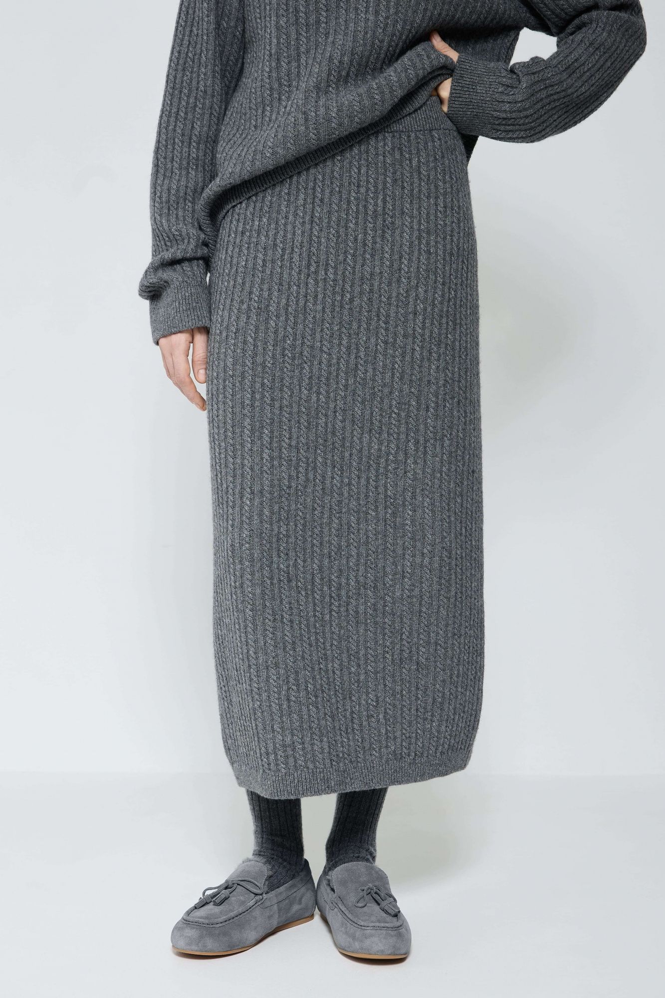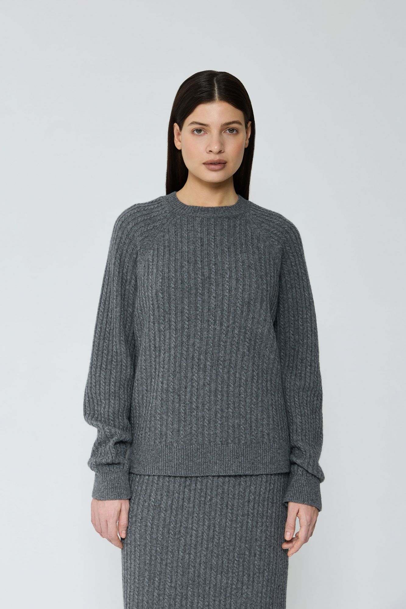 Базовый костюм из джемпера и юбки с акцентным рисунком в косы связан из микса кашемира, шерсти мериноса и вискозы; нежной и комфортной к коже пряжи, сделанной в Италии.