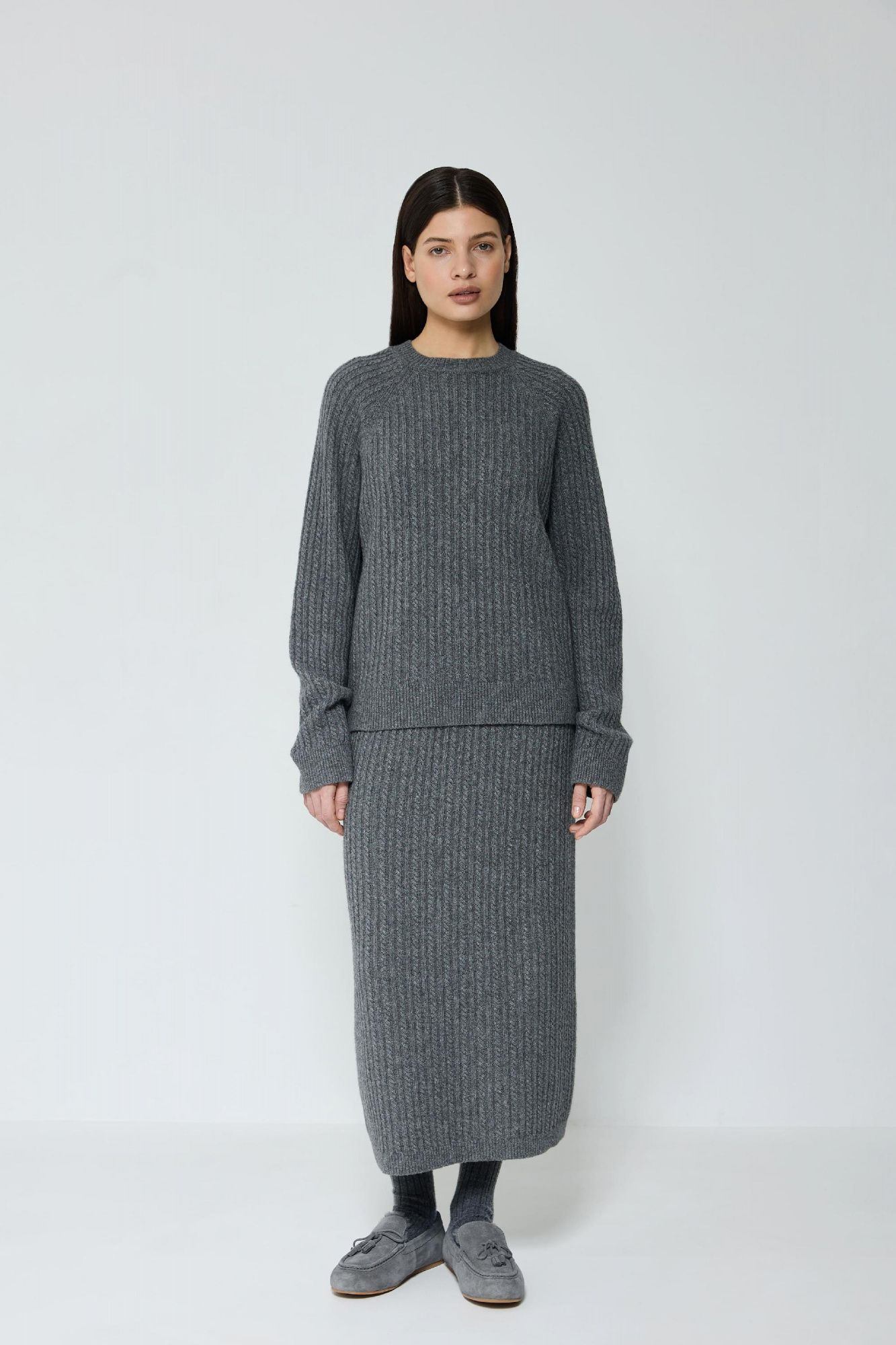 У джемпера прямой выверенный по объему крой и рукава-реглан. Юбка длины миди с высокой посадкой и комфортным поясом на резинке. Вязка средней плотности, подойдет для зимнего сезона.