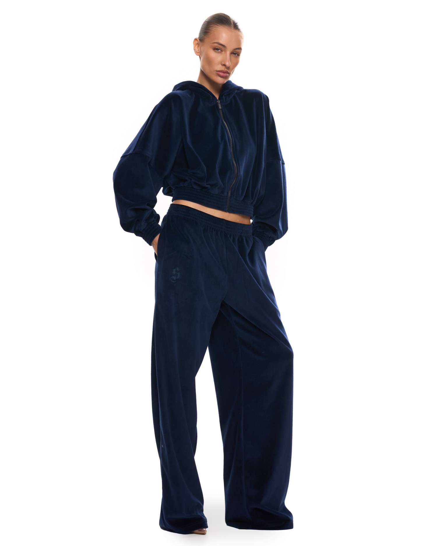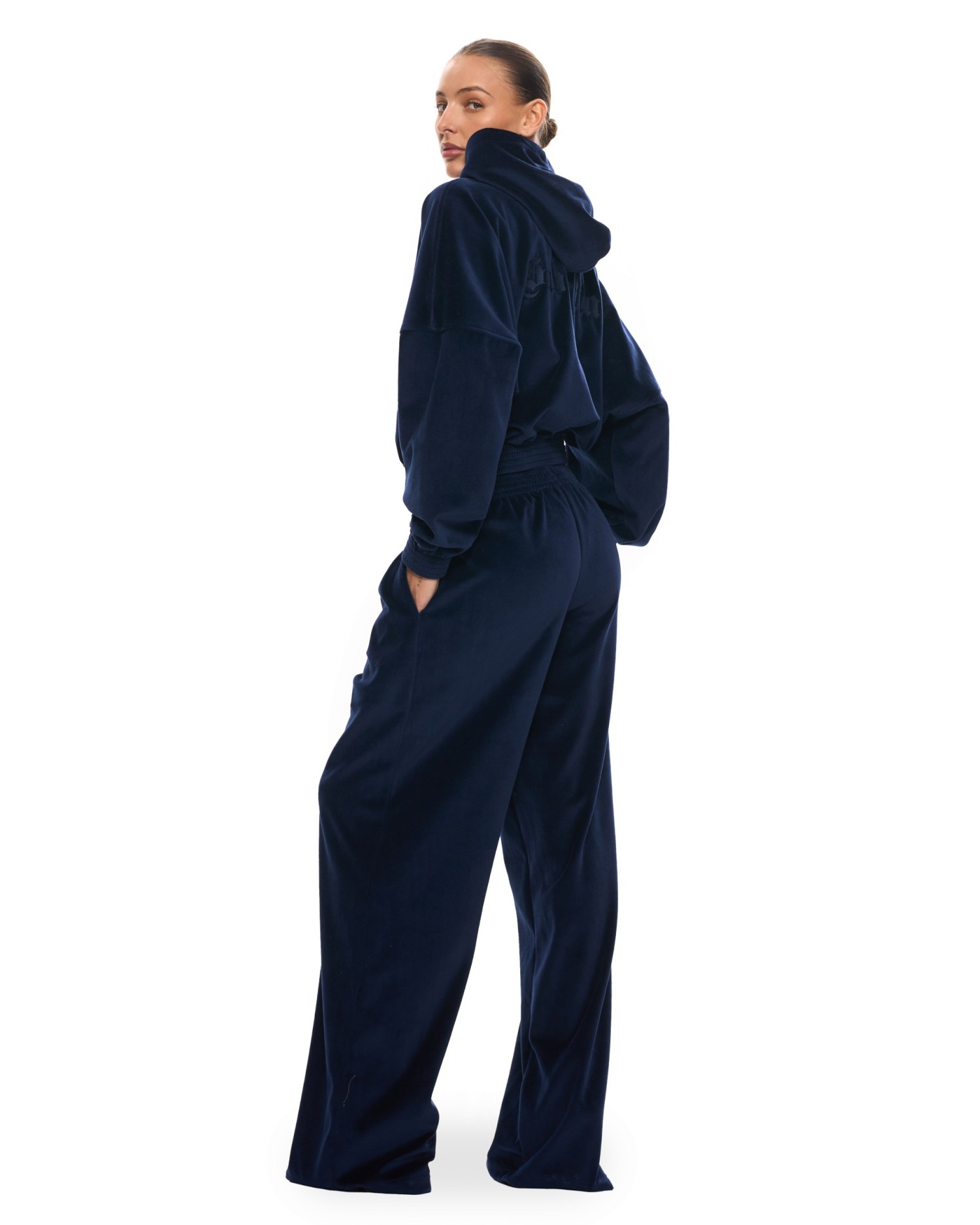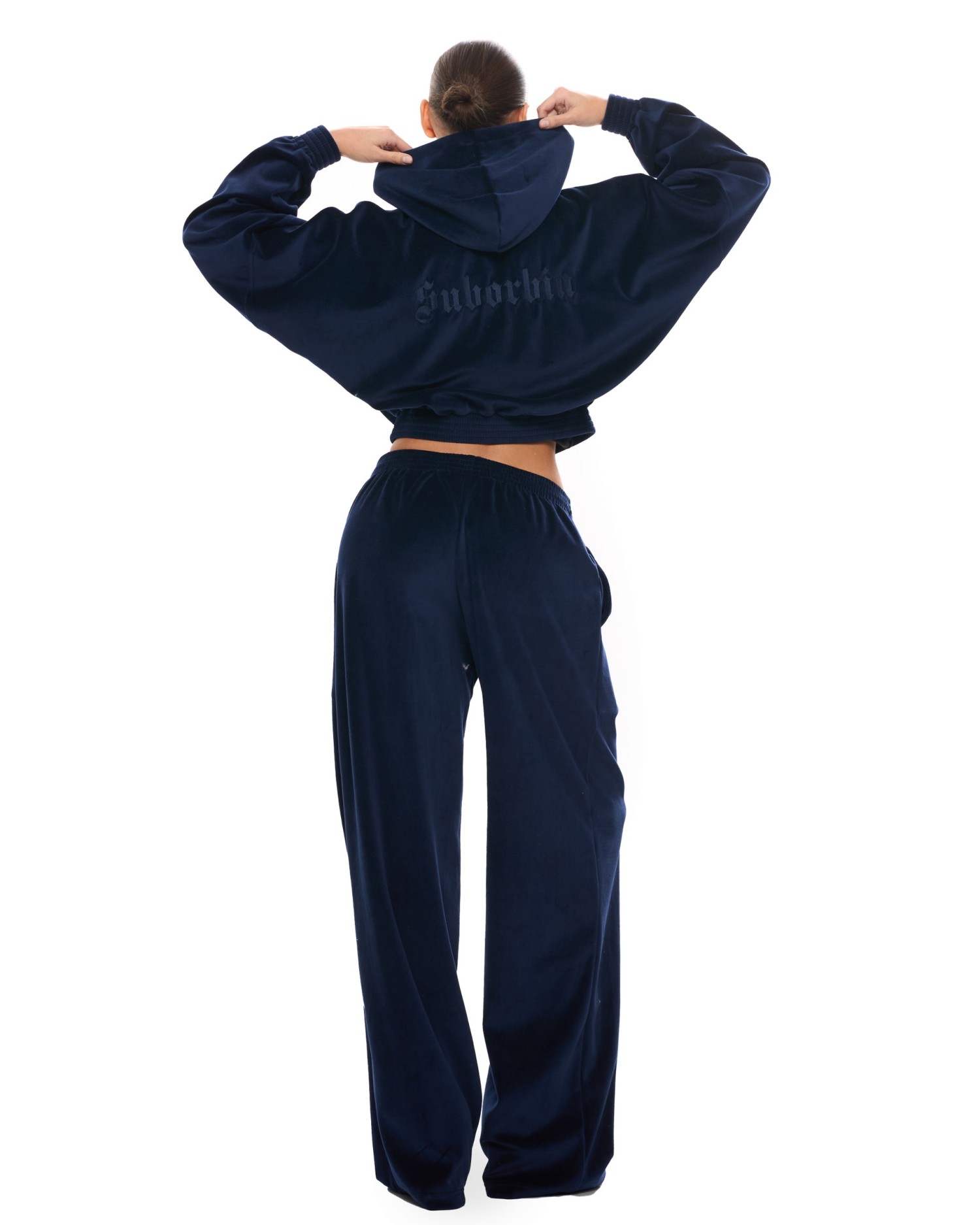 Велюровый костюм свободного кроя, брюки палаццо на резинке с двумя боковыми карманами. Худи на молнии с манжетами на резинке. Детали: брендированная молния, вышивка на спине и на брюках.