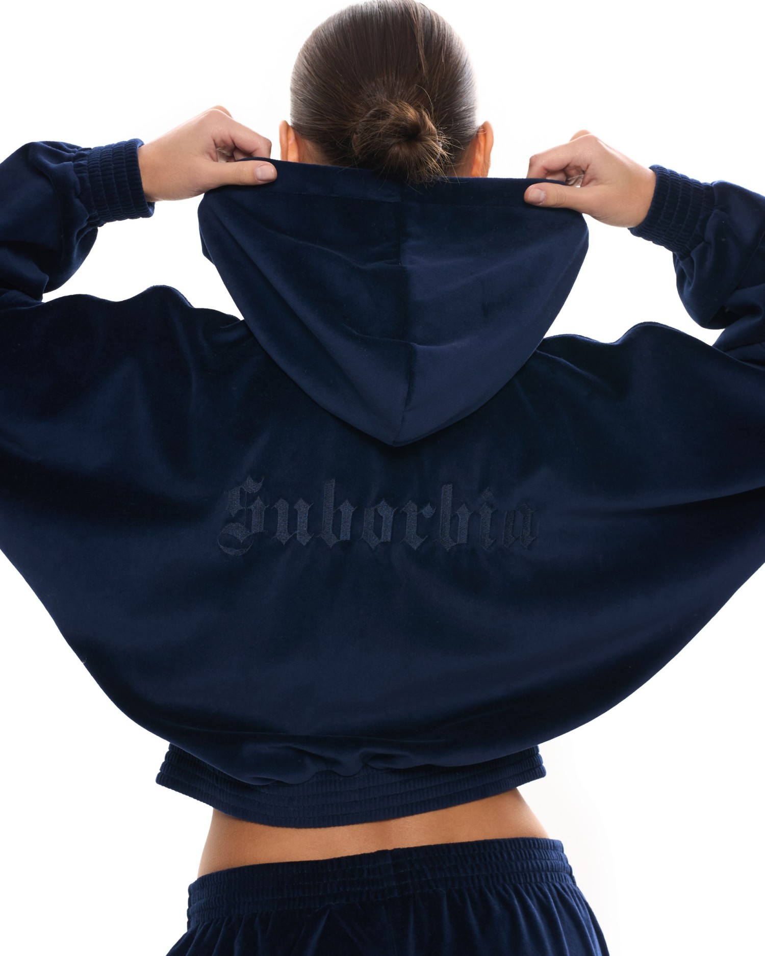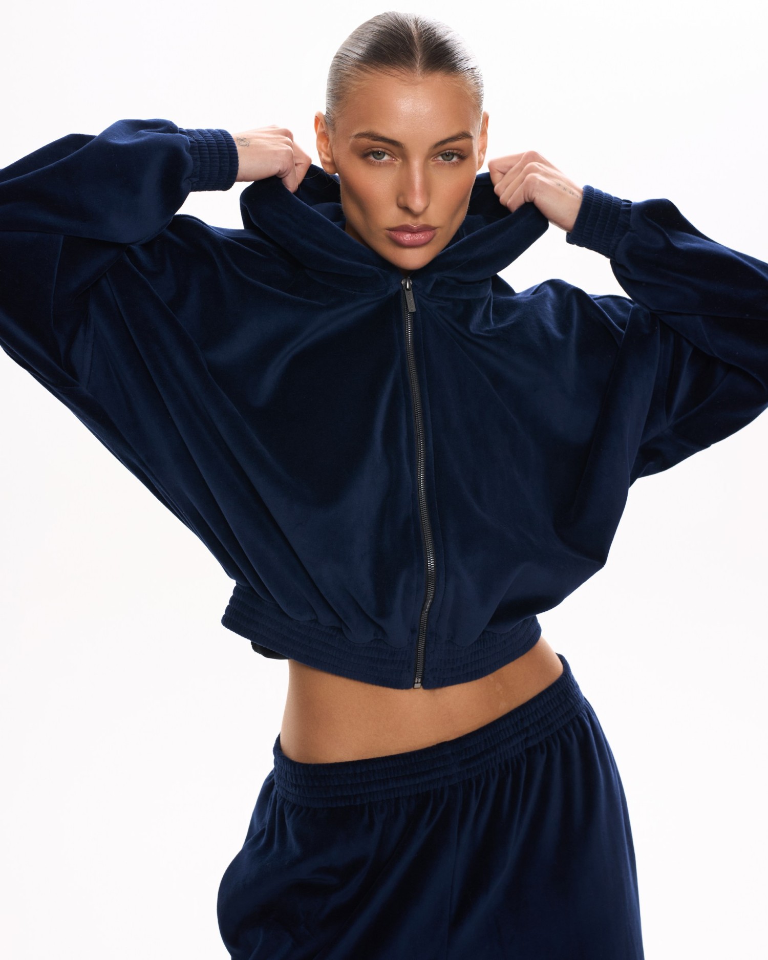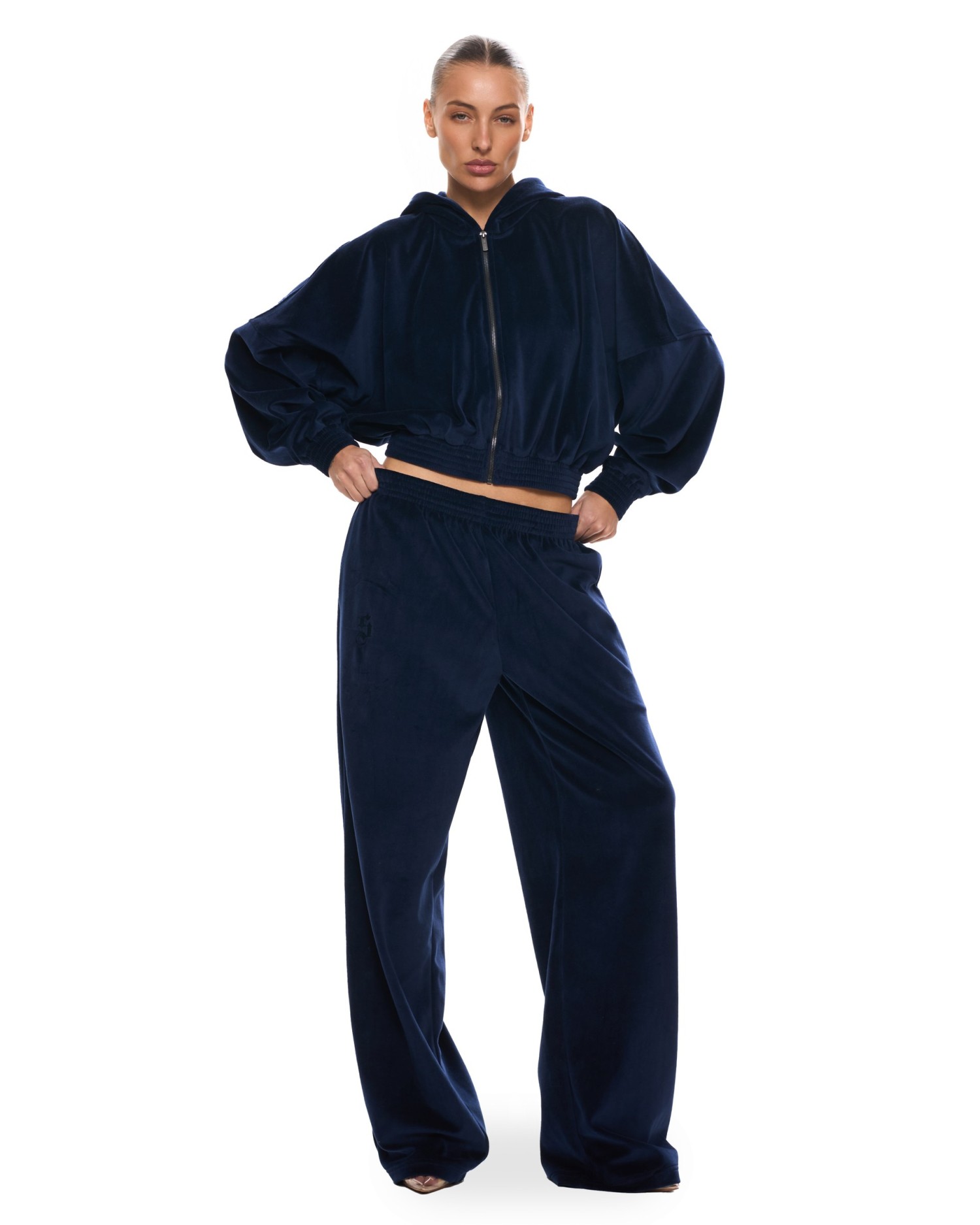 Велюровый костюм свободного кроя, брюки палаццо на резинке с двумя боковыми карманами. Худи на молнии с манжетами на резинке. Детали: брендированная молния, вышивка на спине и на брюках.