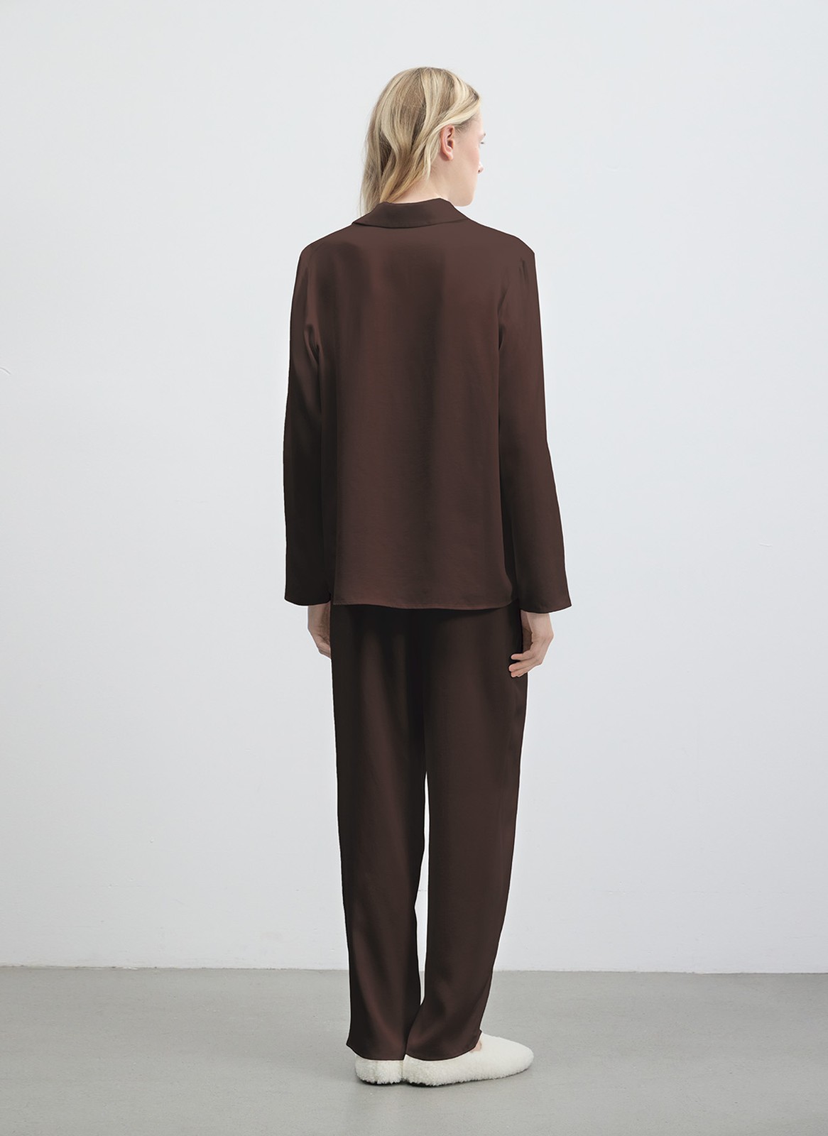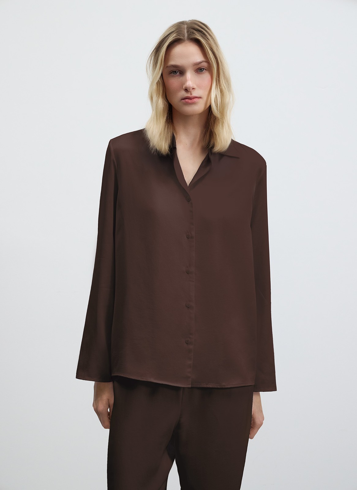 Рубашка свободного силуэта застегивается на пуговицы и дополнена элегантным английским воротником. Брюки с эластичным шнурком на поясе обеспечивают комфортную посадку.
