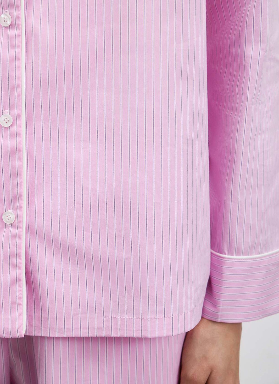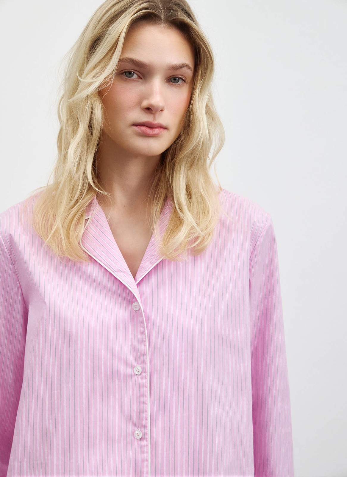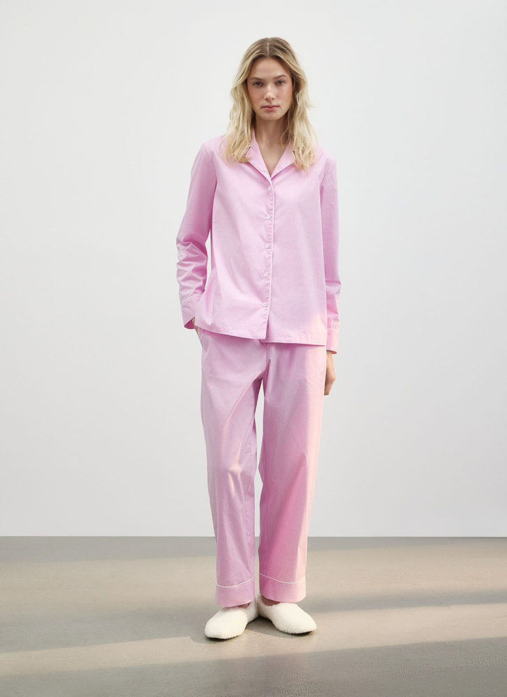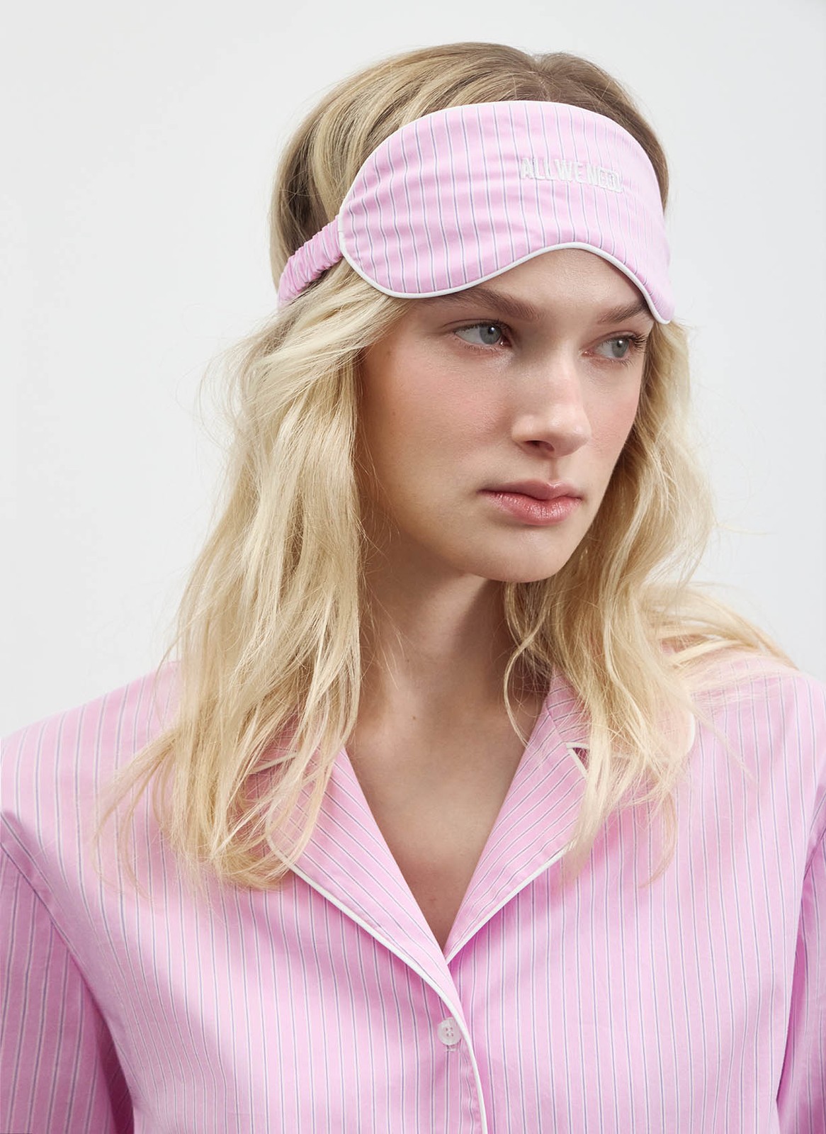 Комплект состоит из рубашки на пуговицах и брюк свободного кроя, а также маски для сна. Элегантный английский воротник, отделка кантом и удобная посадка – всё продумано для вашего комфорта.