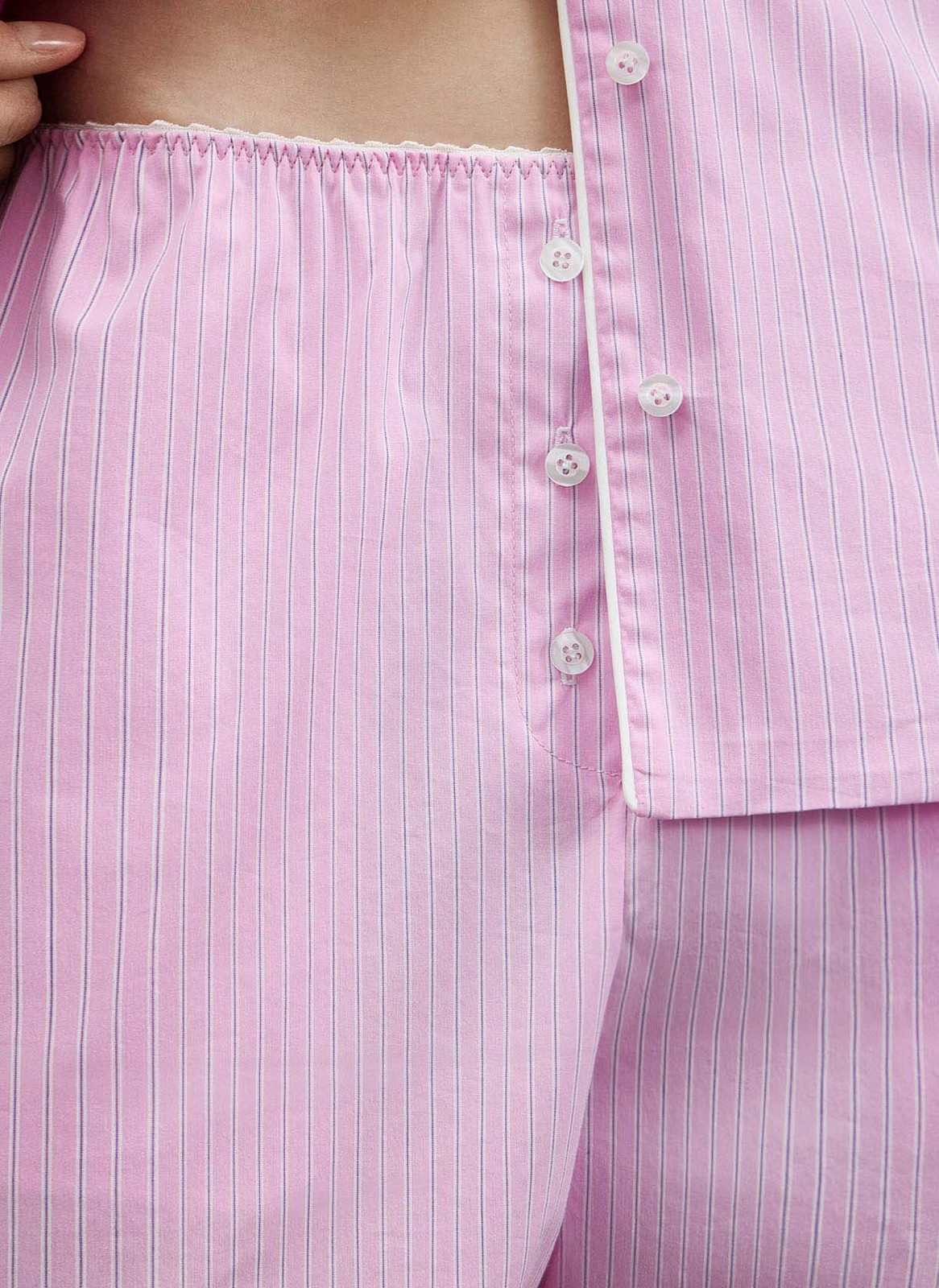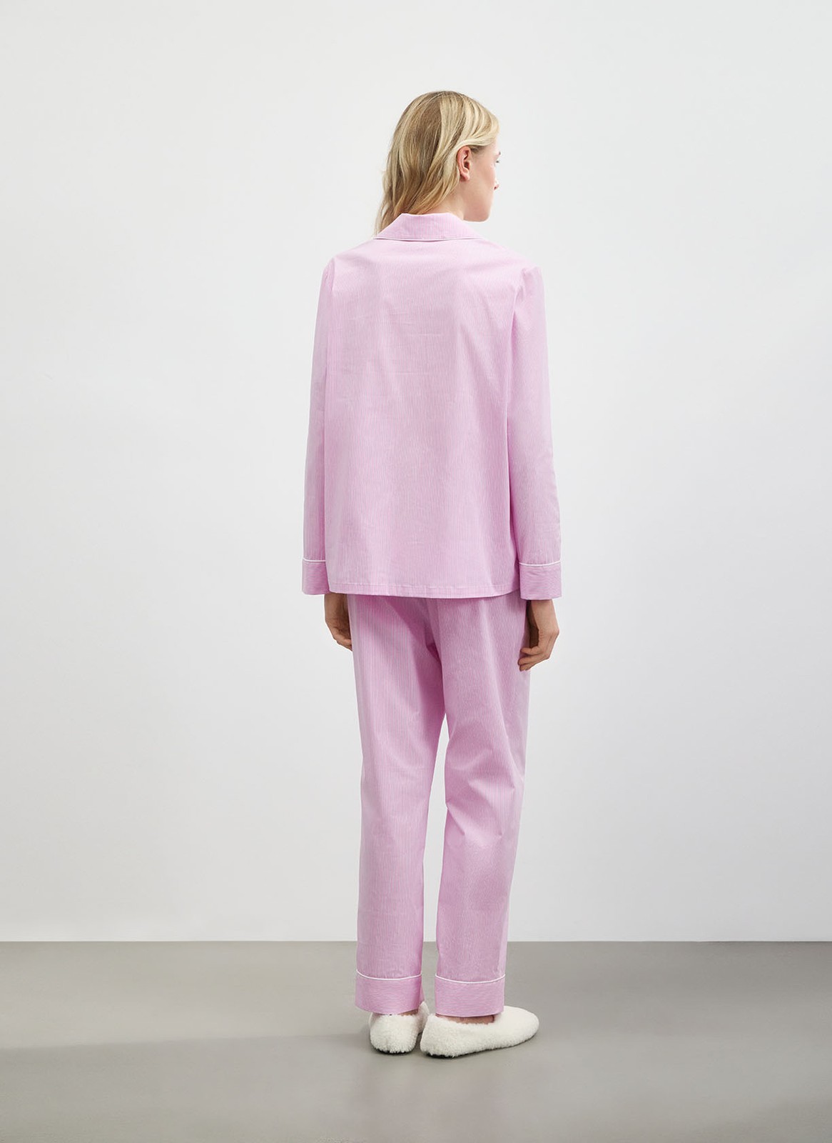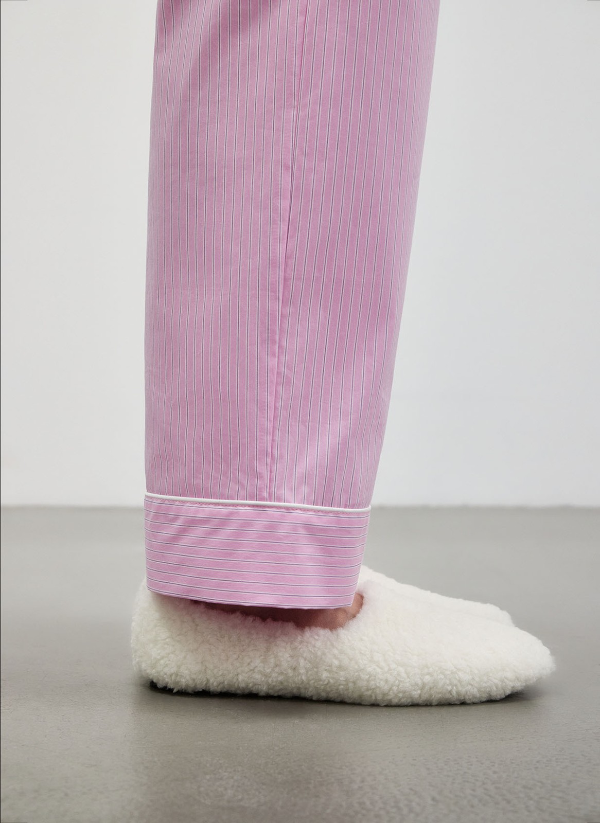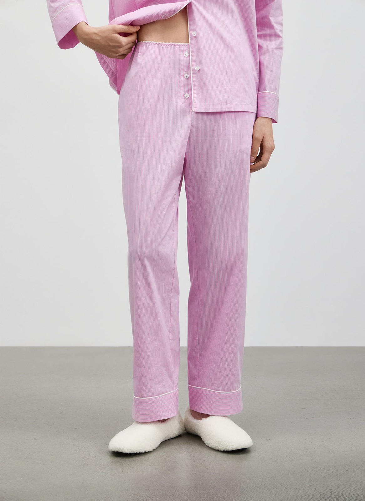 Комплект состоит из рубашки на пуговицах и брюк свободного кроя, а также маски для сна. Элегантный английский воротник, отделка кантом и удобная посадка – всё продумано для вашего комфорта.