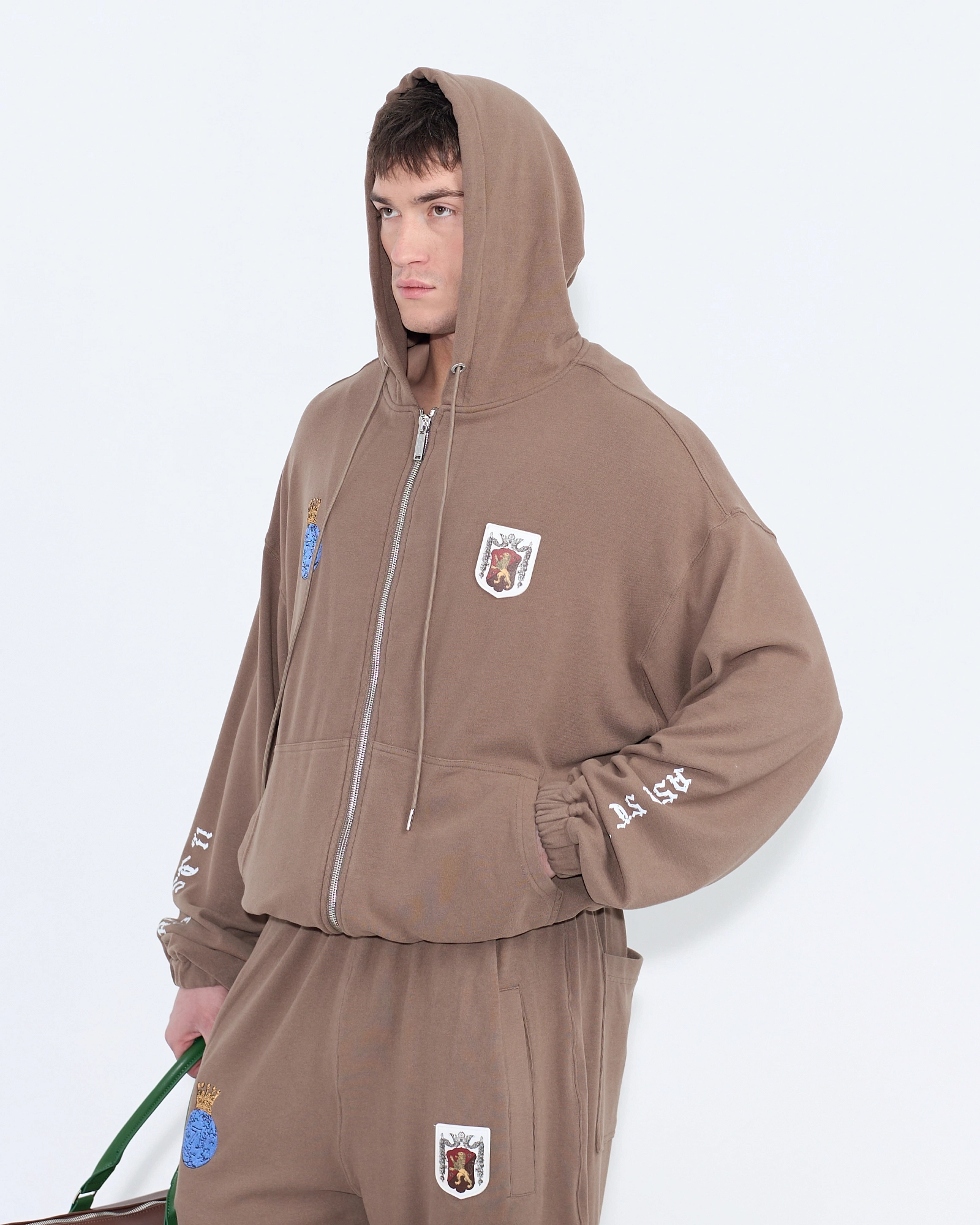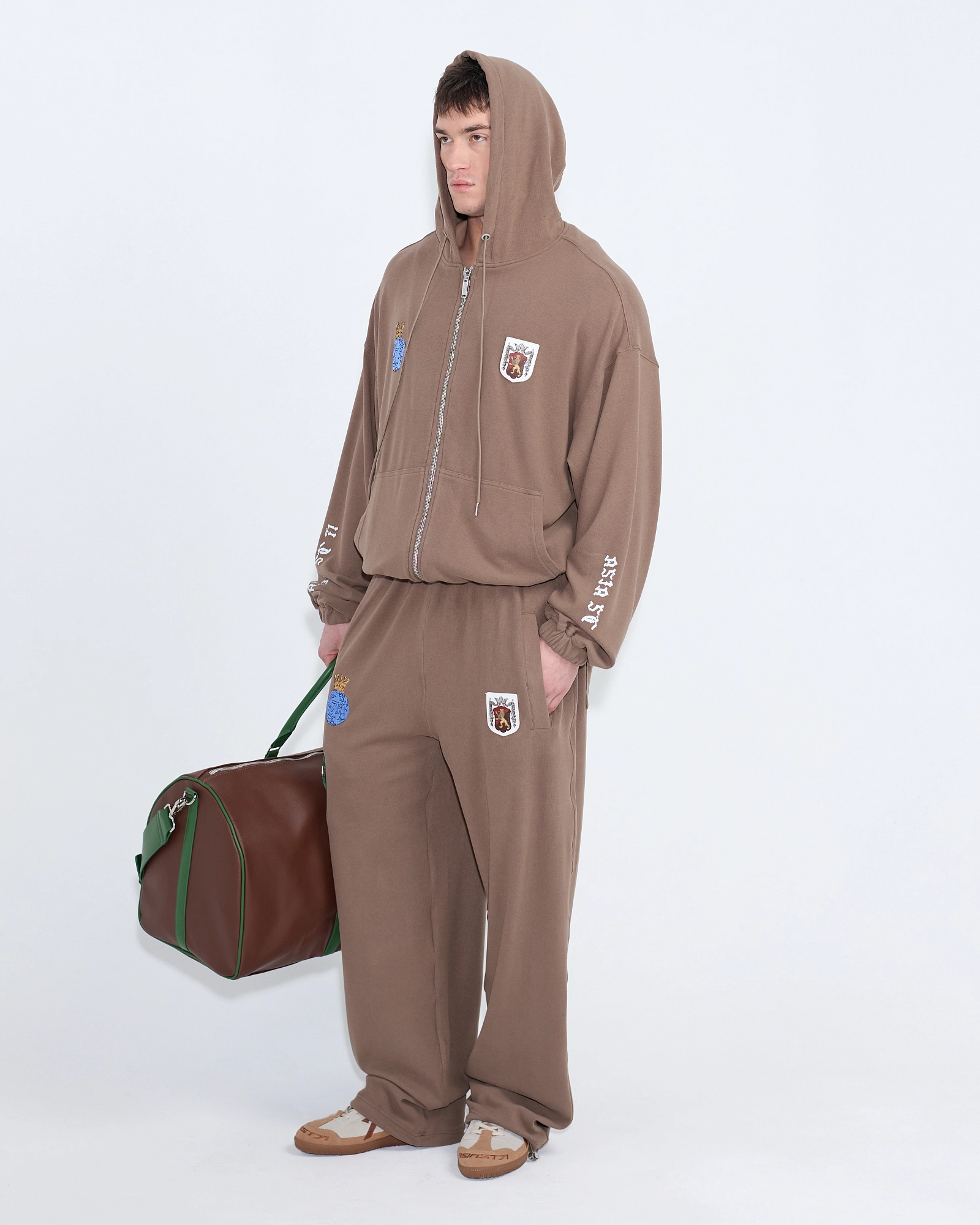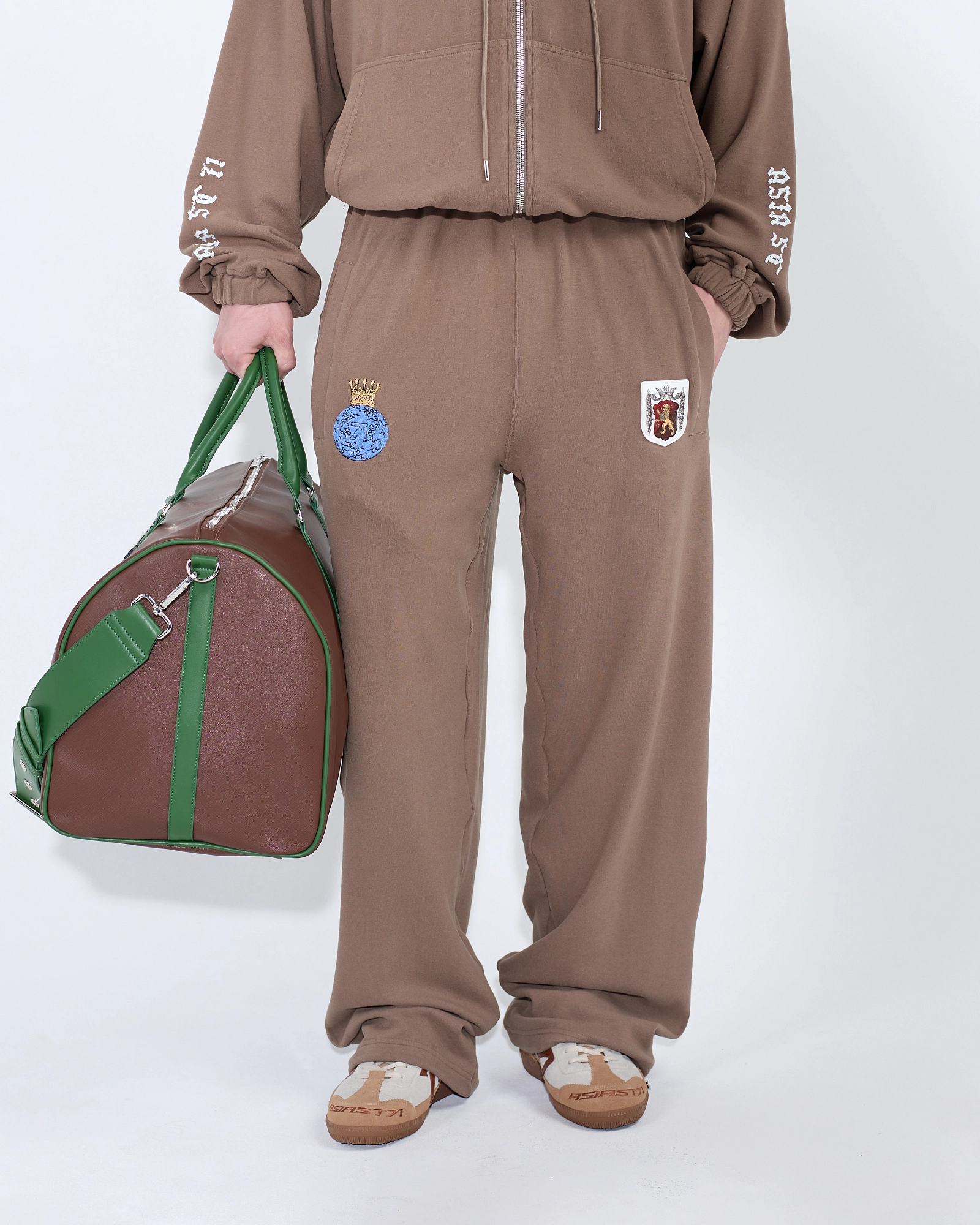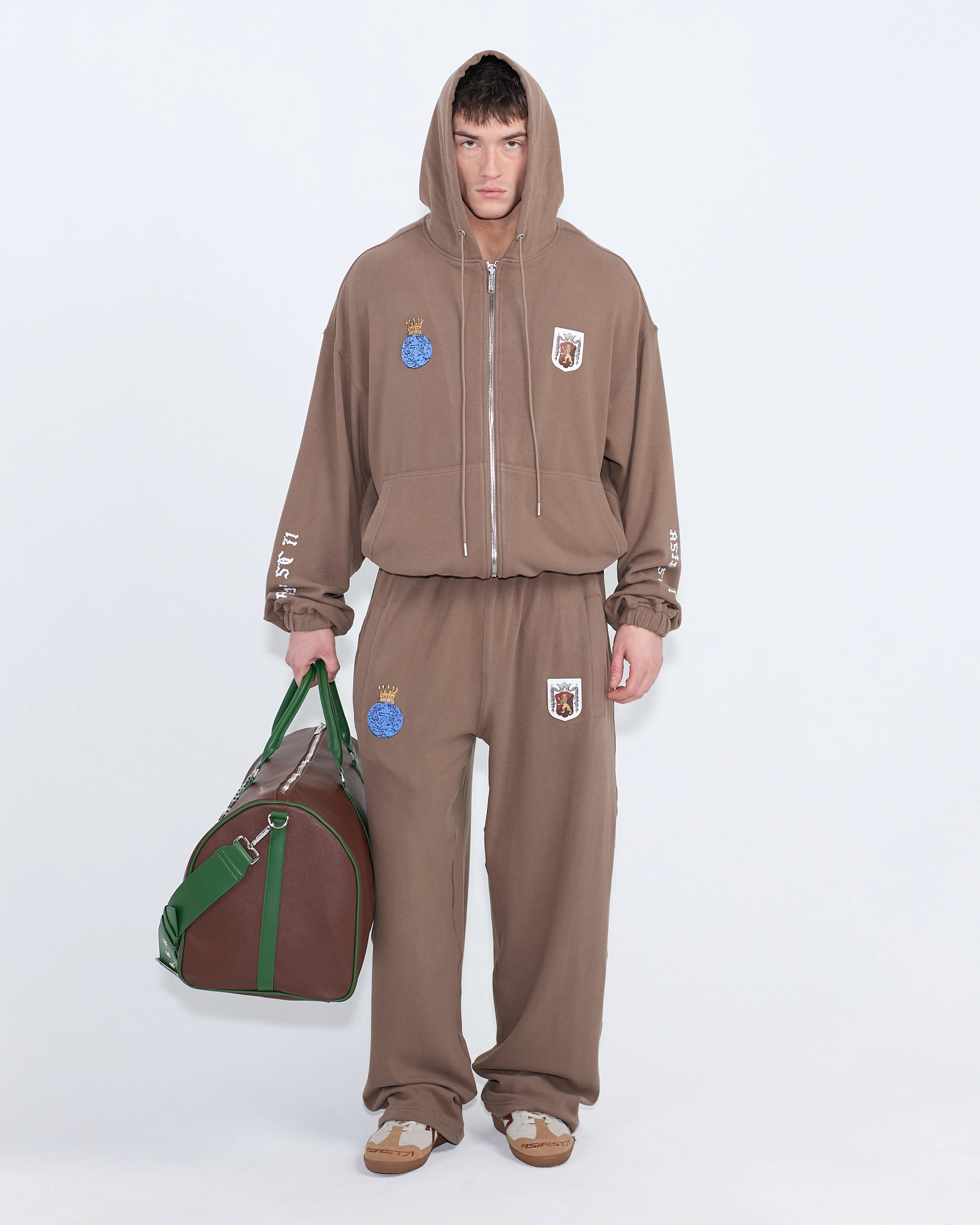 Костюм из мягкого хлопка. Удлиненные рукава дополнены манжетами для удобства в носке, а на лицевой части размещены карман-кенгуру. Джоггеры дополнены прорезными карманами и плотным поясом, обеспечивающим надежную посадку. В качестве акцентов на изделие нанесены патчи с логотипом в готическом стиле. Металлический зажим шнуровки является отдельной фурнитурой и не входит в комплект к изделию. При наличии зажима, он будет вложен в Ваш заказ.