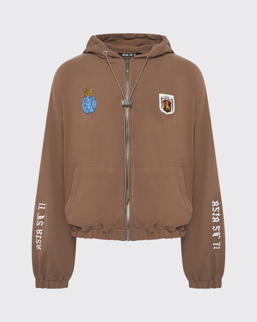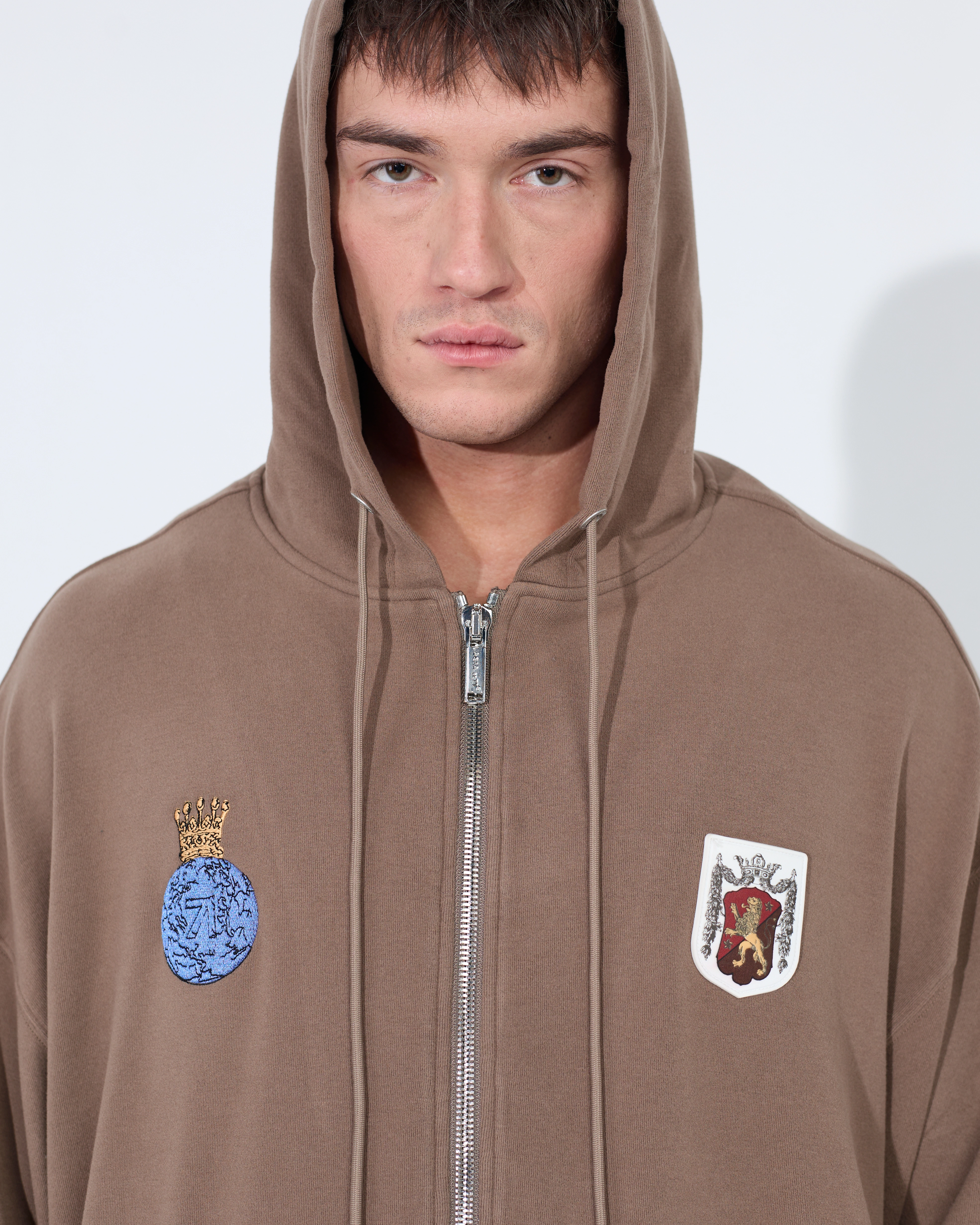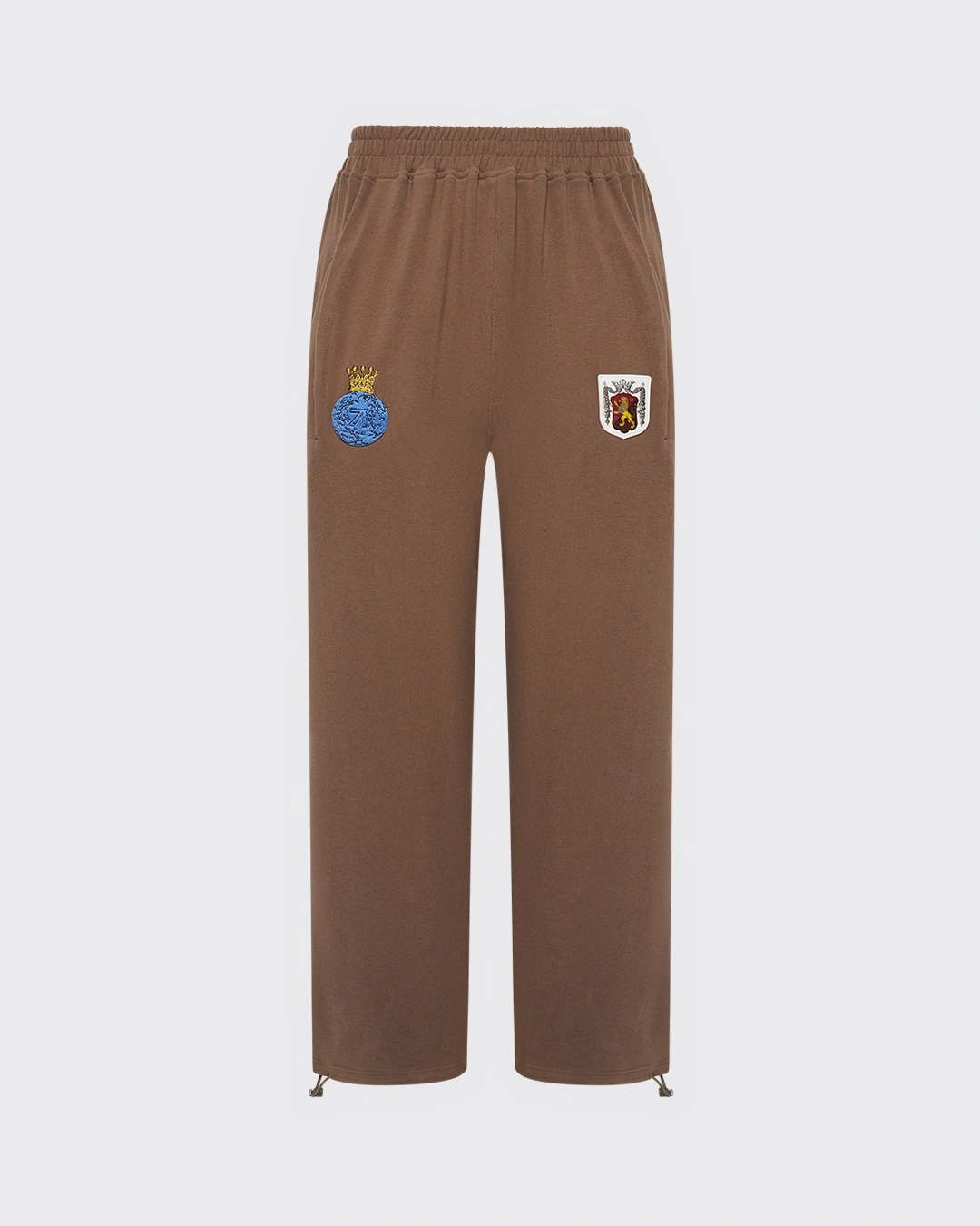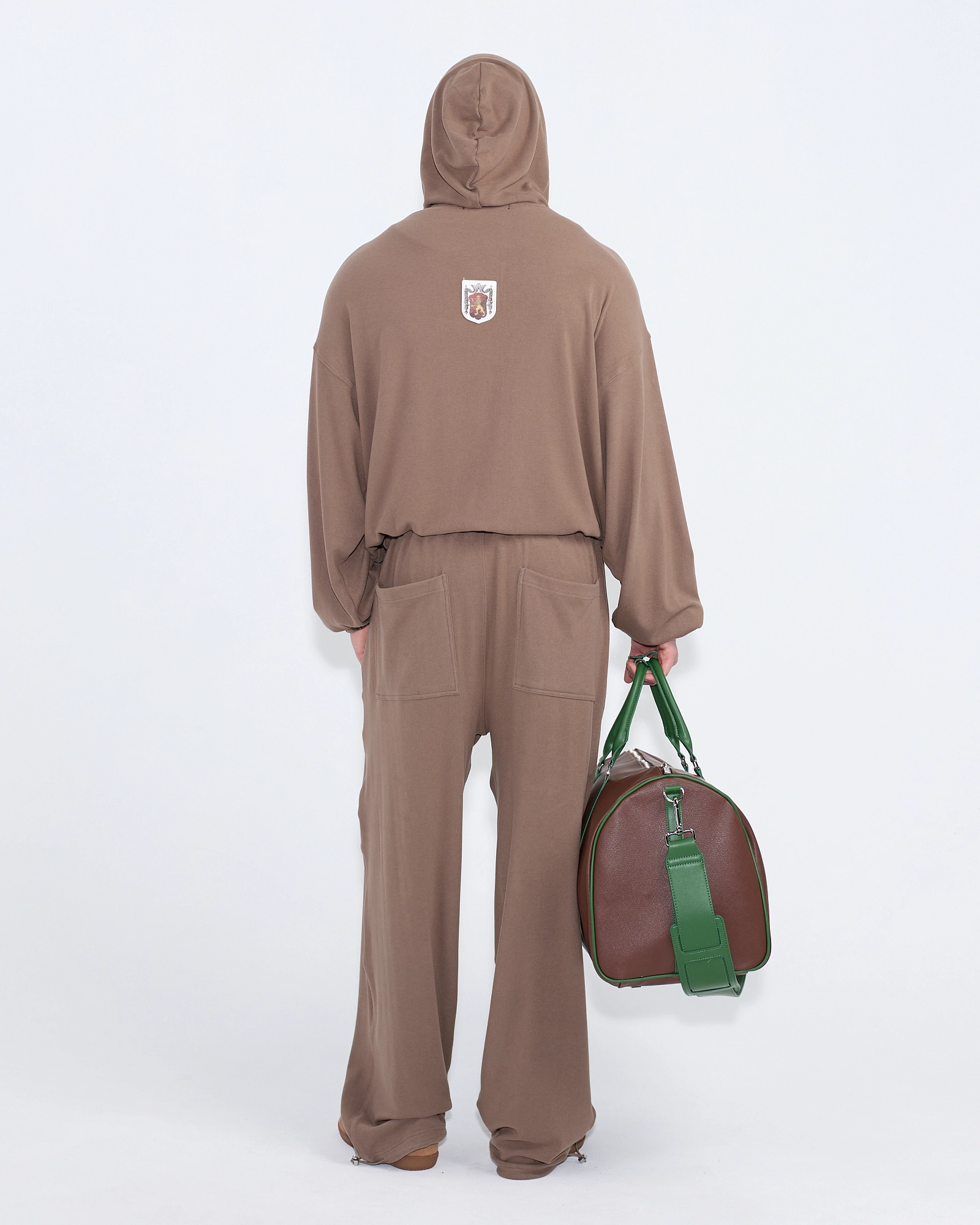 Костюм из мягкого хлопка. Удлиненные рукава дополнены манжетами для удобства в носке, а на лицевой части размещены карман-кенгуру. Джоггеры дополнены прорезными карманами и плотным поясом, обеспечивающим надежную посадку. В качестве акцентов на изделие нанесены патчи с логотипом в готическом стиле. Металлический зажим шнуровки является отдельной фурнитурой и не входит в комплект к изделию. При наличии зажима, он будет вложен в Ваш заказ.