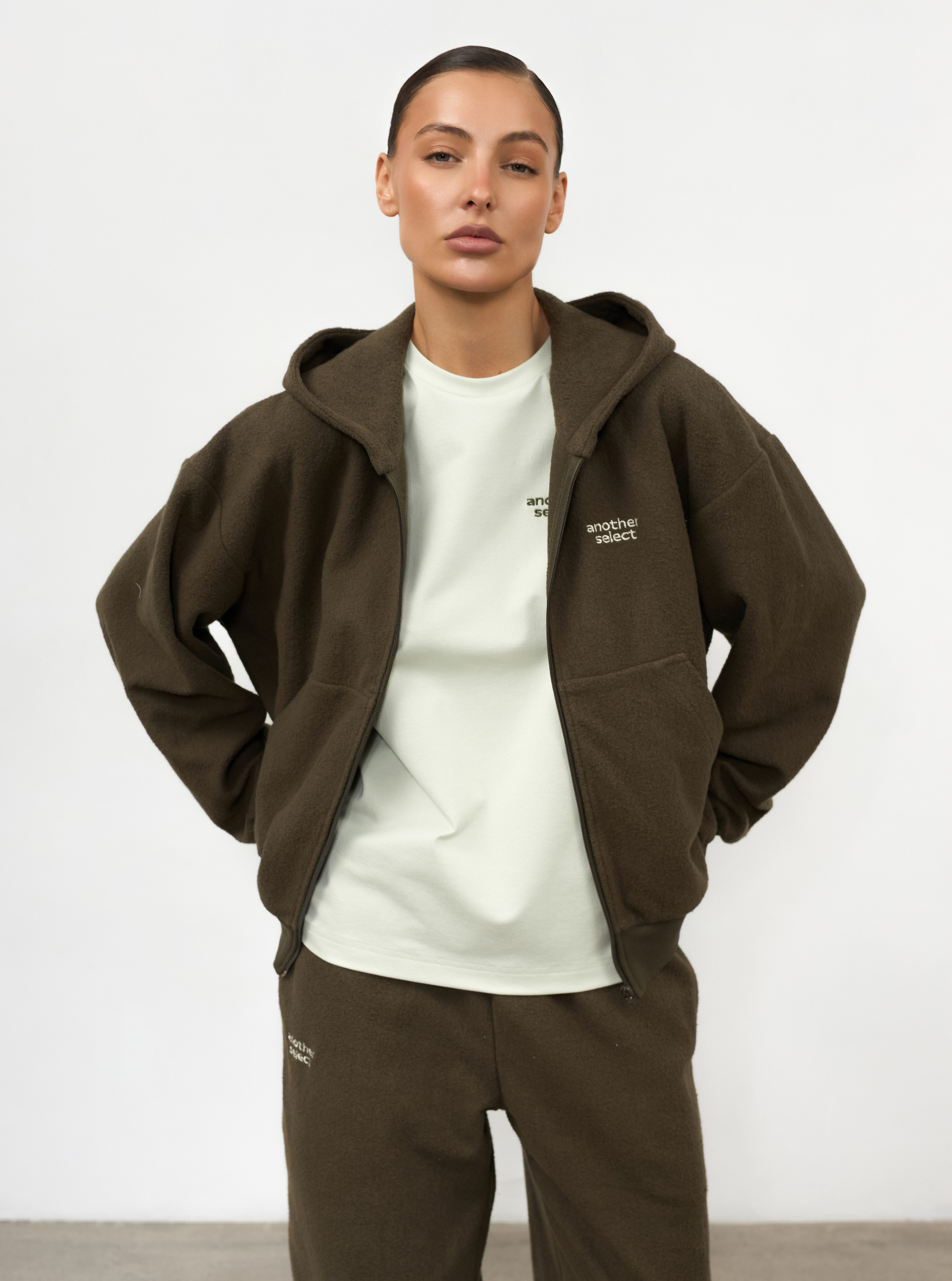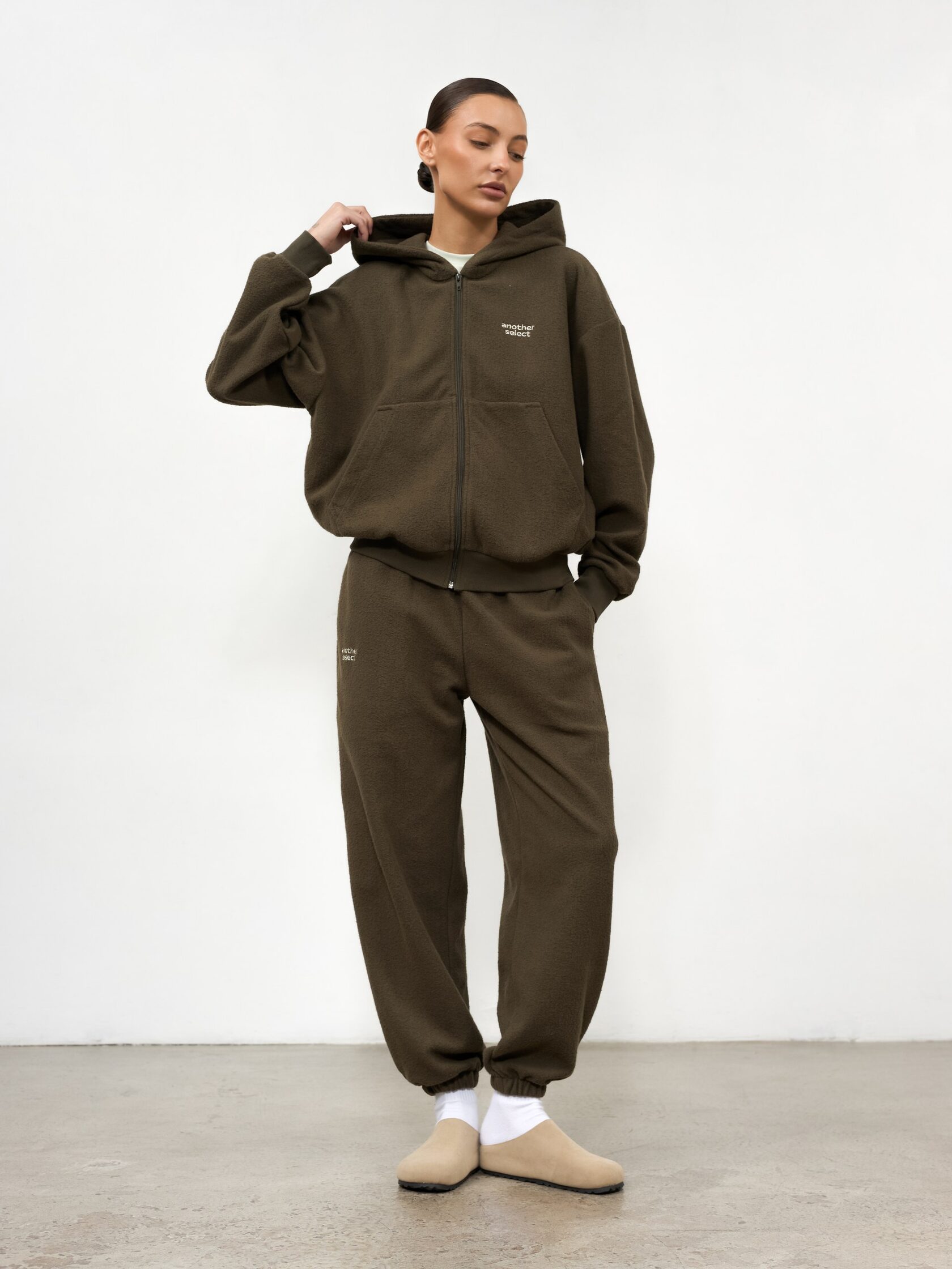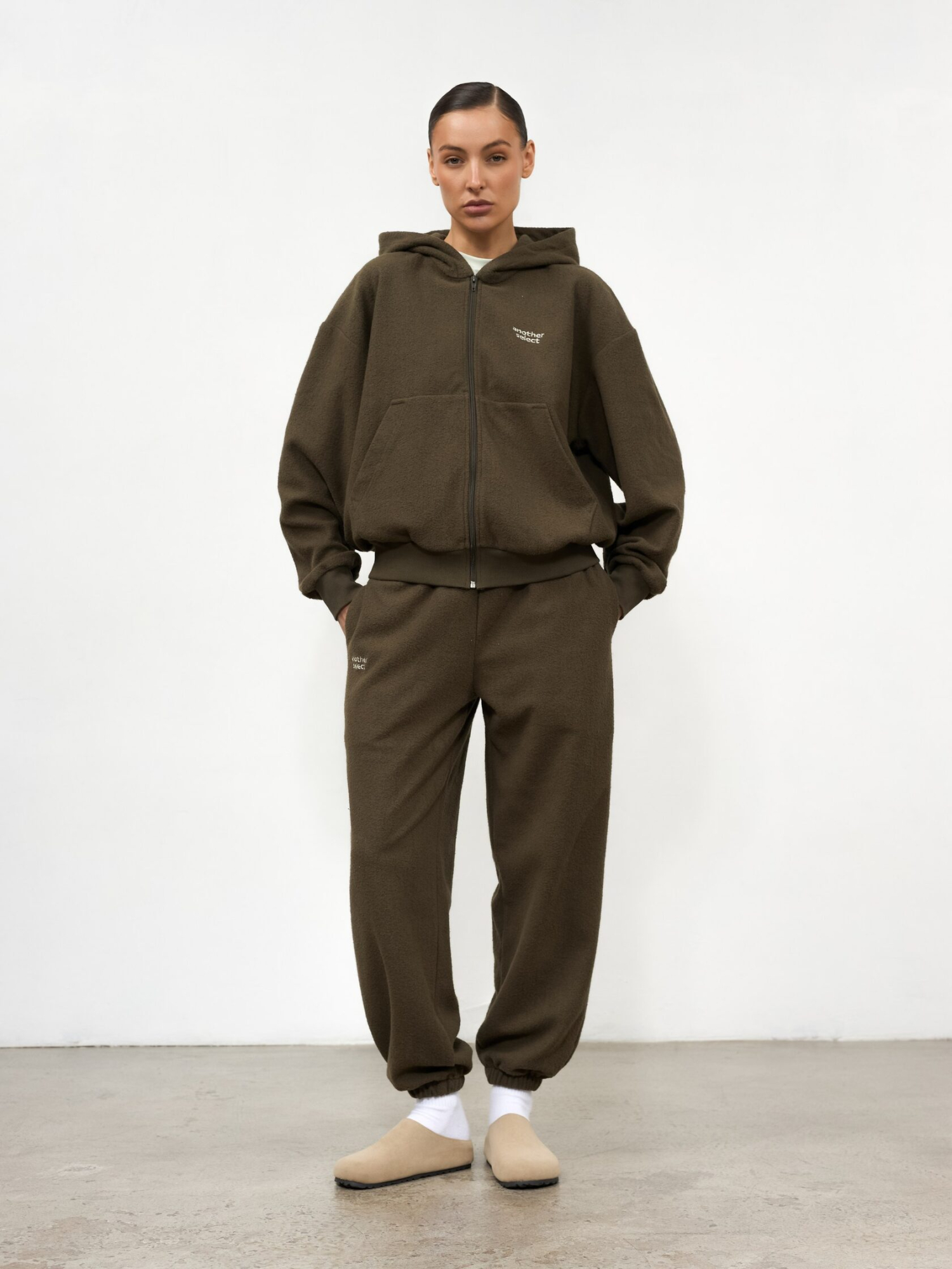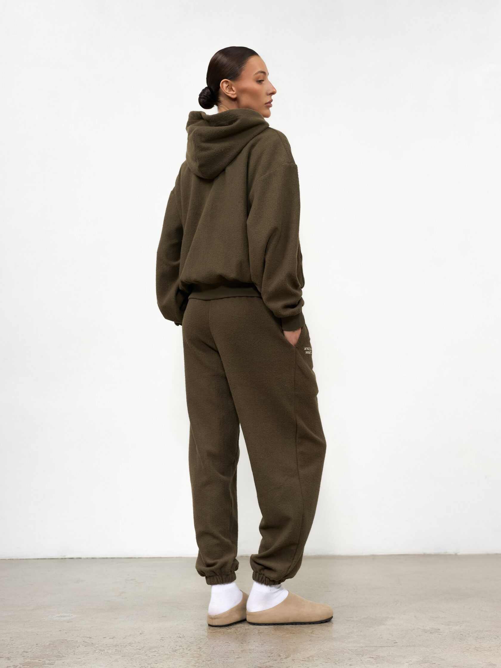 Костюм из фактурной ткани. Худи и джоггеры с вышитым логотипом. Худи дополнено накладными карманами для практичности и выполнено со спущенной линией плеч для комфорта.