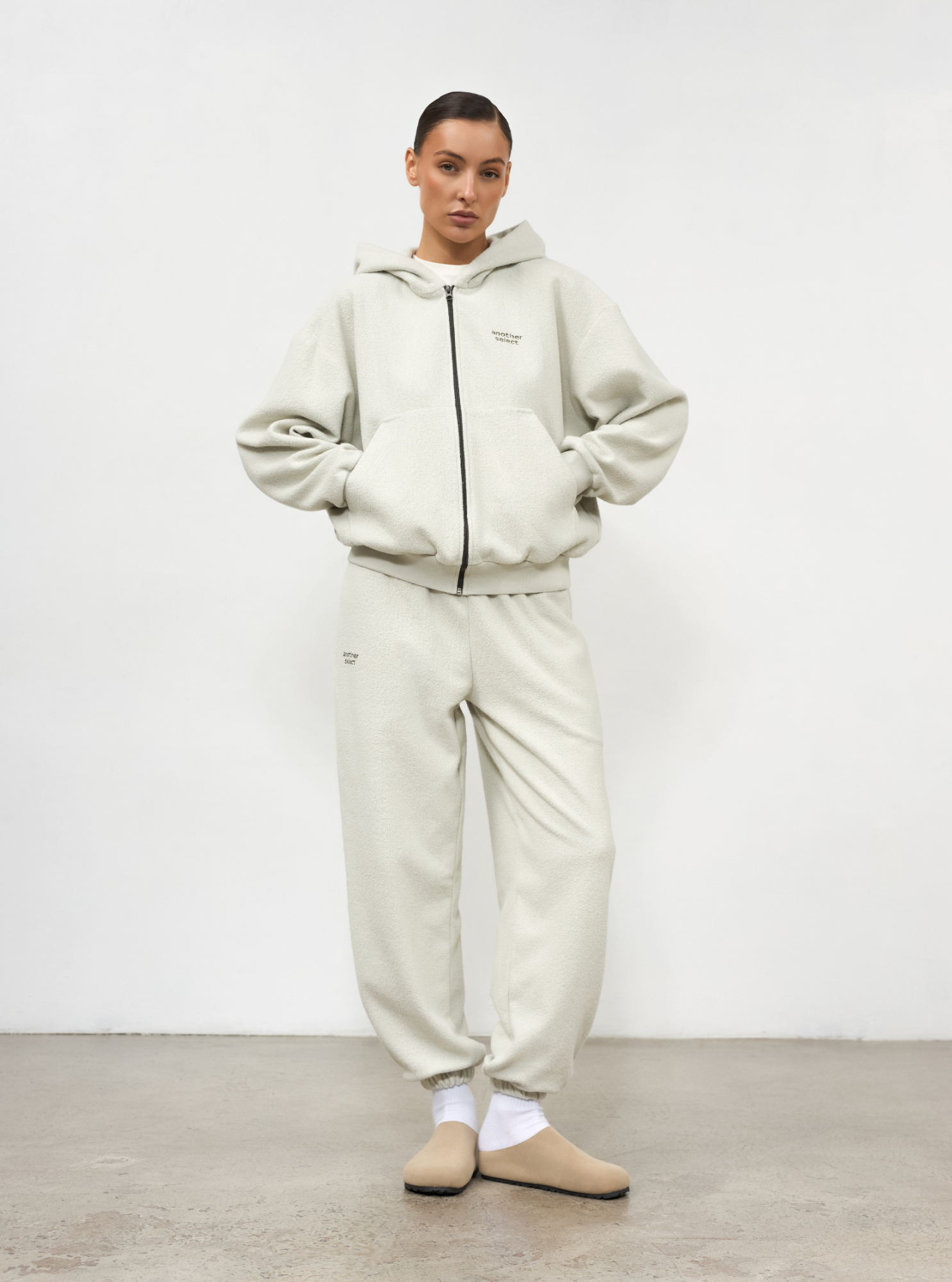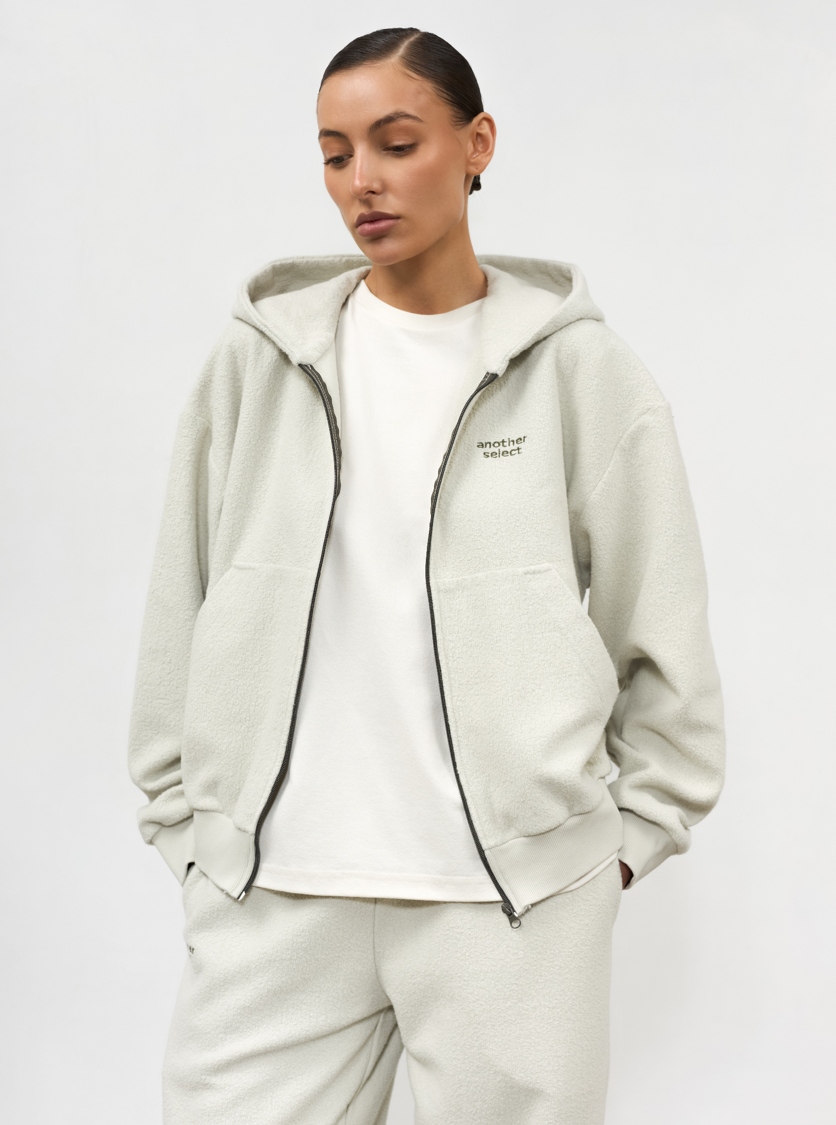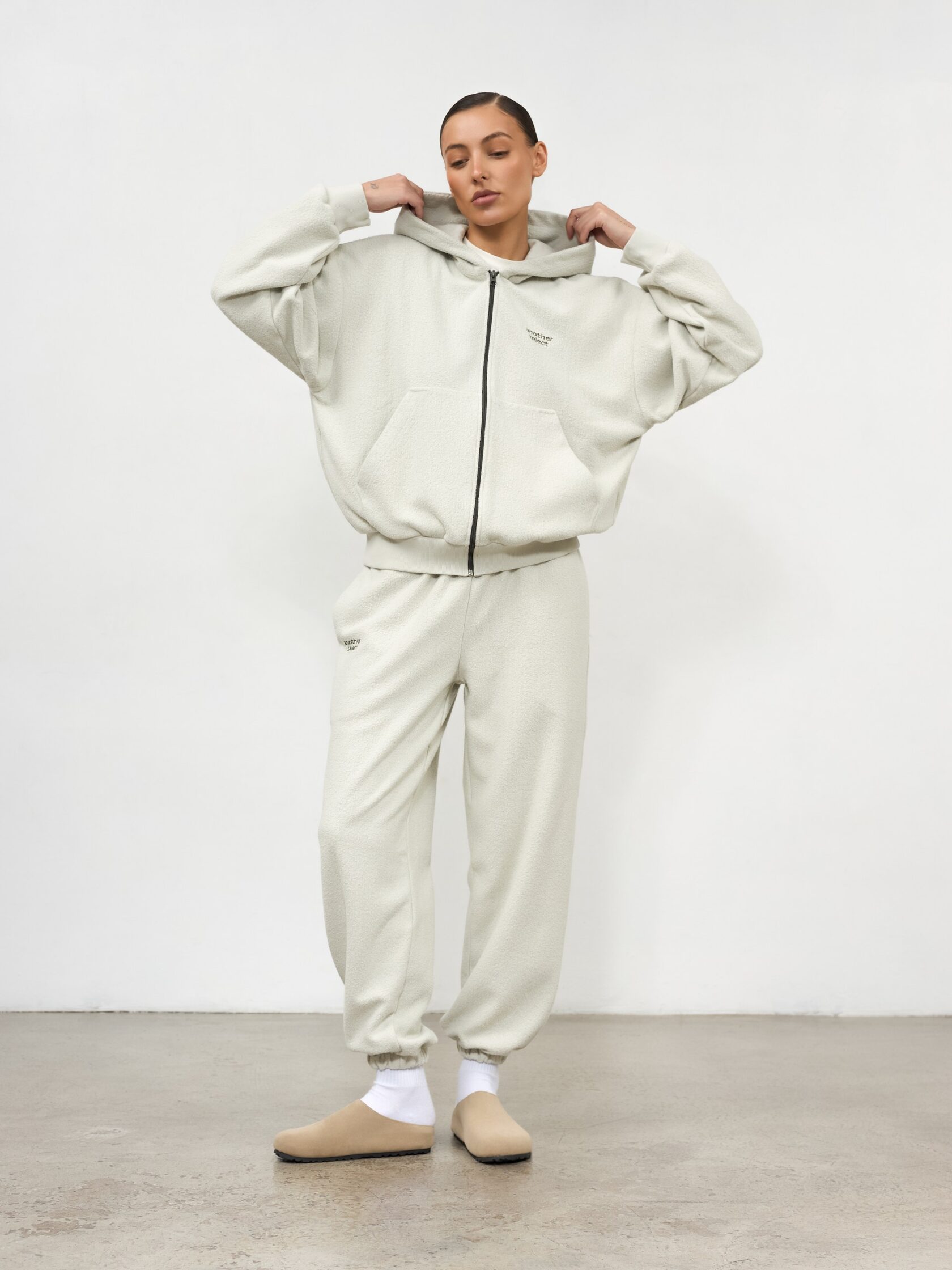 Костюм из фактурной ткани. Худи и джоггеры с вышитым логотипом. Худи дополнено накладными карманами для практичности и выполнено со спущенной линией плеч для комфорта.