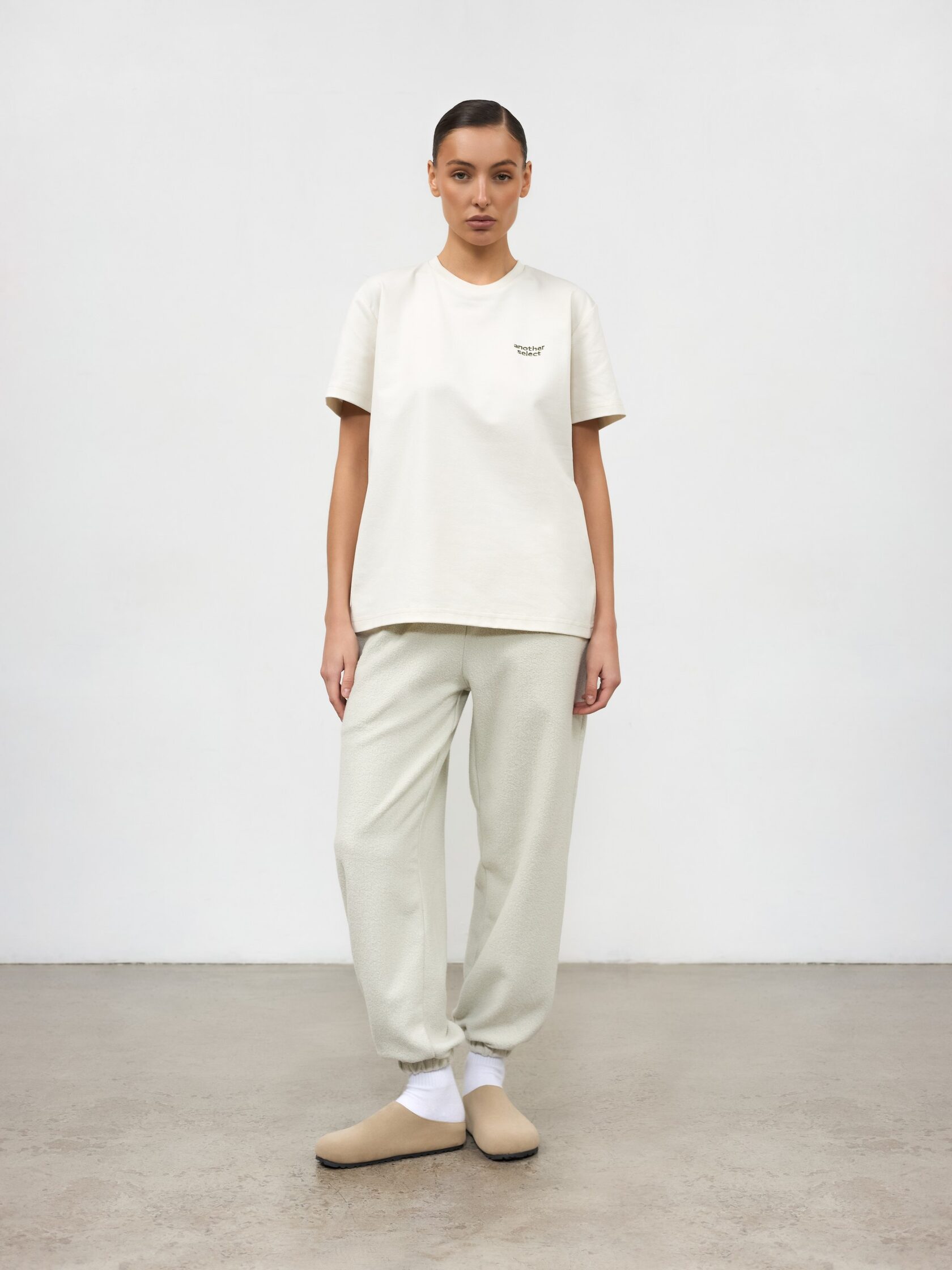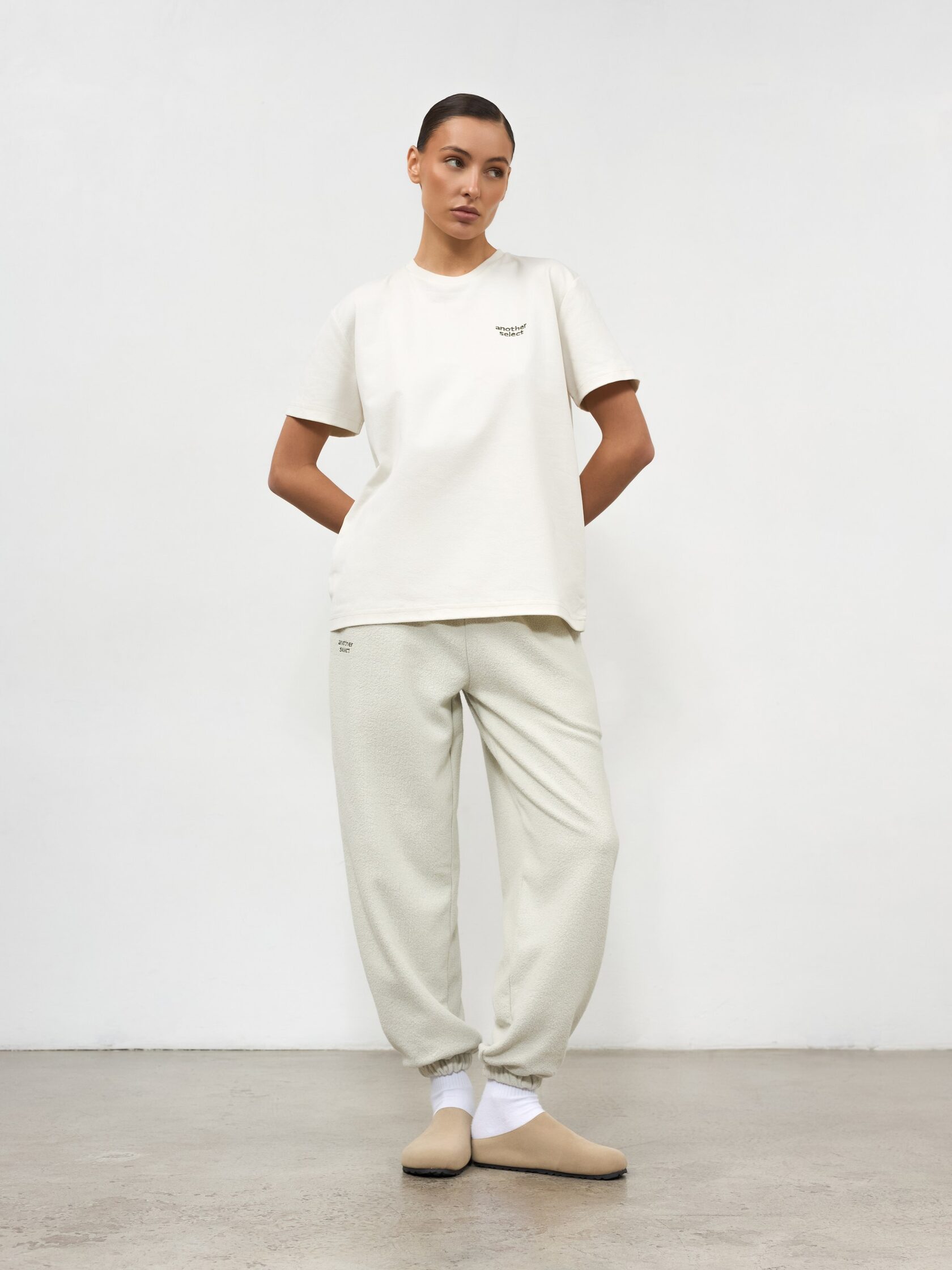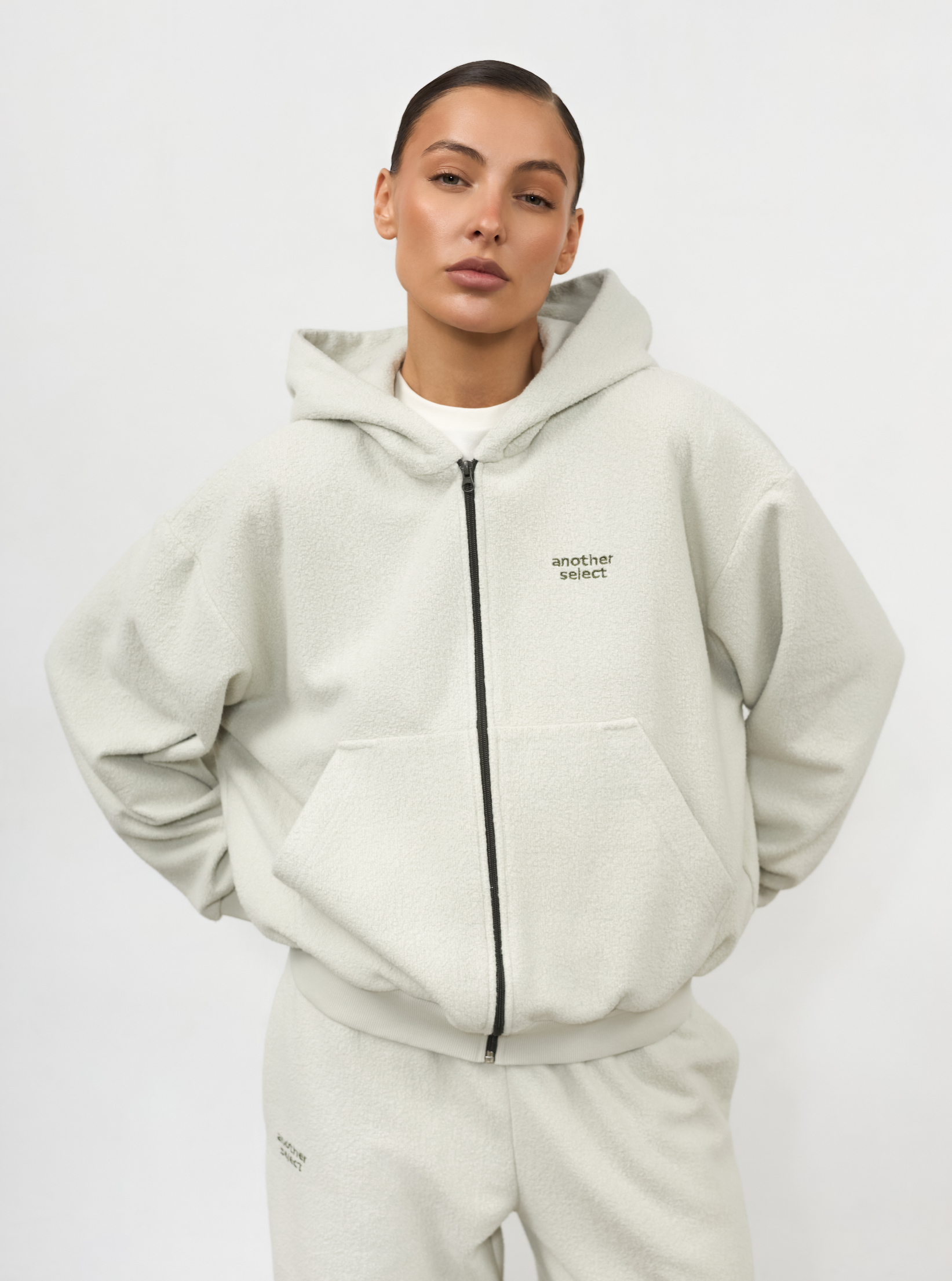 Костюм из фактурной ткани. Худи и джоггеры с вышитым логотипом. Худи дополнено накладными карманами для практичности и выполнено со спущенной линией плеч для комфорта.