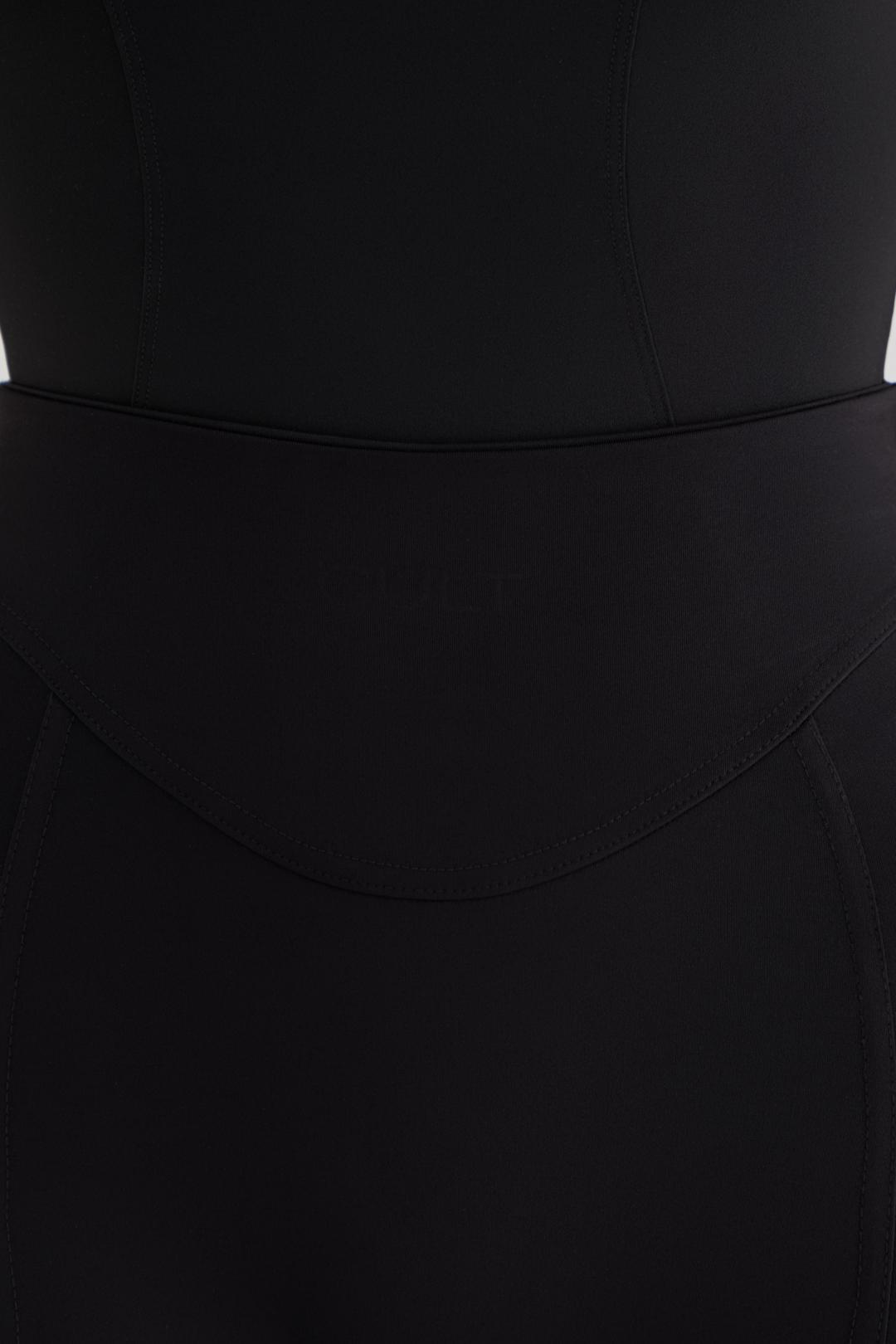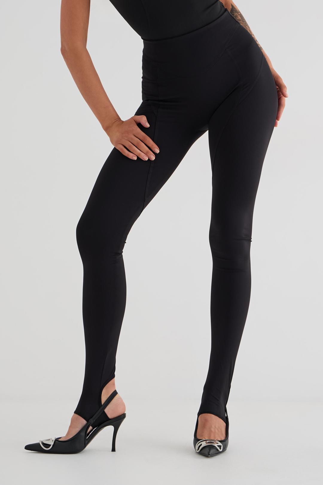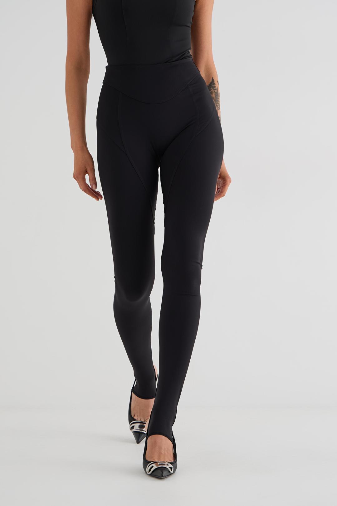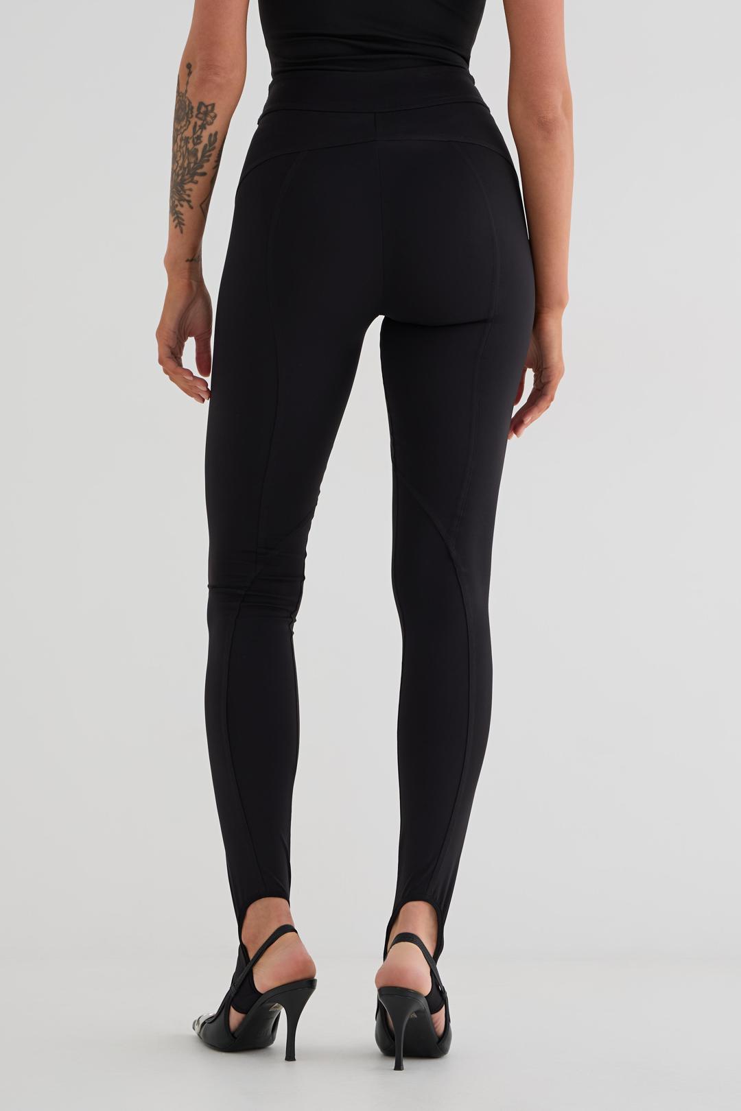 Леггинсы из трикотажа с поясом и фигурными резами. По низу штрипки для стопы. Спереди по центру брендированный принт.