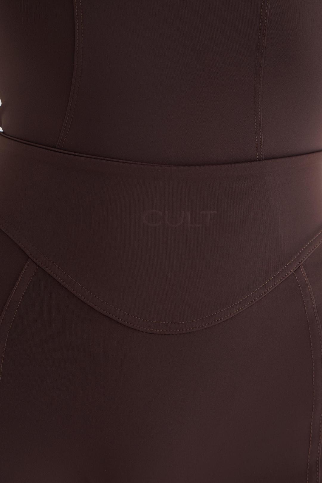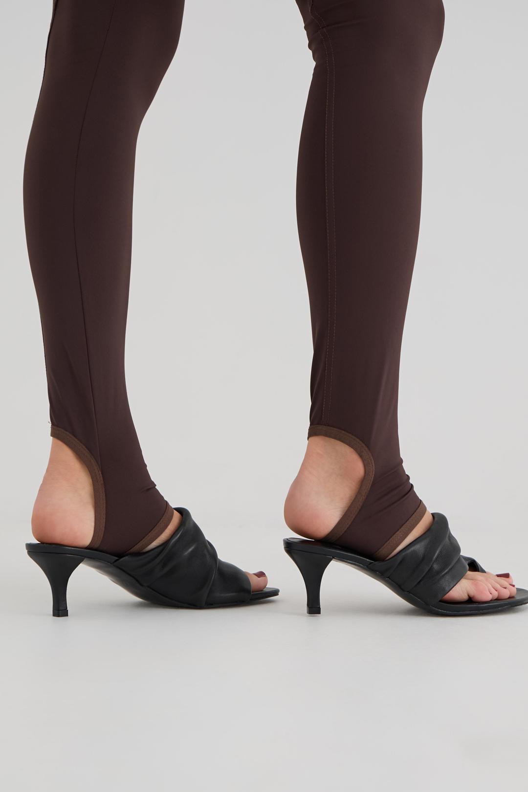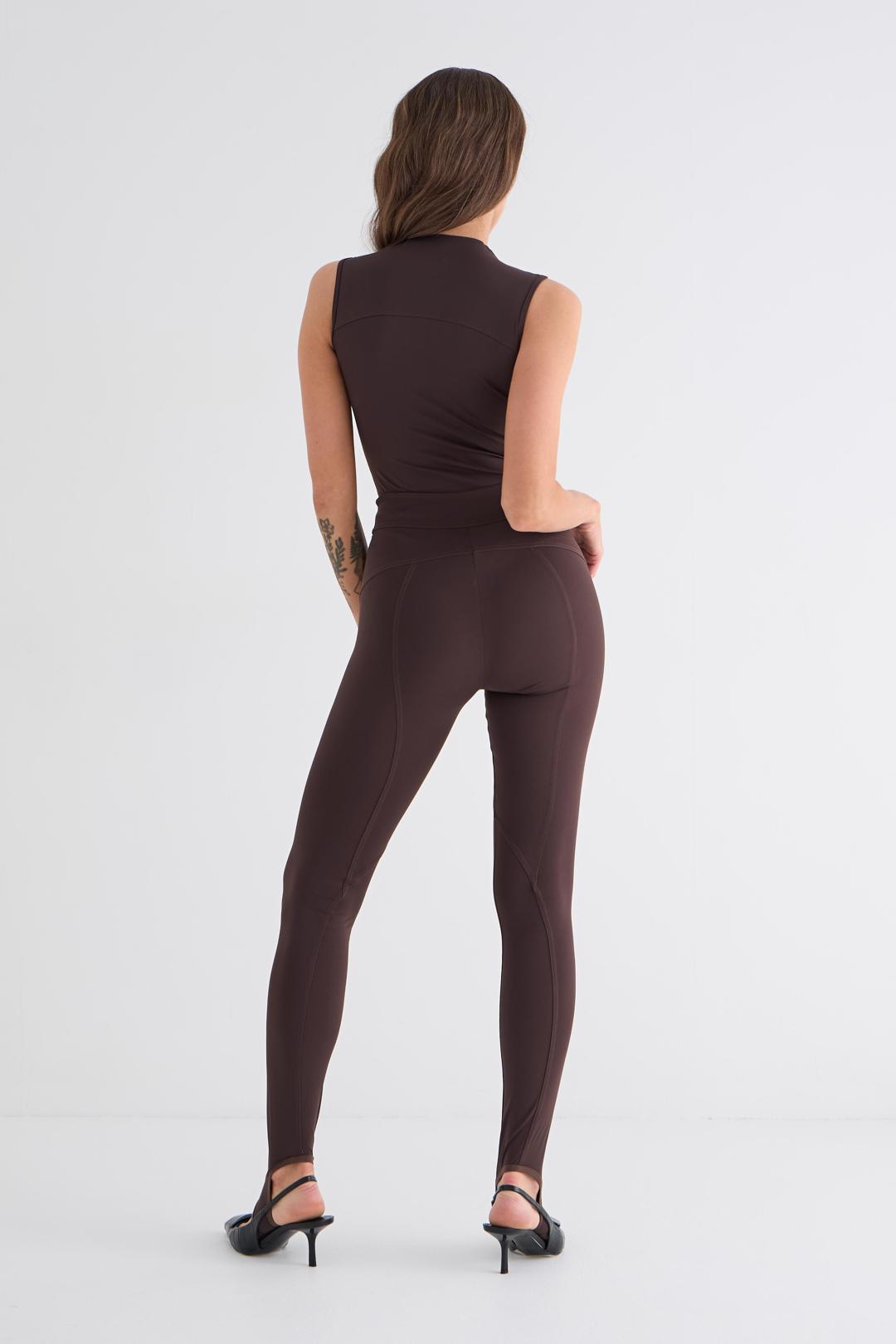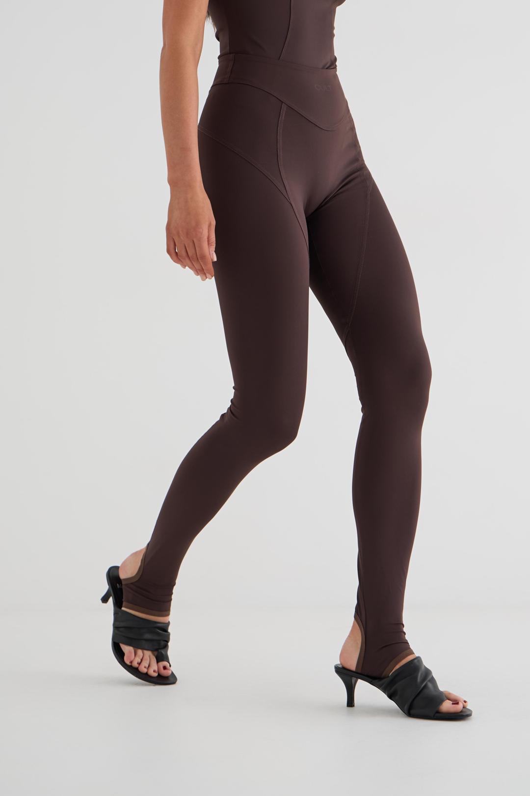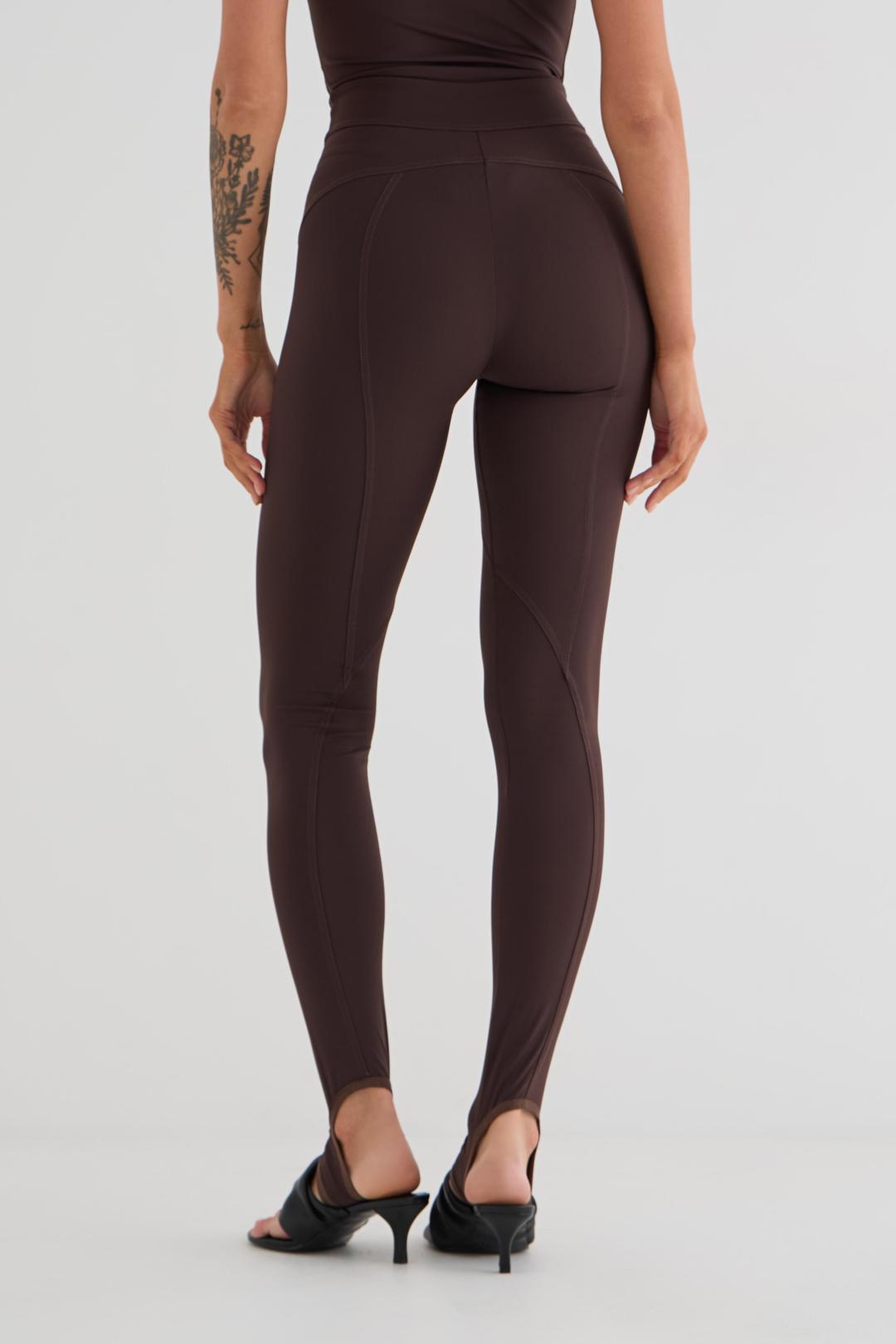 Леггинсы из трикотажа с поясом и фигурными резами. По низу штрипки для стопы. Спереди по центру брендированный принт.