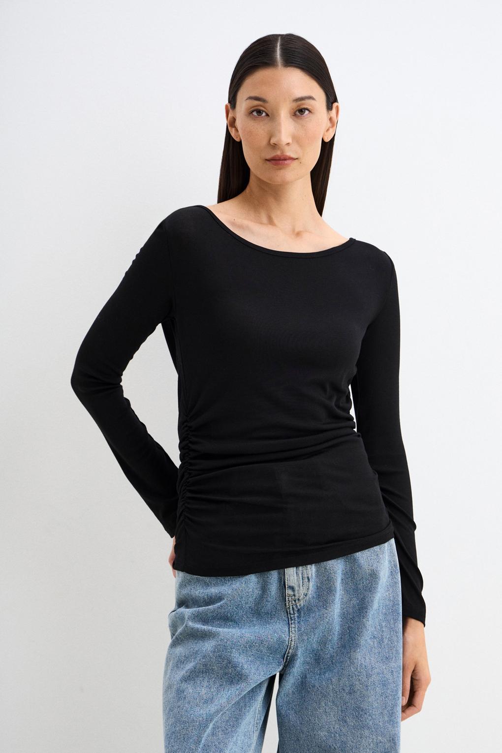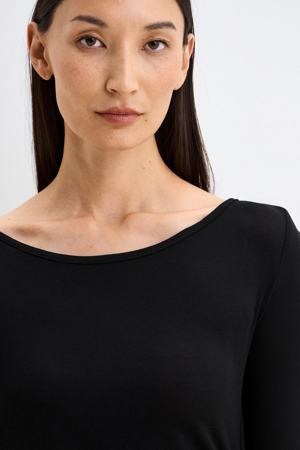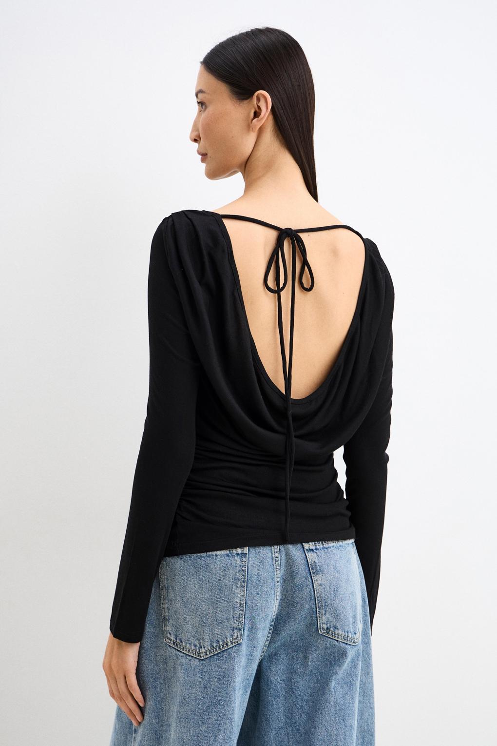 Черный лонгслив с округлым вырезом спереди и открытой спиной. Выполнен из мягкого эластичного трикотажа. Прилегающая посадка повторяет контуры корпуса. Конструктивная линия спинки формирует устойчивую форму изделия при носке.
