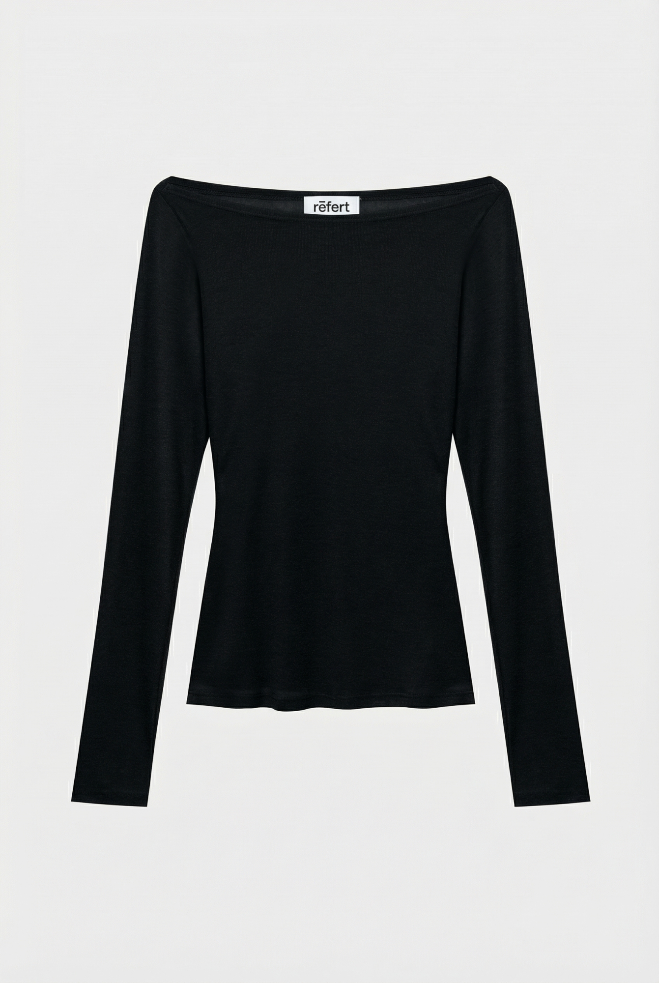 Чёрный лонгслив из мягкой ткани на основе вискозы с добавлением эластана. Элегантный вырез-лодочка. Подчеркнёт ваш стиль в любых образах — от повседневных до коктейльных.