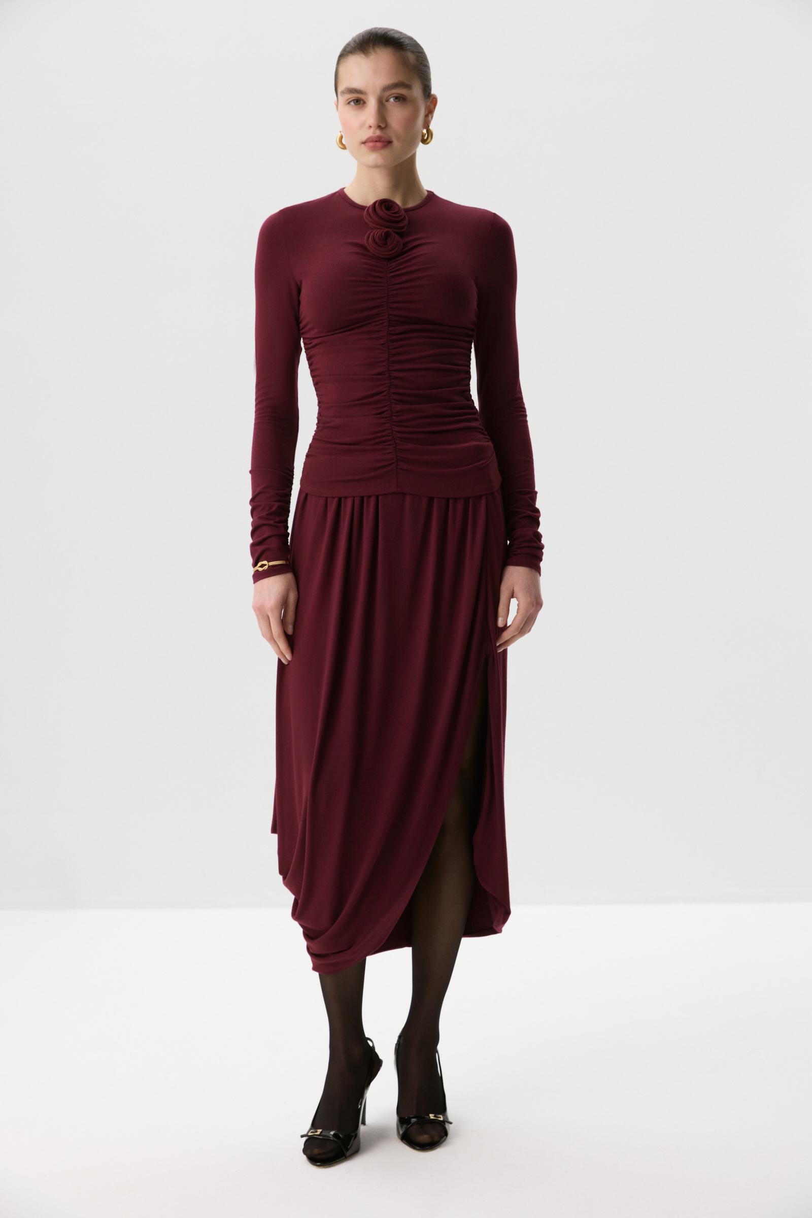 Лонгслив из плотного вискозного трикотажа. Длинный втачной рукав и круглая горловина. По полочке декоративная сборка. На горловине полочки декоративная объемная роза из основного материала.