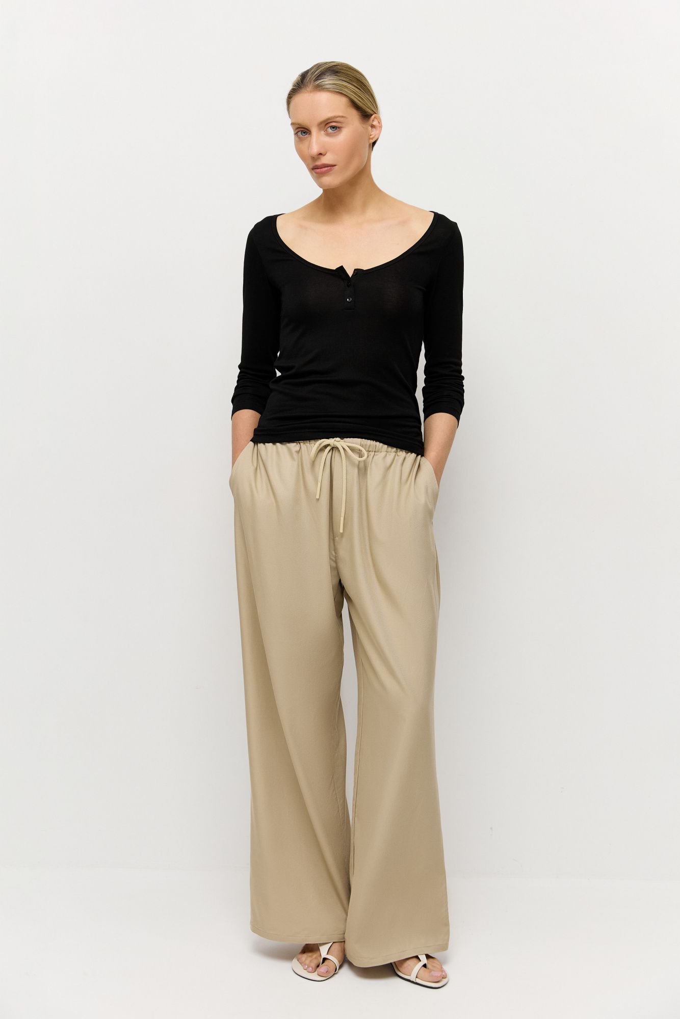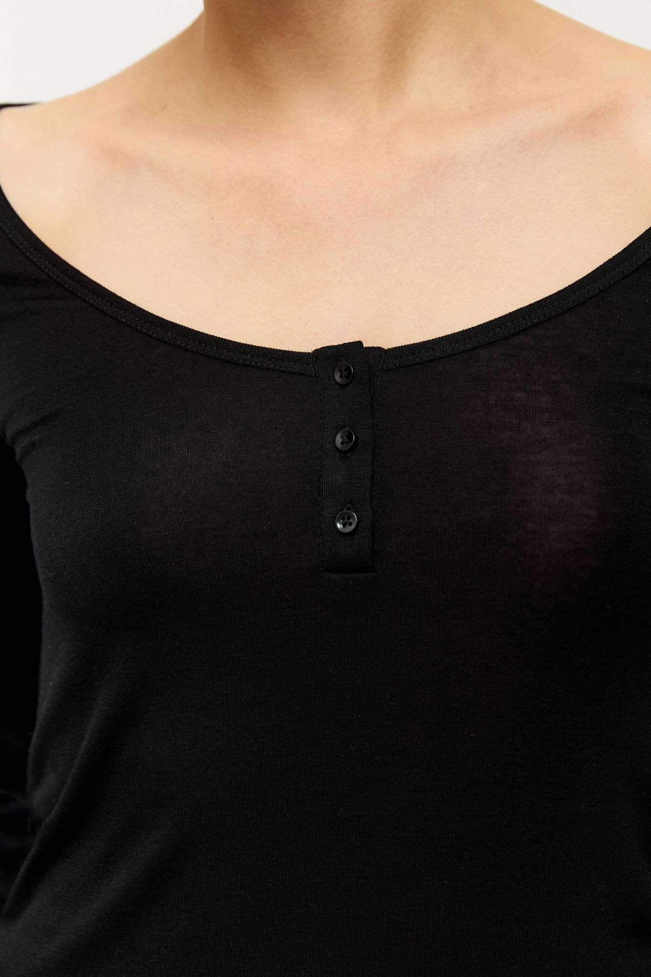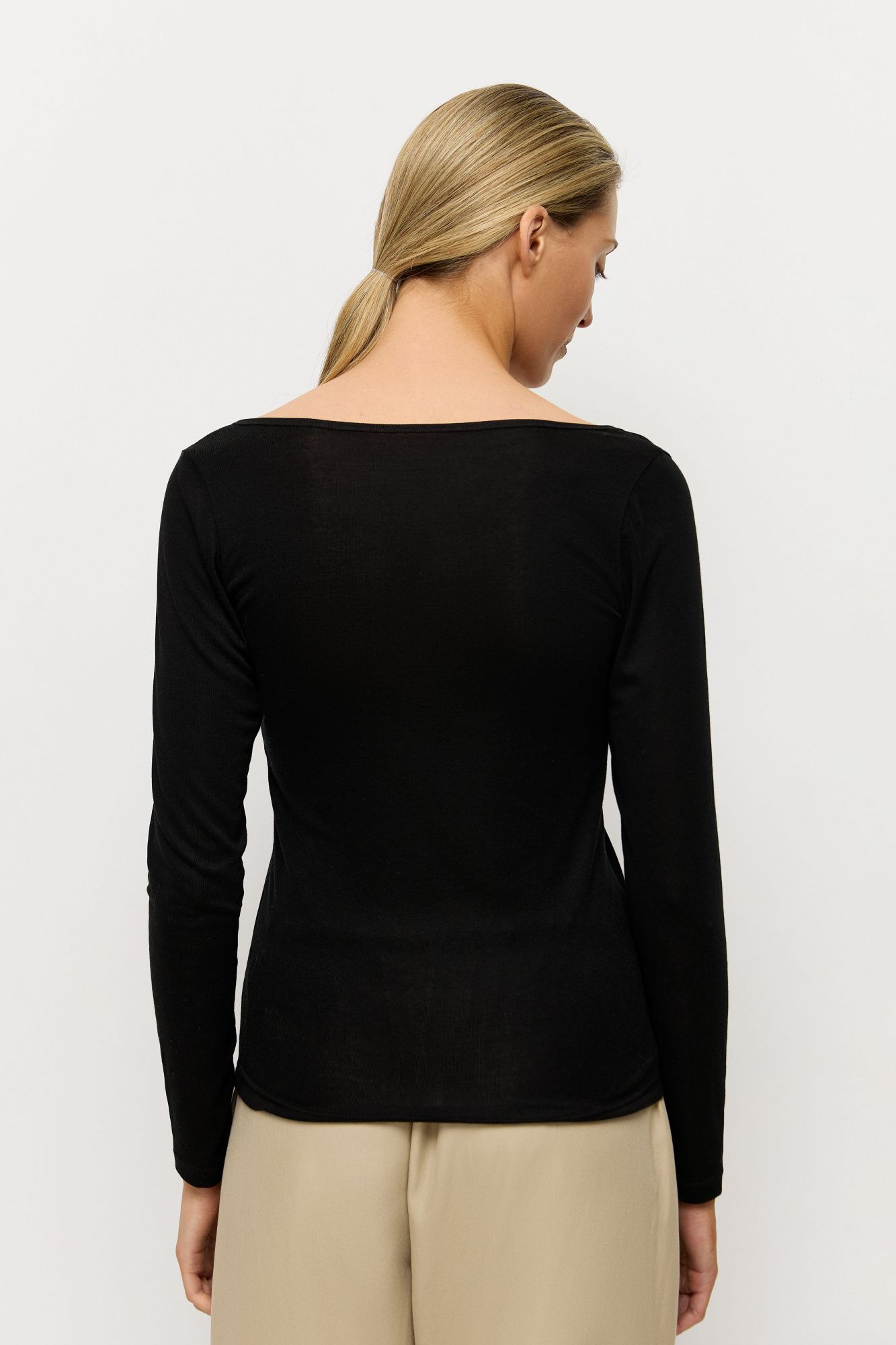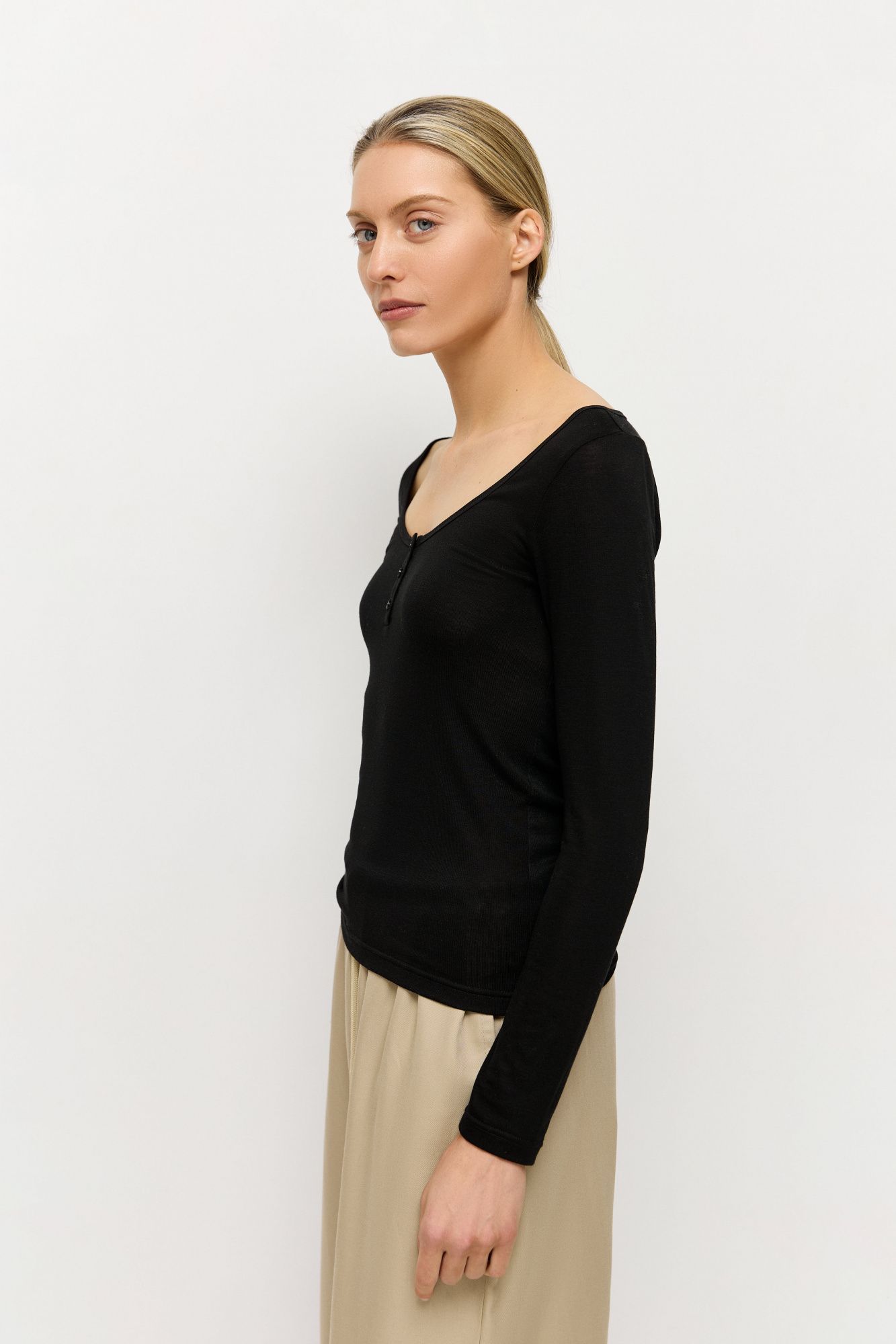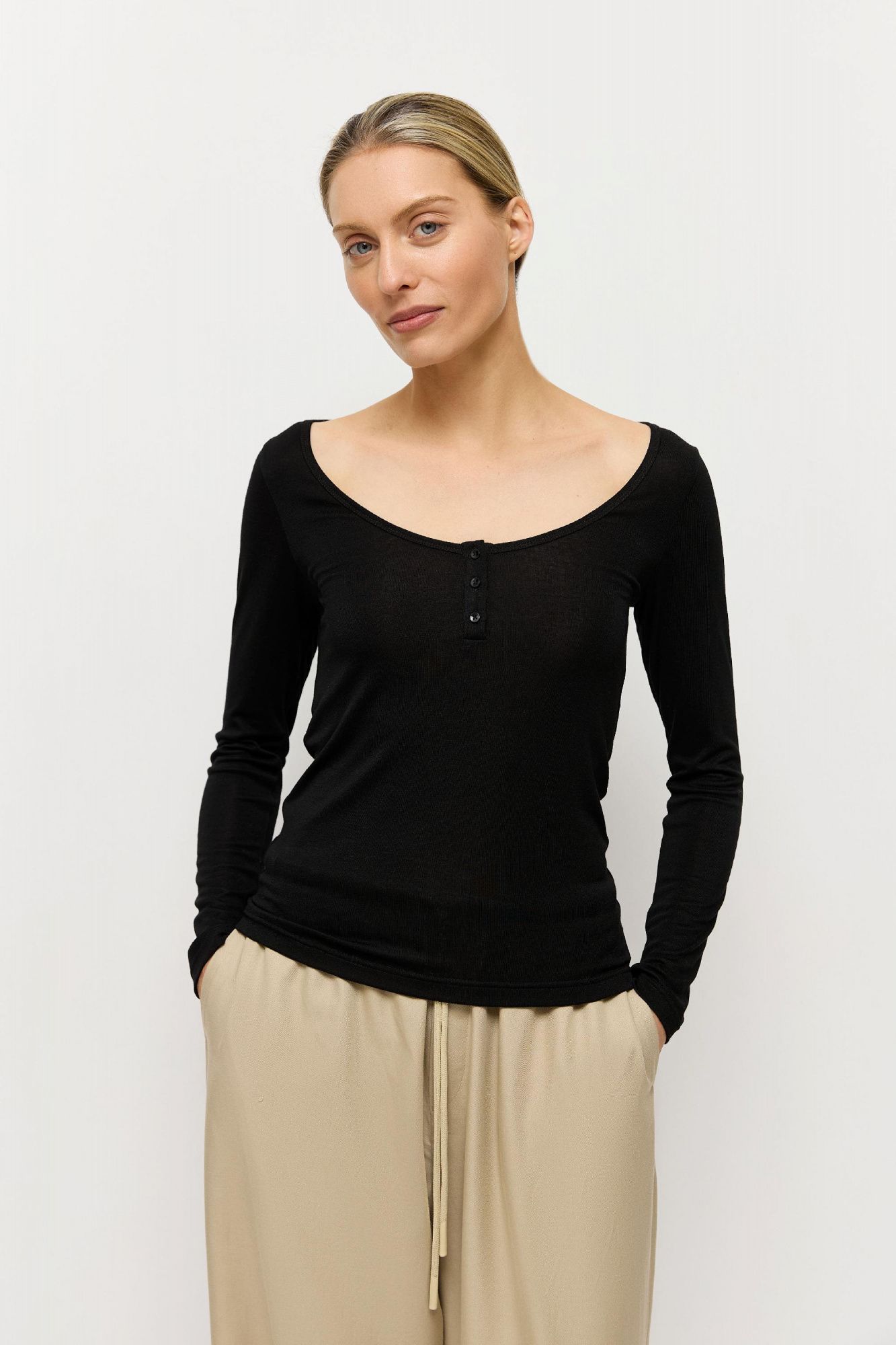 Лонгслив сшит из тенсела с небольшим добавлением шерсти, тонкого и нежного к коже материала.