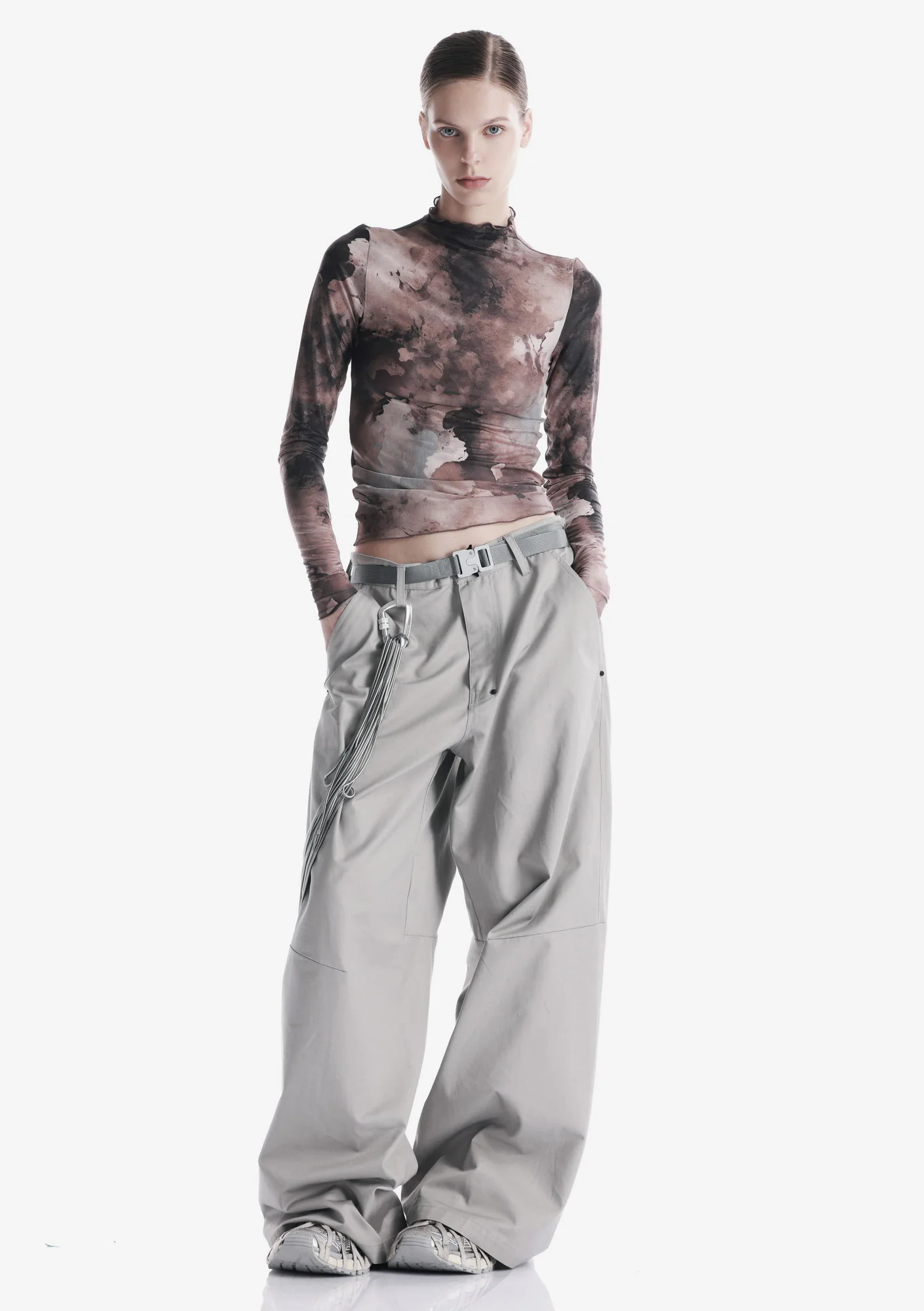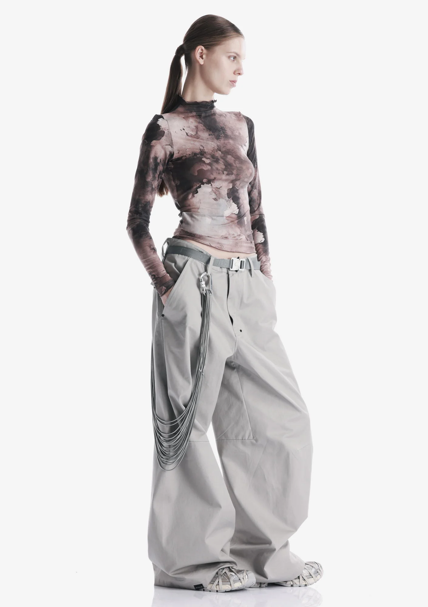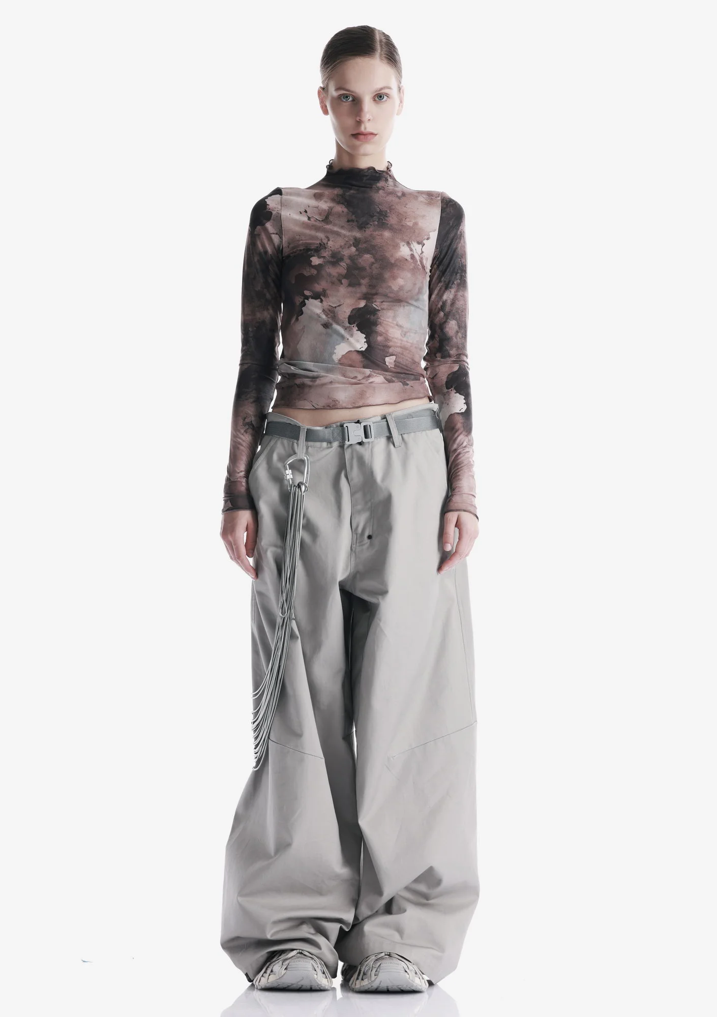 Топ из полупрозрачного тянущегося материала с высокой горловиной. Полупрозрачная структура создаёт лаконичный, графичный образ и обеспечивает кмфорт в движении.