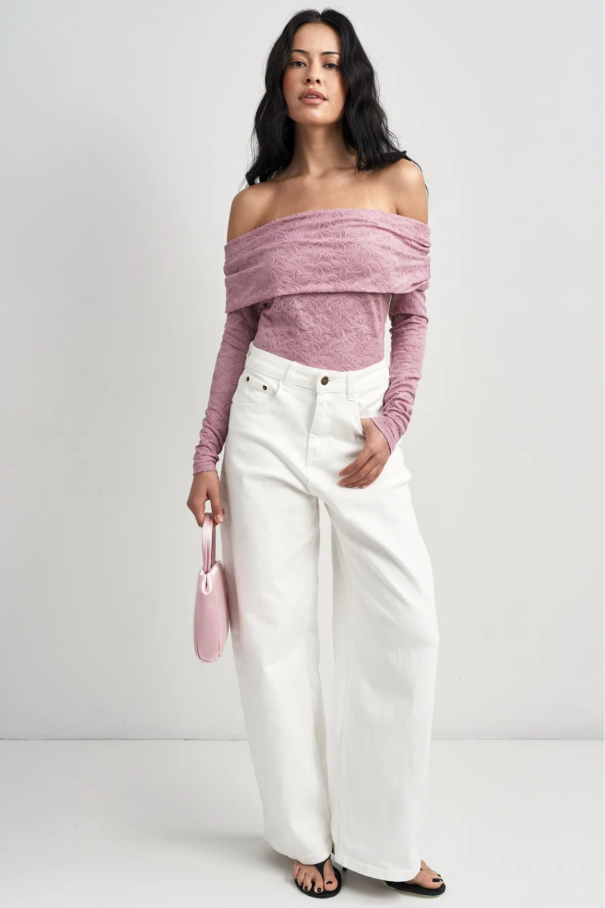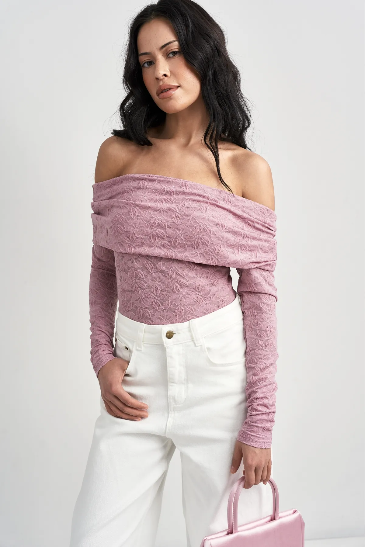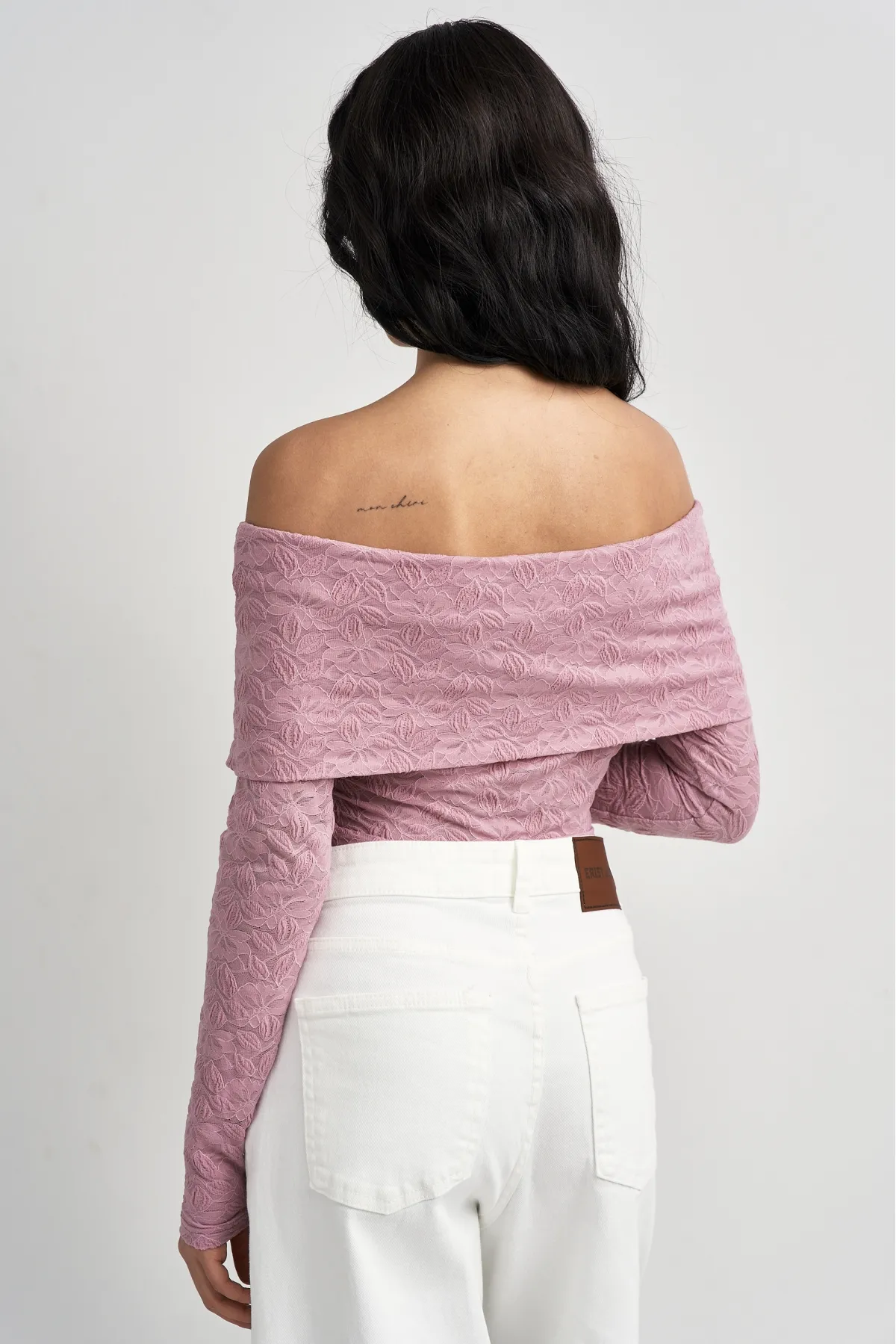 Облегающий лонгслив из ажурного полотна создаёт деликатную, немного прозрачную текстуру, которая подчёркивает силуэт и добавляет романтичной лёгкости. Открытые плечи делают модель современной, а плотная посадка — базовой и универсальной одновременно. Идеален как самостоятельный элемент образа или в многослойных сочетаниях.