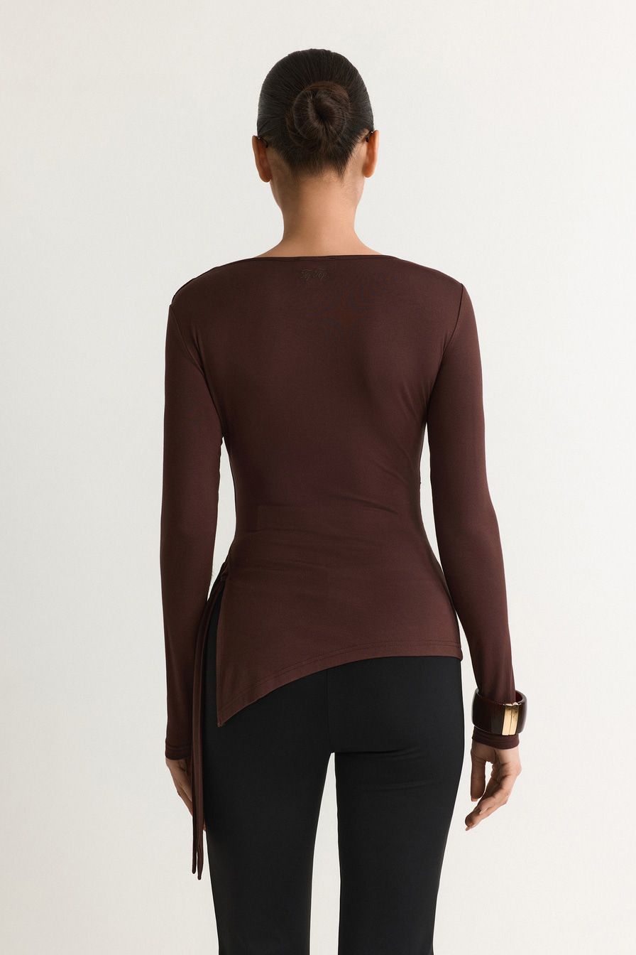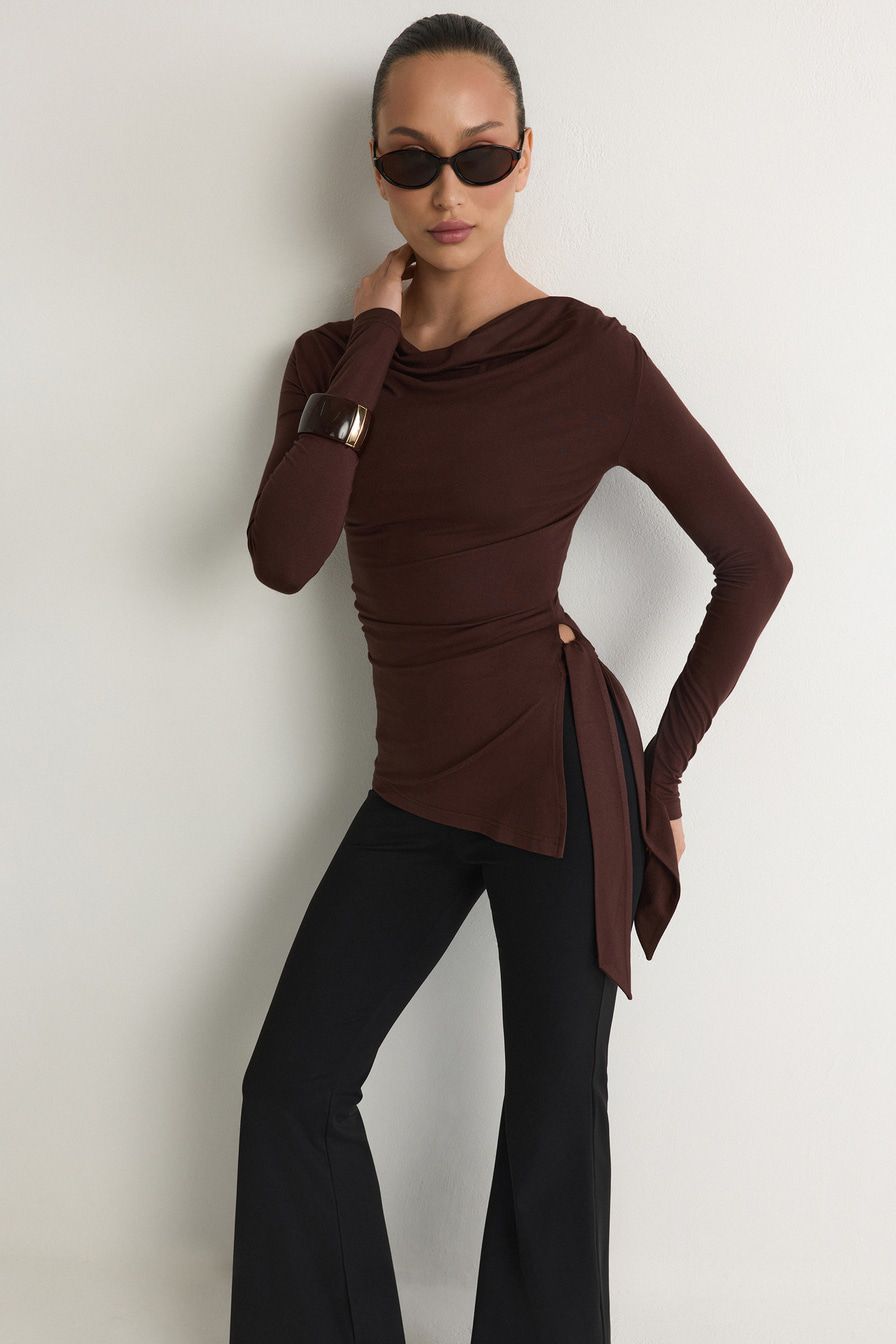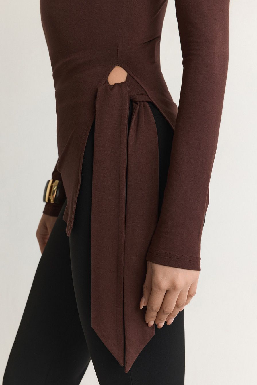 Коричневый лонгслив из смесовой вискозы – модель приталенного кроя с асимметричным низом. Лонгслив декорирован боковым разрезом с завязками.