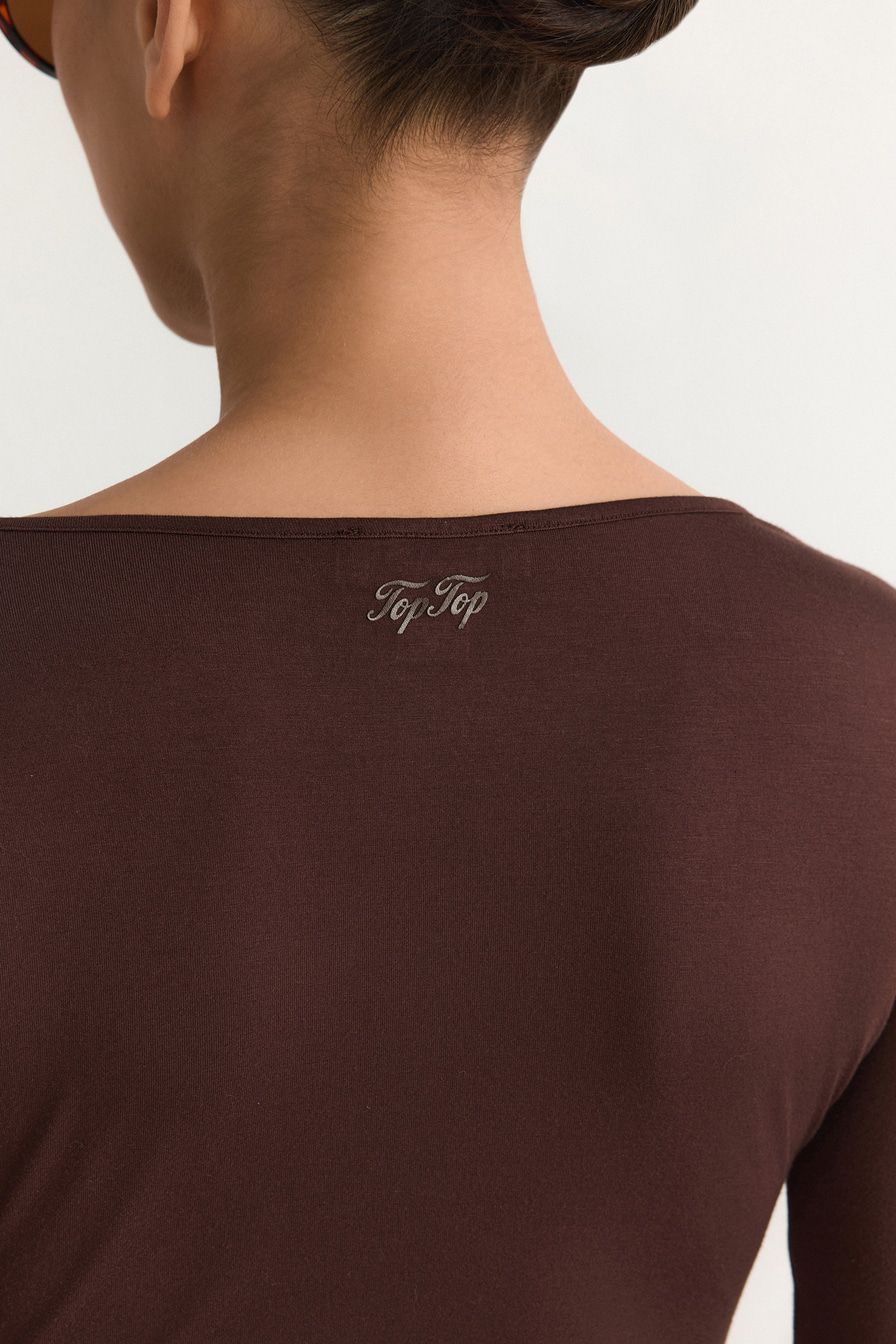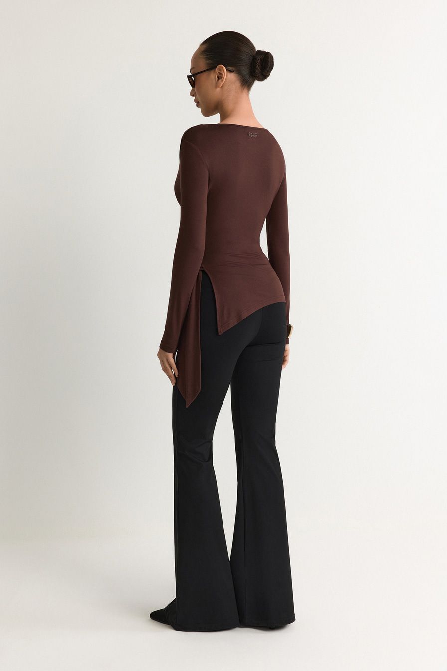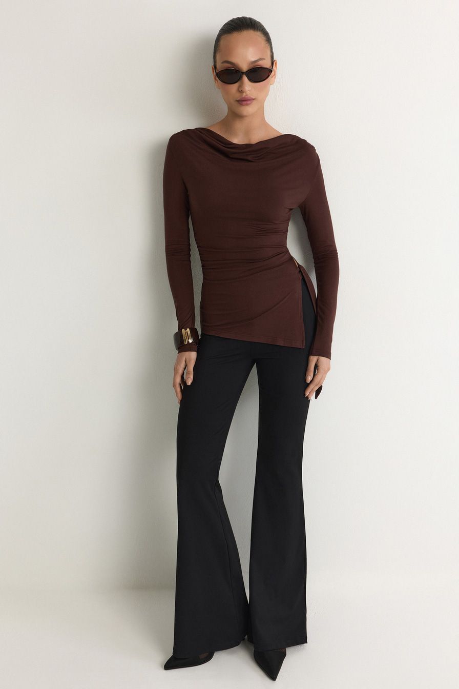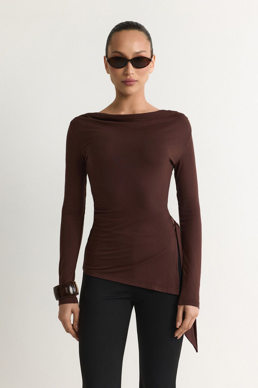 Коричневый лонгслив из смесовой вискозы – модель приталенного кроя с асимметричным низом. Лонгслив декорирован боковым разрезом с завязками.