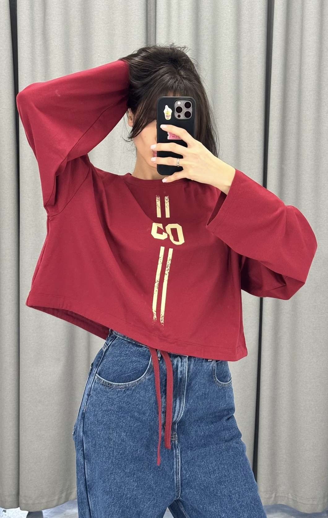 Лонгслив укороченный на кулисе и принтом, который выполнен методом - шелкография.