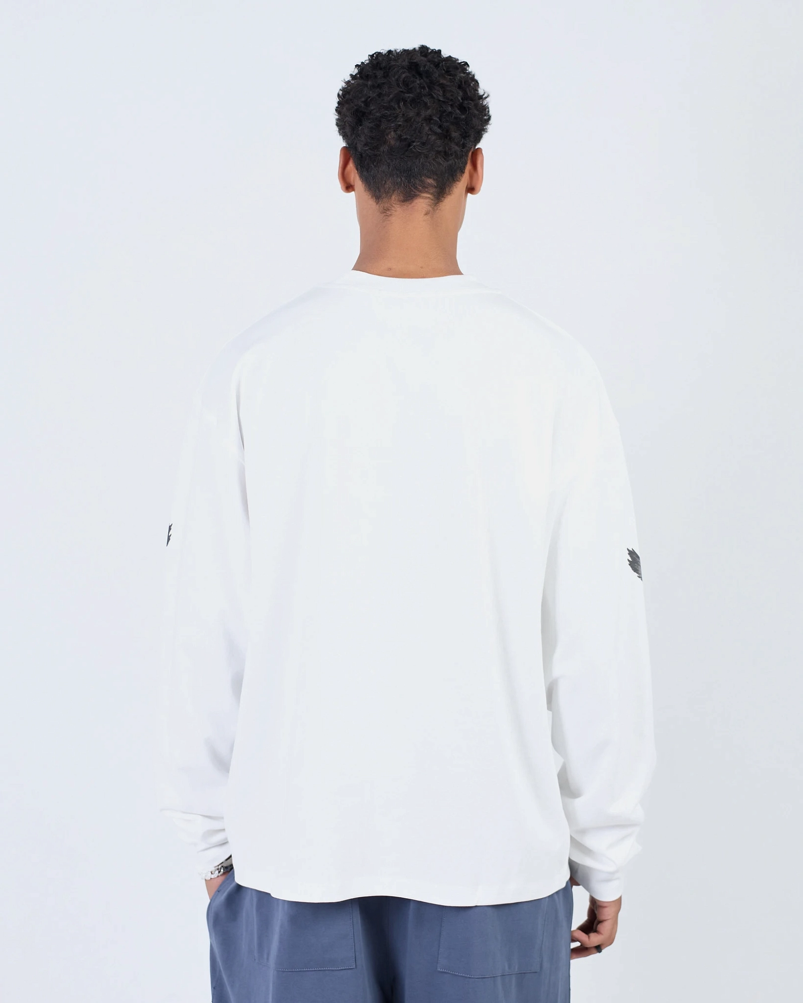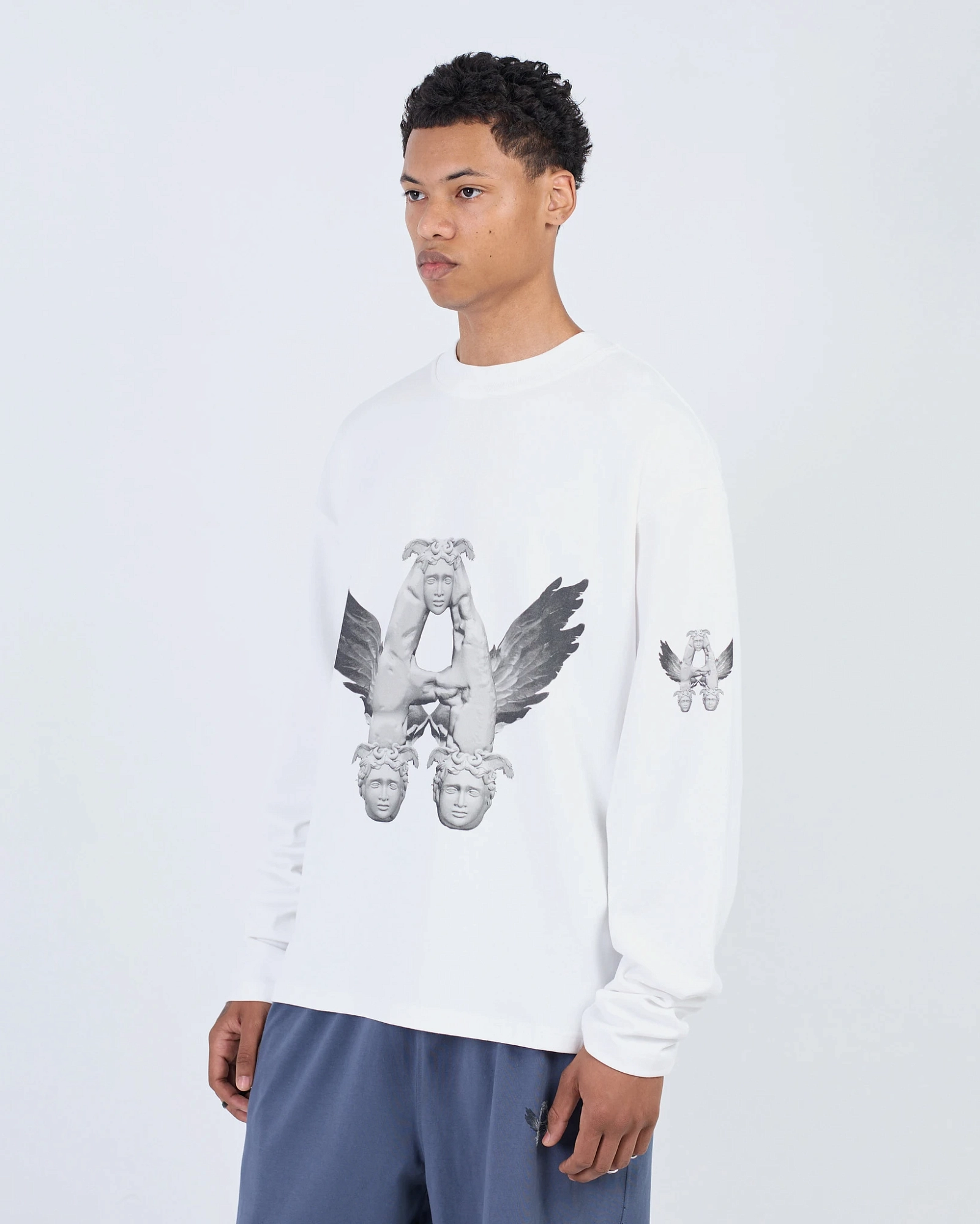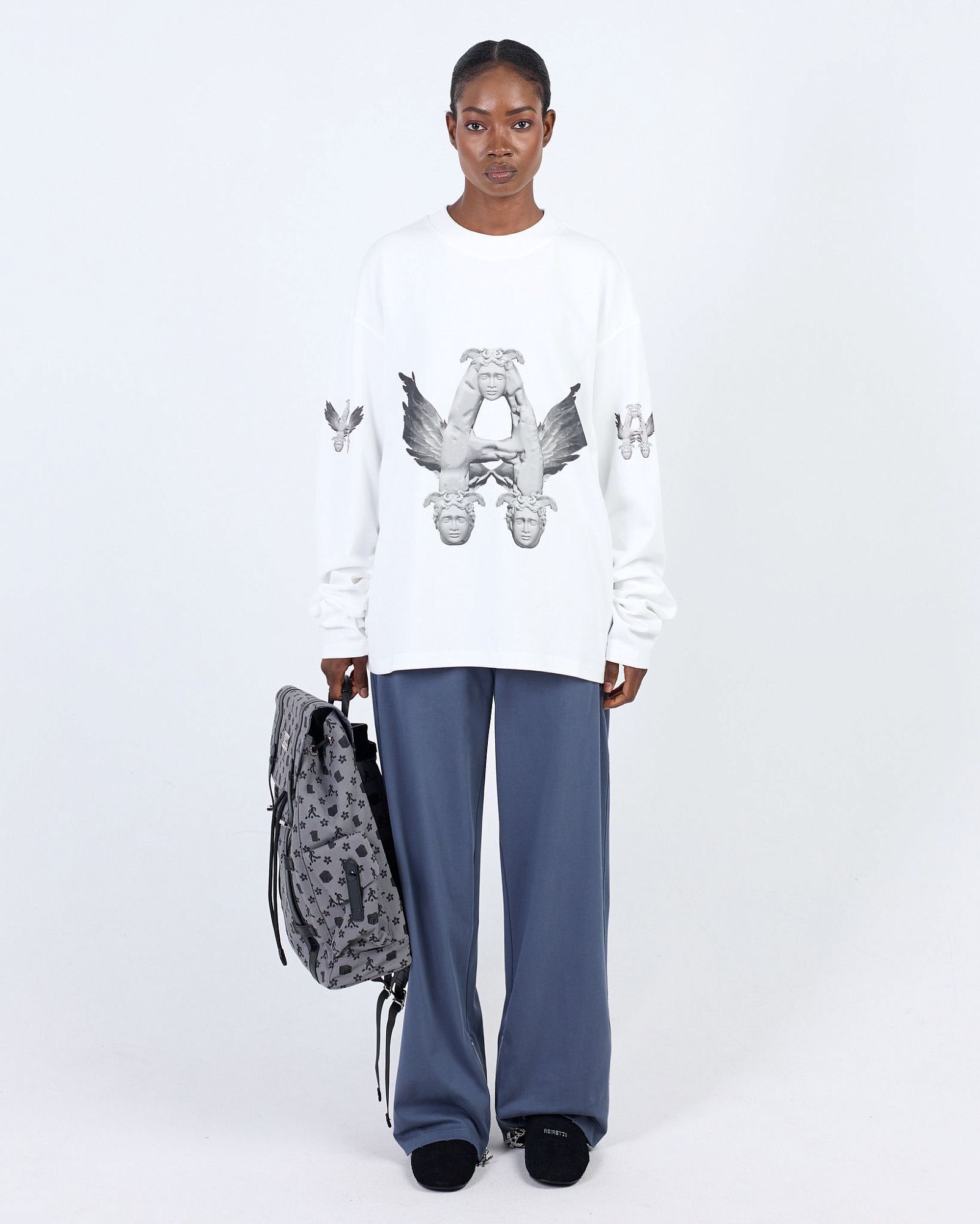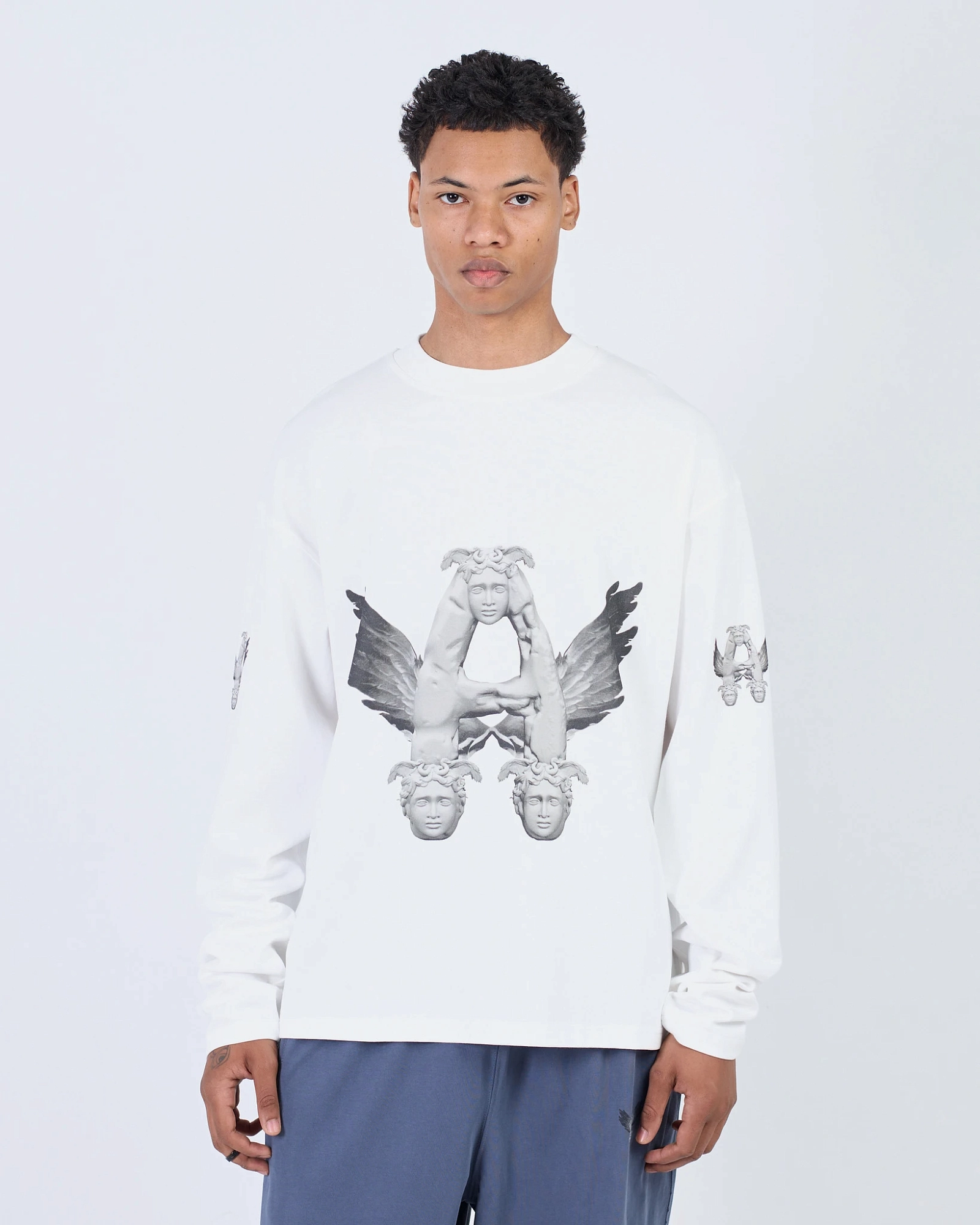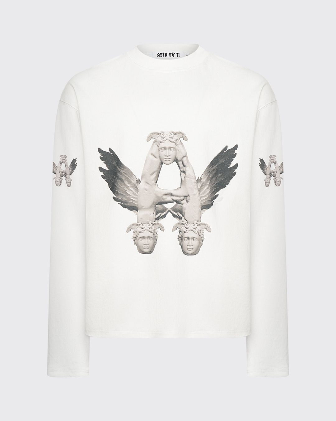 Базовый лонгслив от Asia st 71 с акцентом на минимализм и внимание к деталям. Модель из хлопка в белом цвете свободного кроя дополнена принтом Flying A на груди и рукавах, идеально вписываясь в любой образ. Стилизуйте его как основу в многослойный сочетаниях или носите как самостоятельный элемент гардероба с брюками и джинсами.
