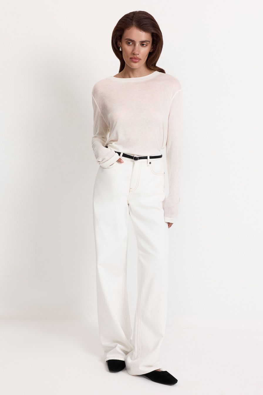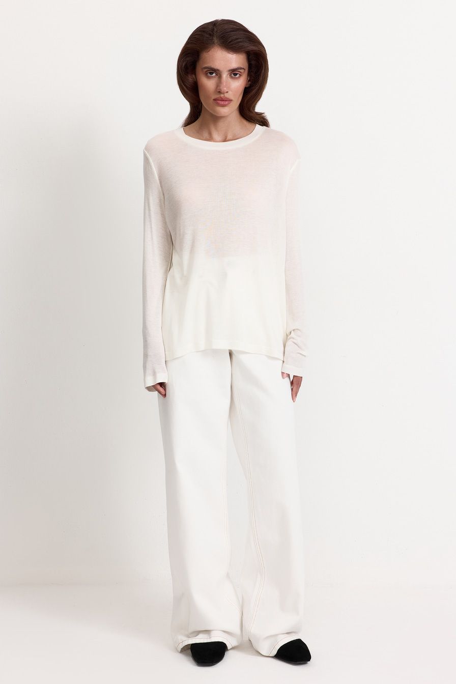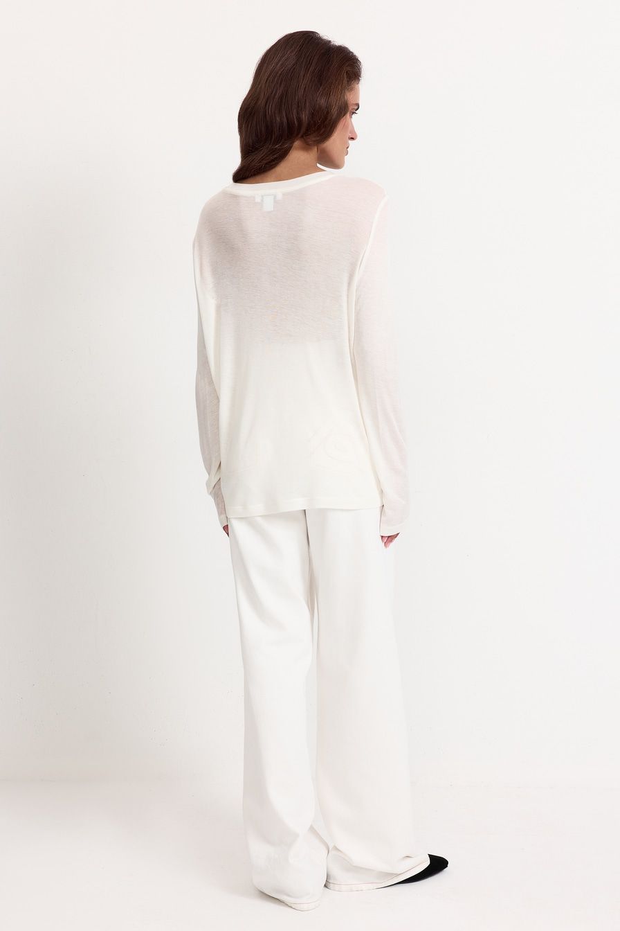 Белый полупрозрачный лонгслив из смесового тенселя с добавлением шелка – модель свободного кроя. Тенсель – материал натурального происхождения из древесины эвкалипта.