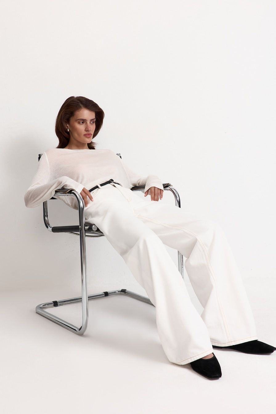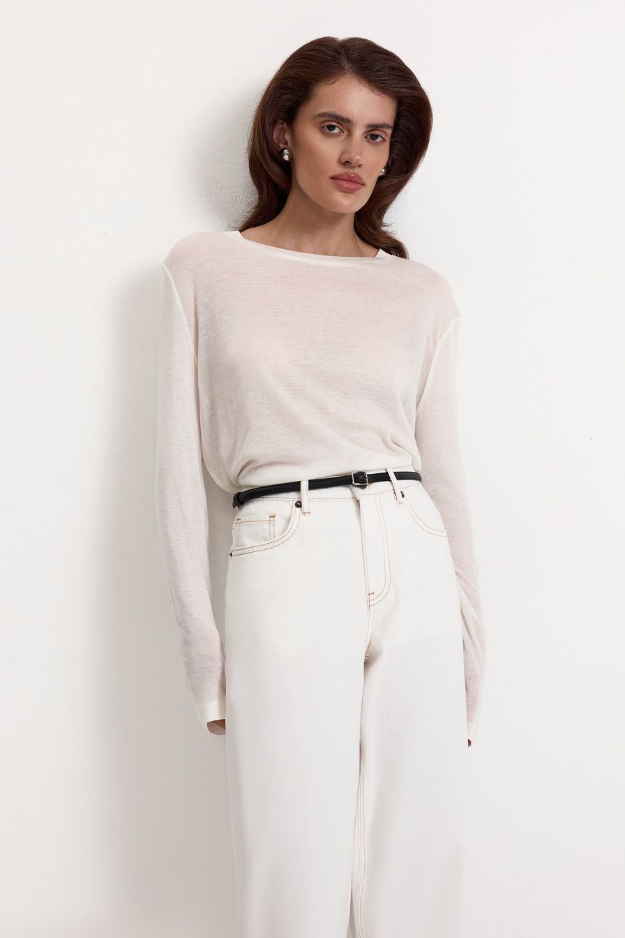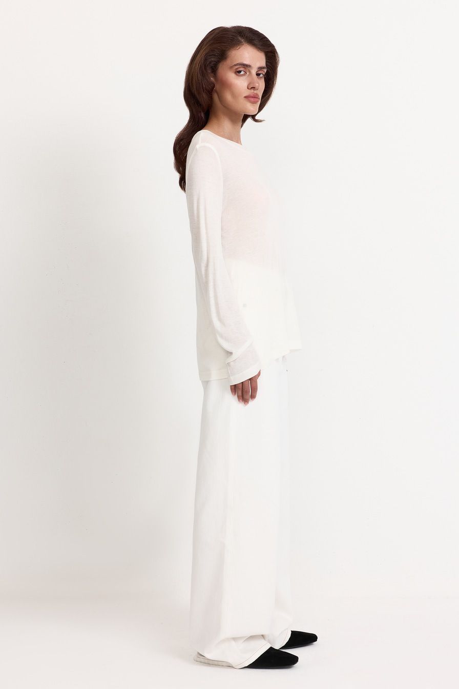 Белый полупрозрачный лонгслив из смесового тенселя с добавлением шелка – модель свободного кроя. Тенсель – материал натурального происхождения из древесины эвкалипта.