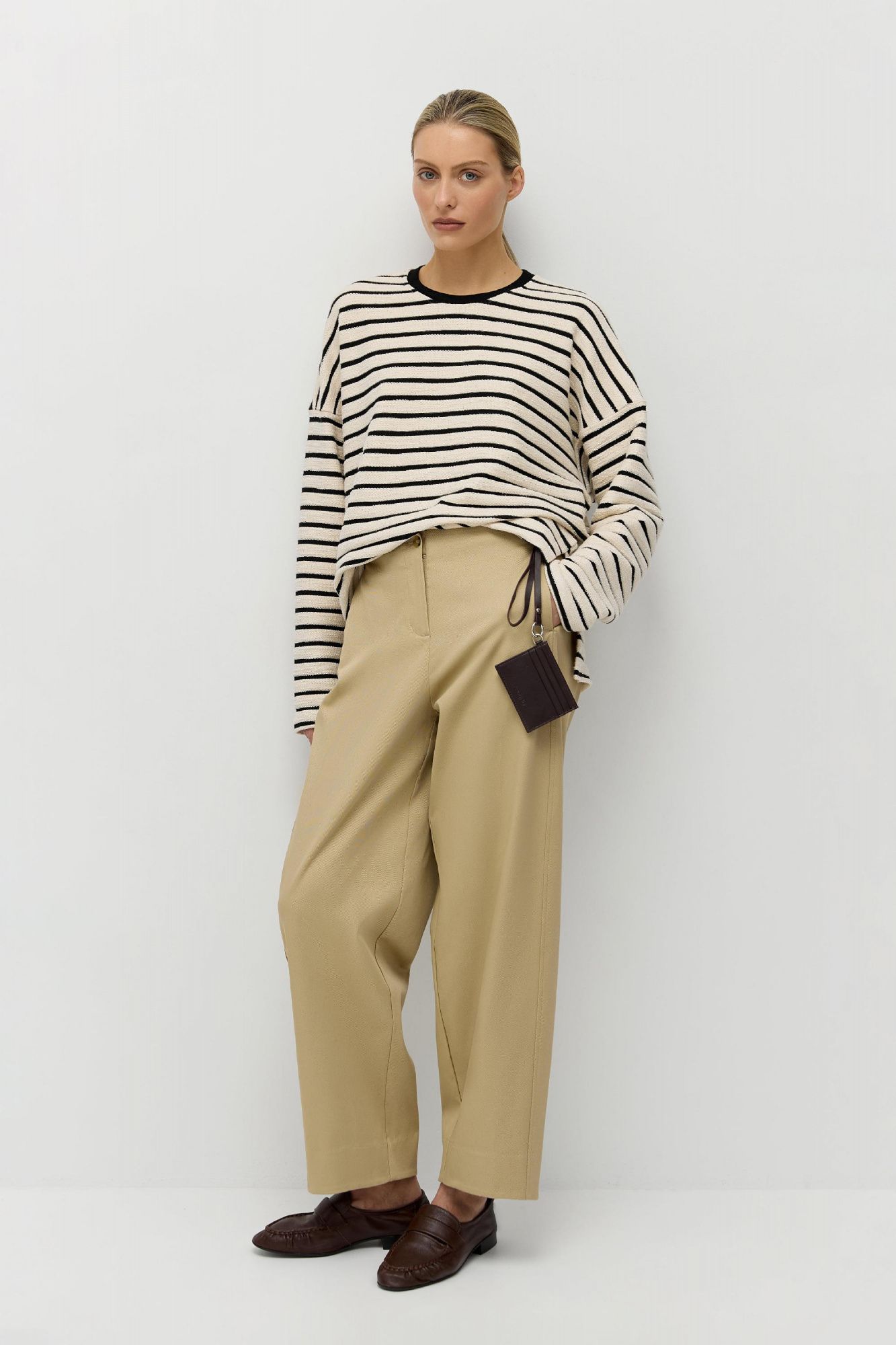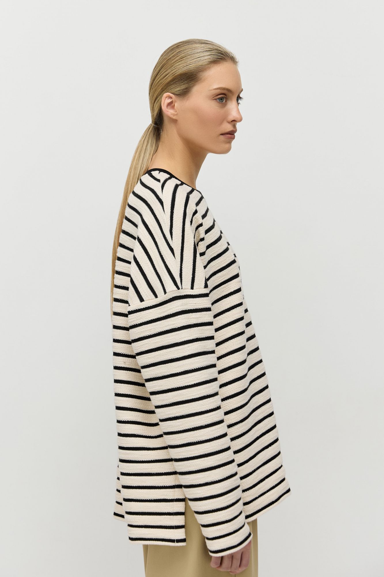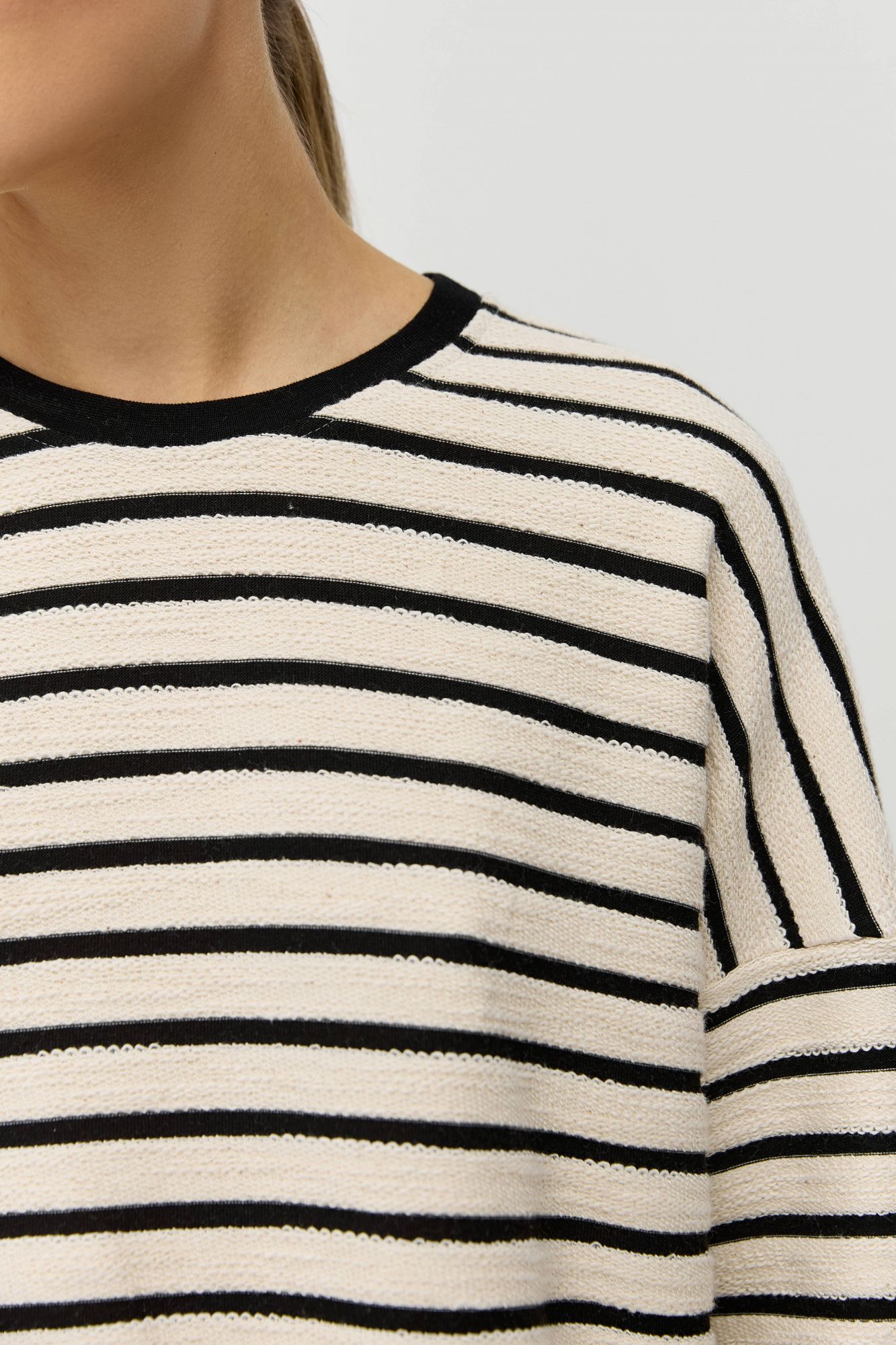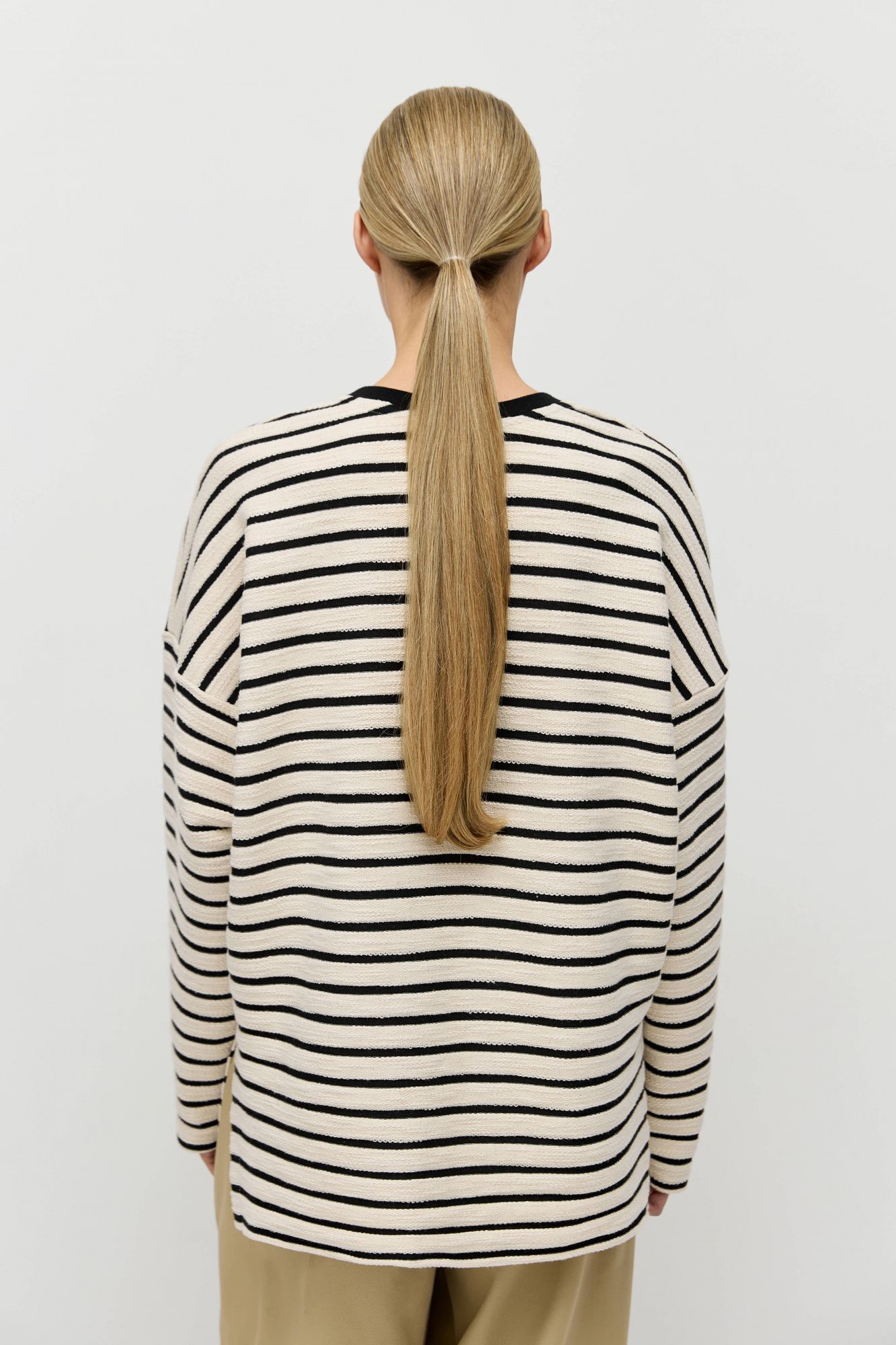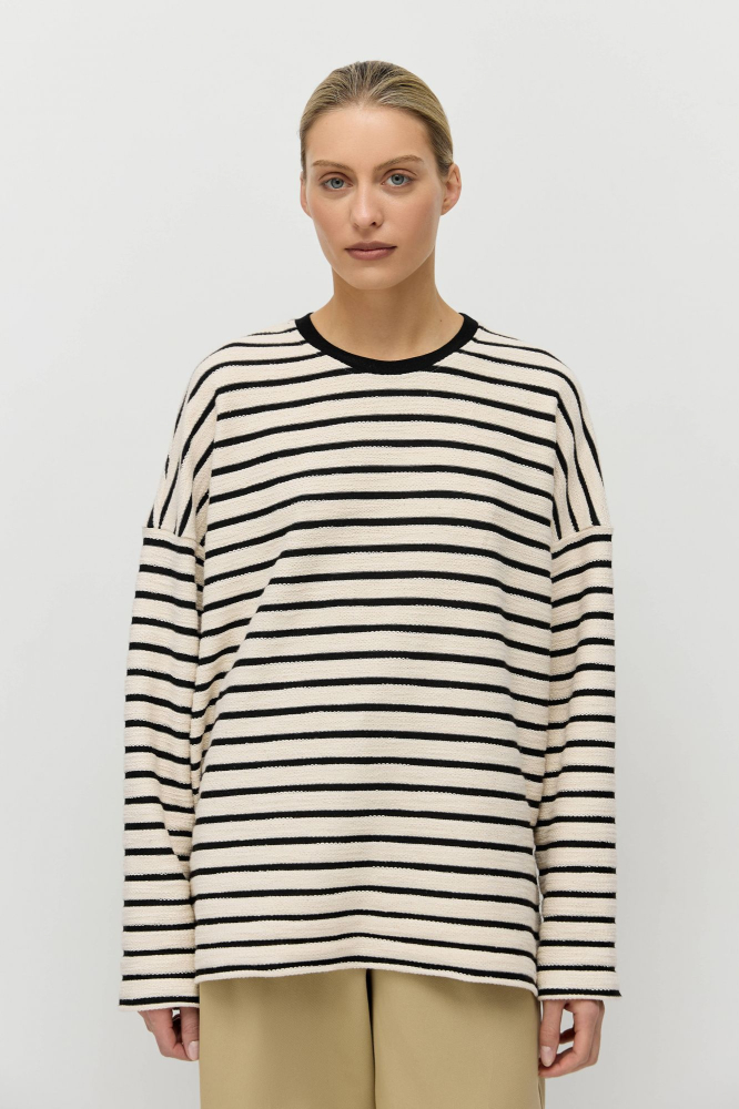 Лонгслив свободного прямого кроя сшит из фактурного натурального хлопка с эффектом махры — нежной и приятной к телу ткани.