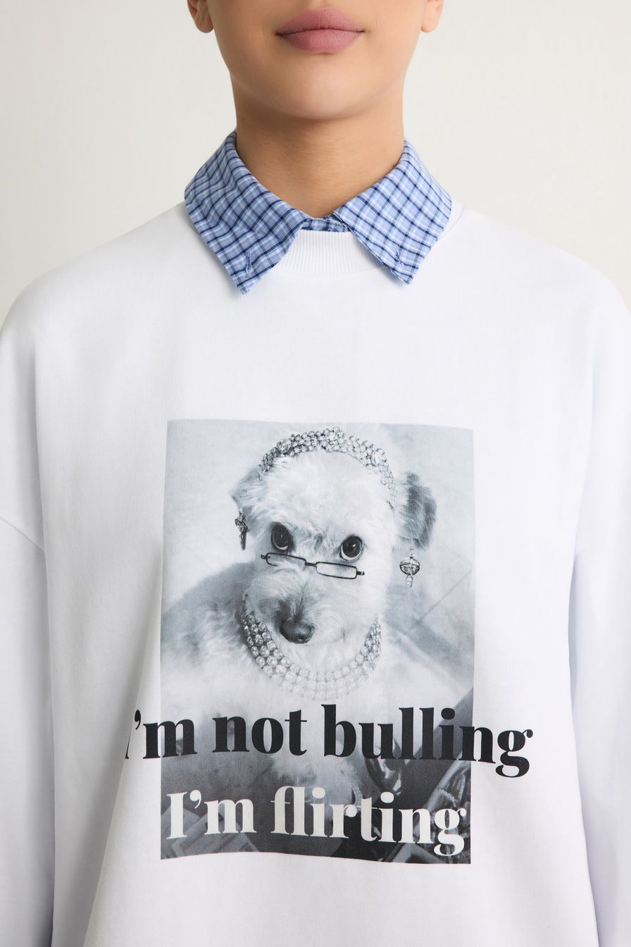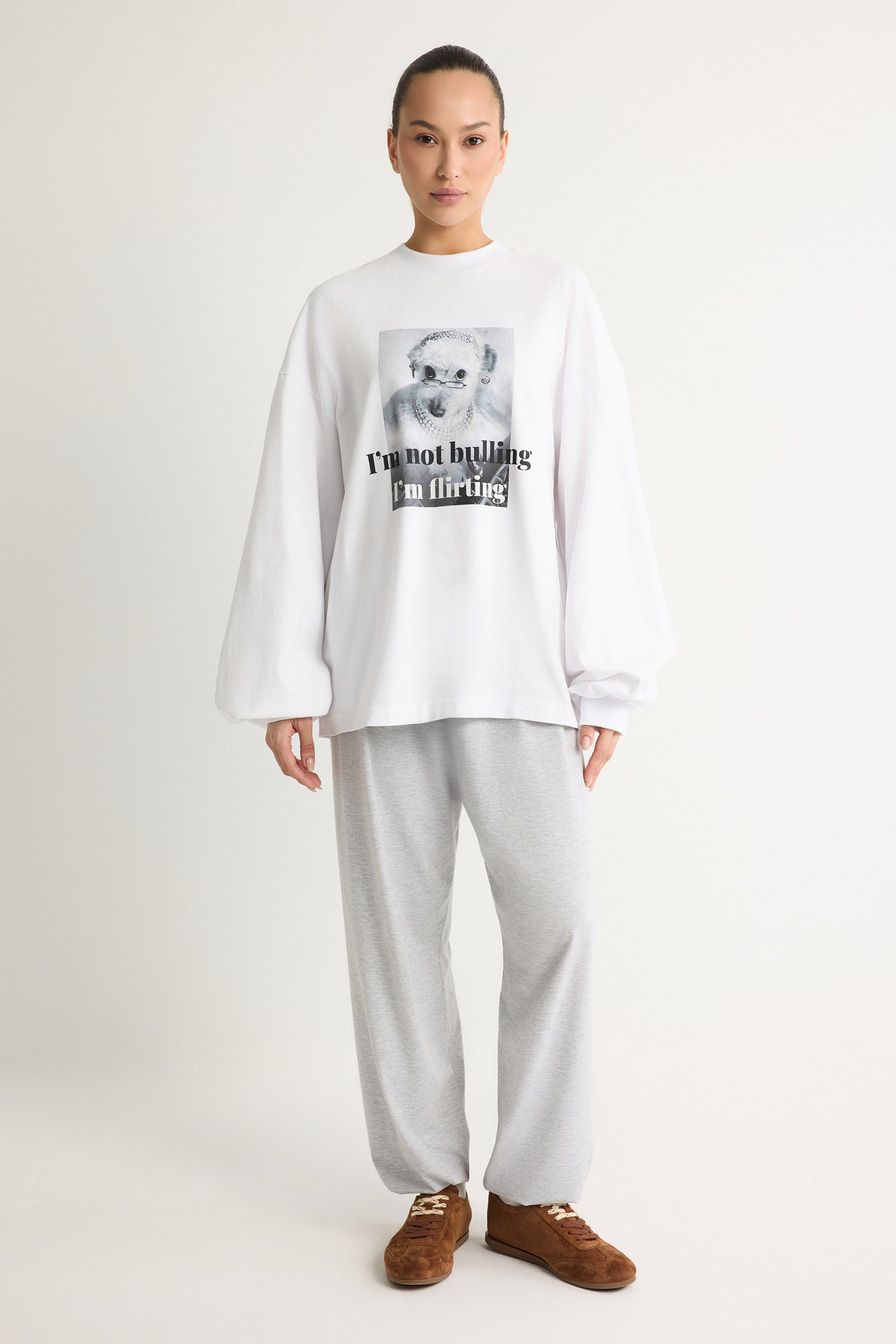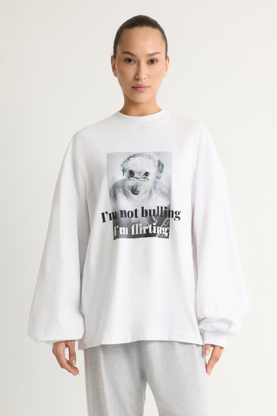 Белый лонгслив из смесового хлопка – модель свободного кроя со спущенной линией плеч. Лонгслив декорирован принтом "Я не издеваюсь, я флиртую" / "I’m not bulling I’m flirting".
