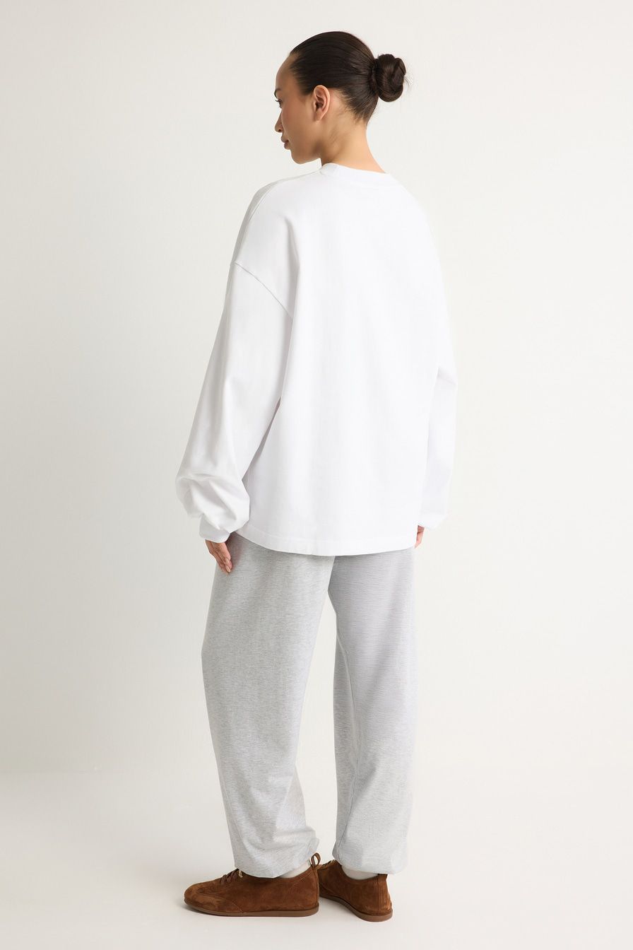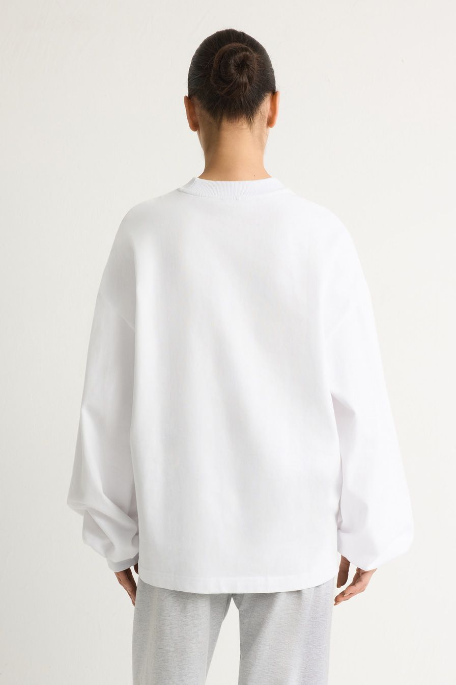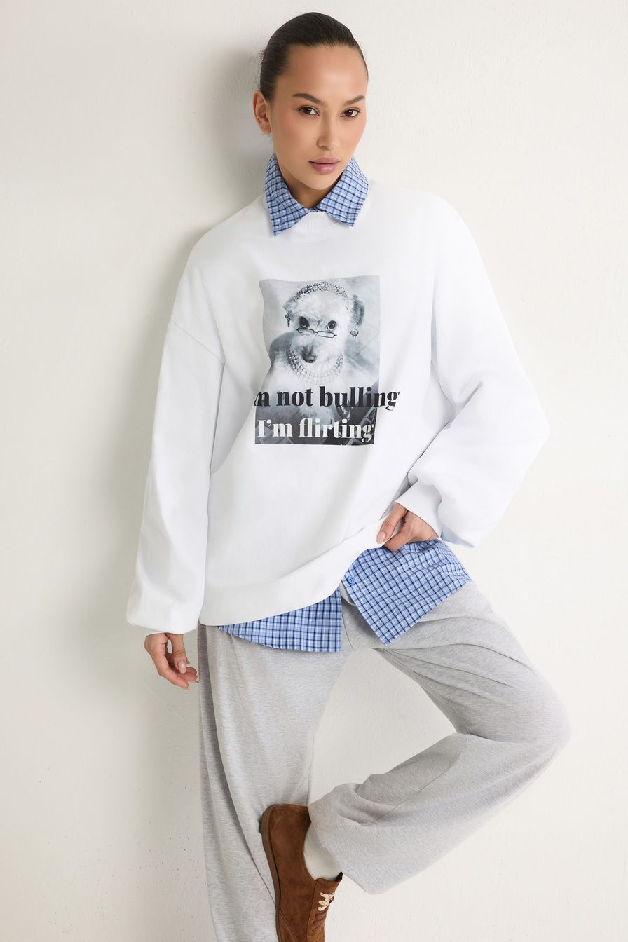 Белый лонгслив из смесового хлопка – модель свободного кроя со спущенной линией плеч. Лонгслив декорирован принтом "Я не издеваюсь, я флиртую" / "I’m not bulling I’m flirting".