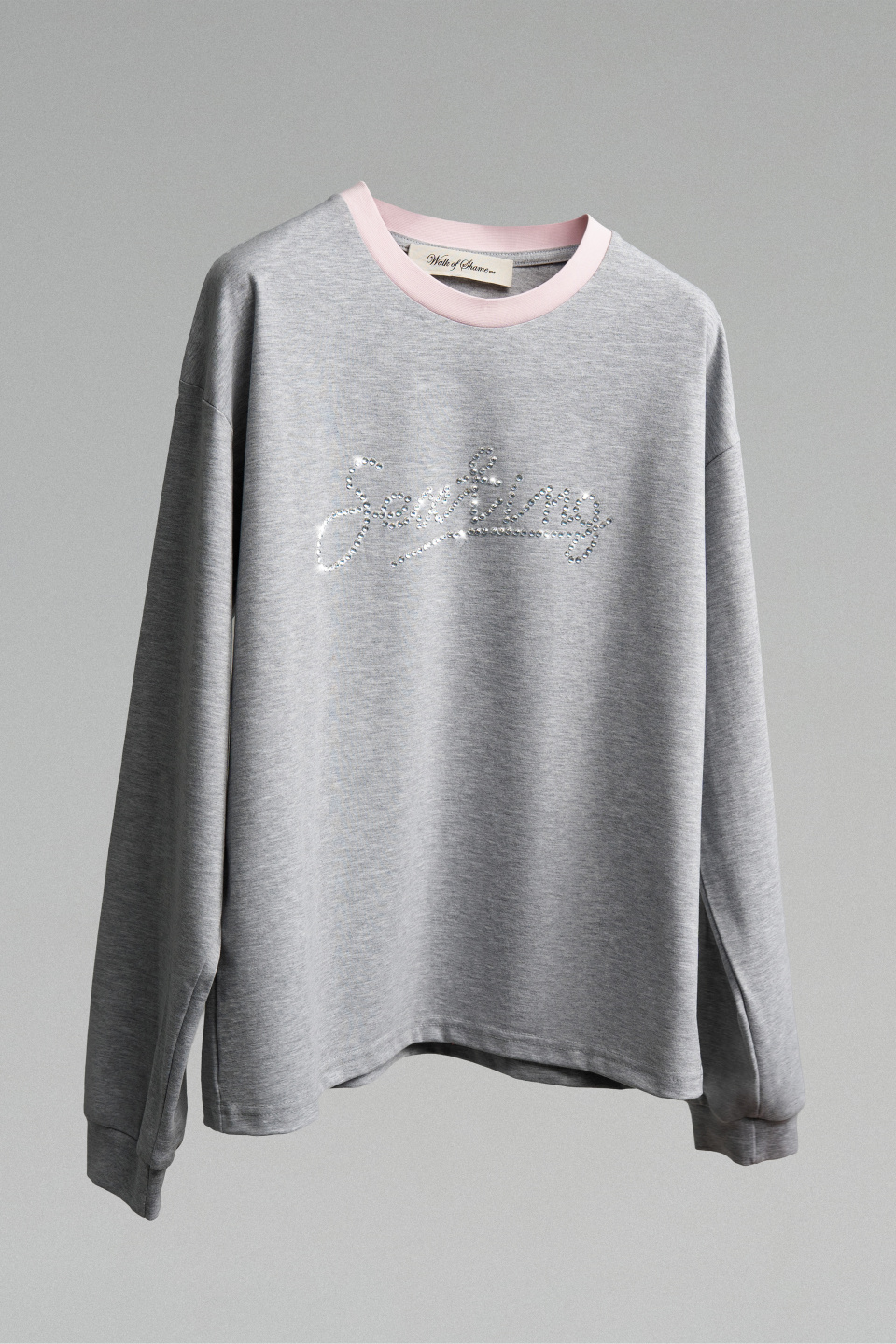 Лонгслив свободного кроя, с круглым вырезом контрастного цвета. Изготовлен из хлопка и украшен надписью, выполненной из страз.