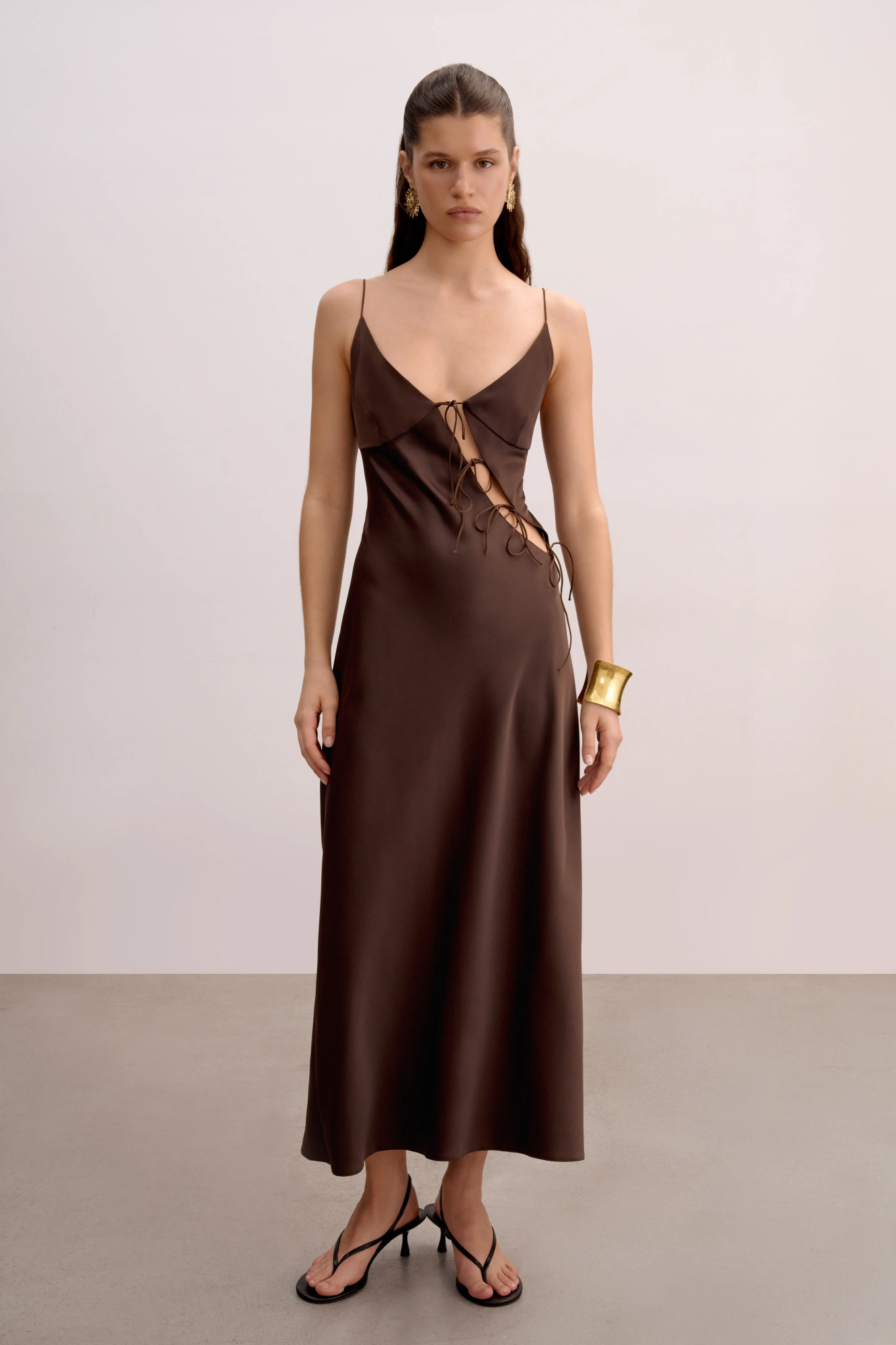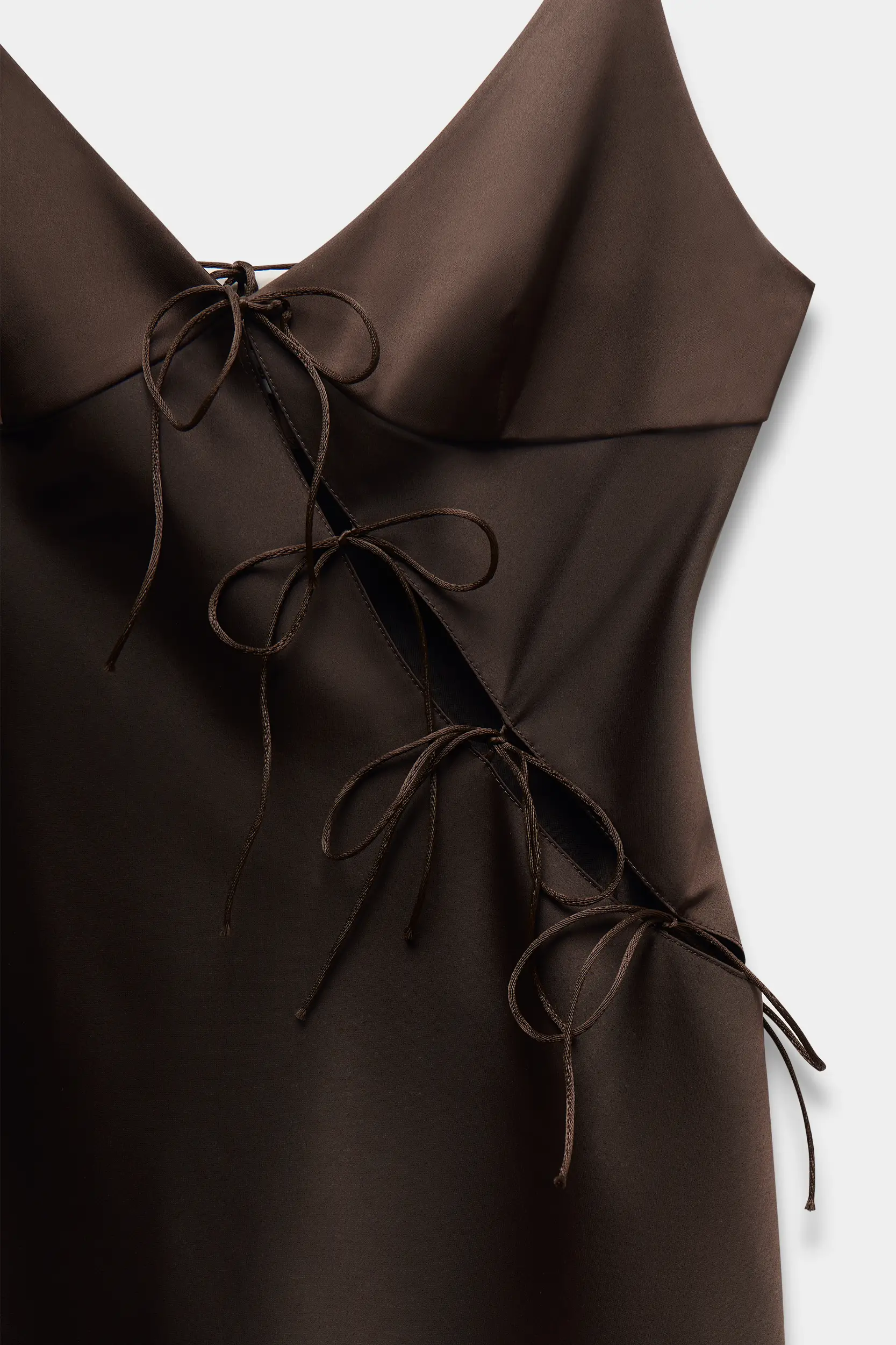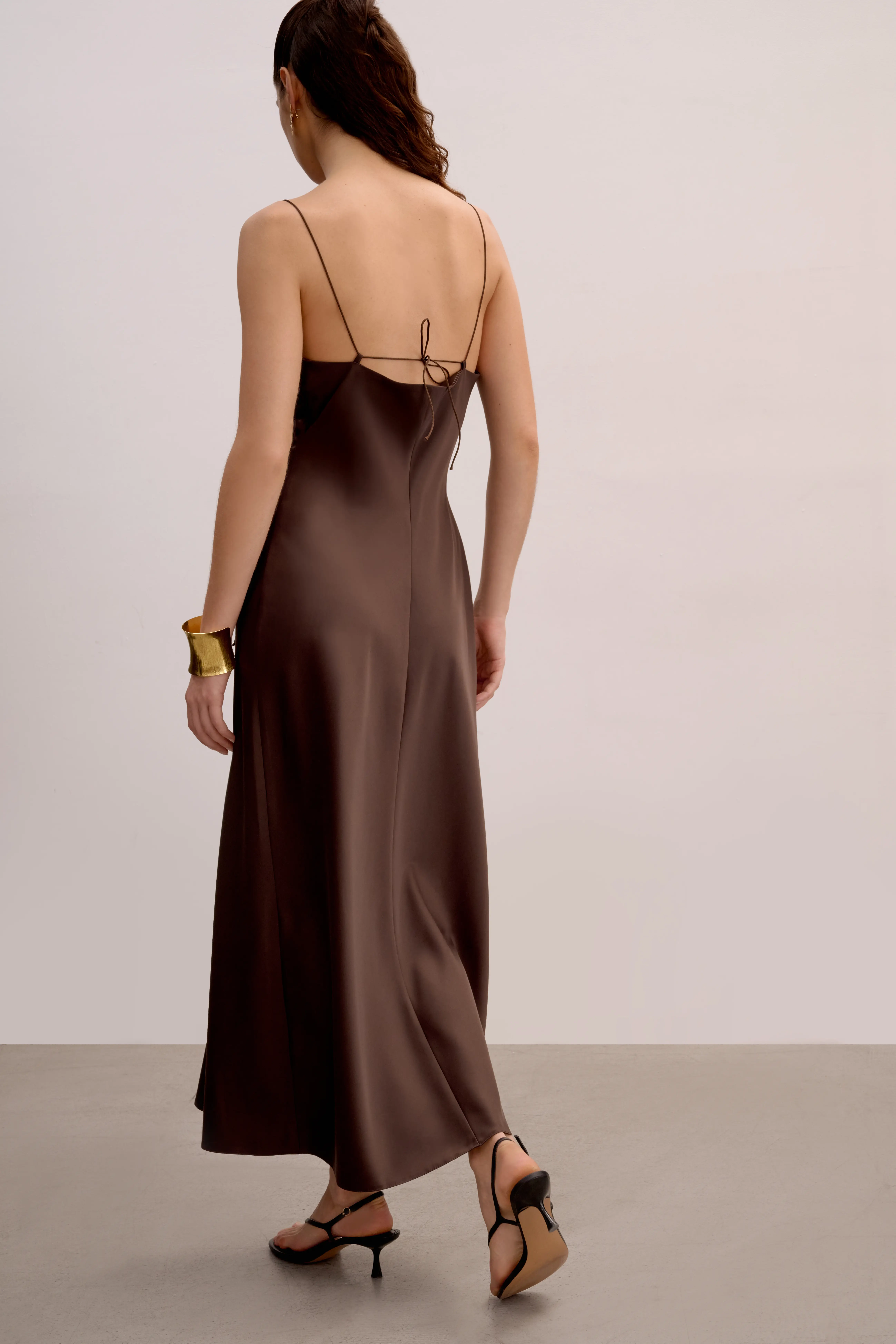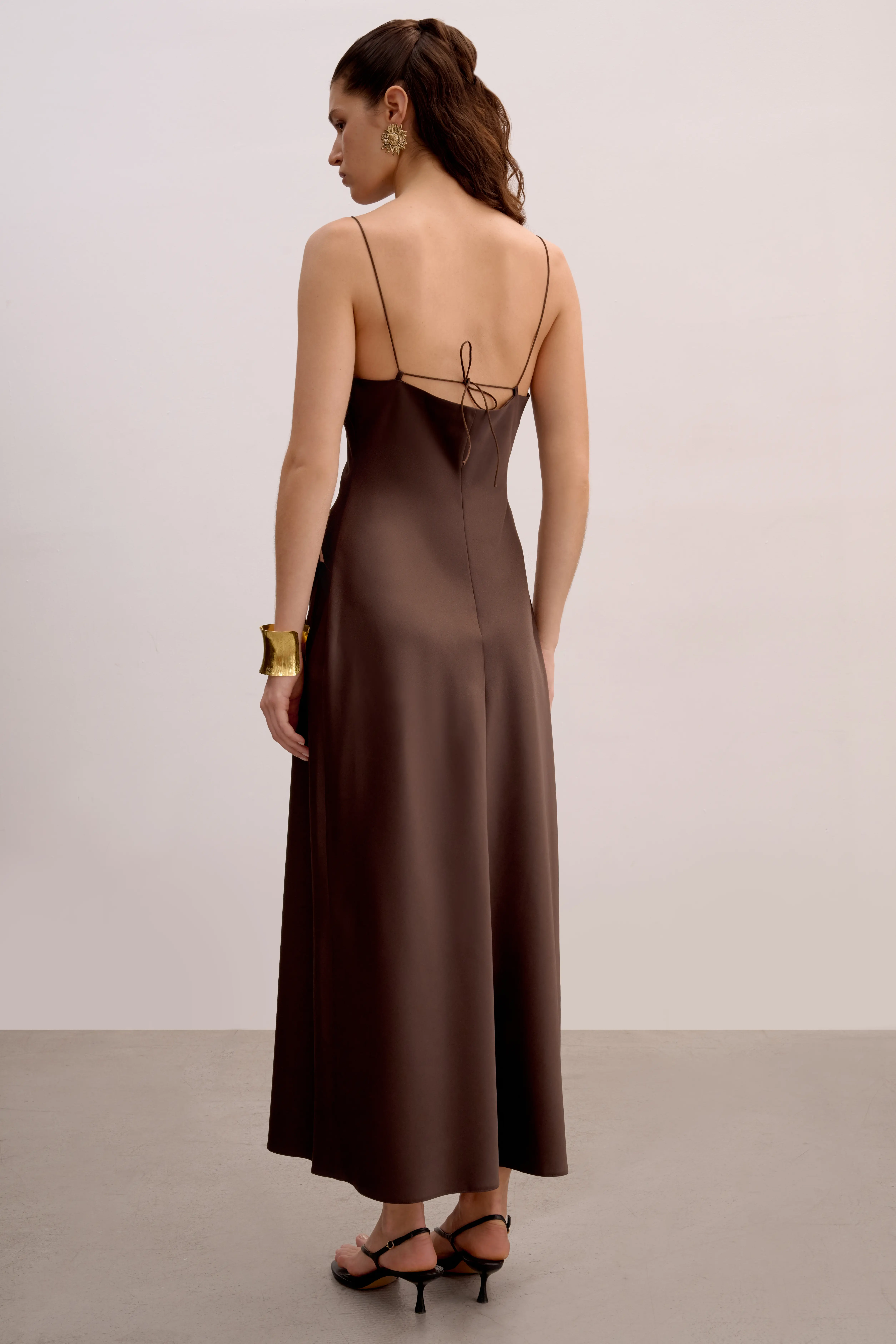 Элегантное платье из сатина тёмно-коричневого цвета с завязками — идеальный выбор для особых случаев. Прекрасно подчёркивает фигуру и придаёт образу изысканность. Комфортный материал и стильный дизайн делают это платье отличным вариантом для вечерних мероприятий и торжеств.